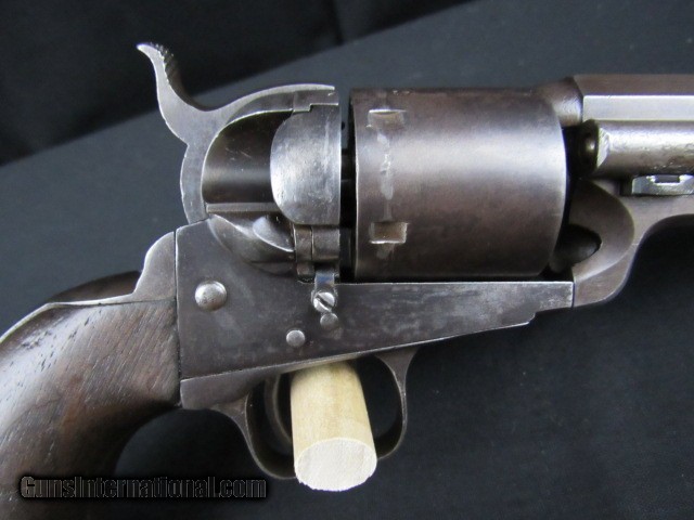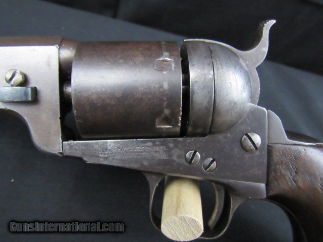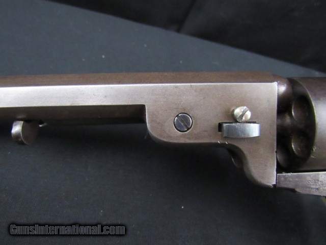 Description: Original Colt 1851 Navy that was converted from 36 caliber percussion to 38 centerfire using the Richards-Mason conversion system. Serial # 59011 was originally made in 1856 and is a "Navy-Navy" as evidenced by the "US" marking under the "COLT PATENT" marking on the left side of the frame, the iron back strap and grip strap, and the "U.S.N." stamping on the bottom of the grip strap. It also has the "J.L.H." marking on the bottom of the grip strap - James L. Henderson inspected the 615 early Navy-Navy revolvers received at the Norfolk Navy Yard. This is the only documented batch of Colt 1851 Navys to go to Norfolk, and not all were converted to centerfire later on, so there aren't many of these available to the collector. Bottom of left grip is marked "E.C.G." for E.C. Grafton, listed as a Navy inspector in 1861. The cylinder shows no traces of the original battle scene and just the last two digits "41" of the original percussion serial #. The rear face of the cylinder has the numbers "011" to match the last 3 digits of the serial # of the revolver after the conversion. The loading gate and arbor have matching assembly # 724. Common of these factory conversions, the wedge is not numbered. Top of the barrel has the "Address Saml Colt New-York City" marking. Of the approximately 6000 conversions ordered from Colt directly by the US Navy, less than 615 will have this combination of markings. Left side of the frame has the correct 2-line patent markings put on the conversions by the Colt factory. Overall condition is an even patina with some plum remaining on the frame. Original walnut grips have never been refinished or sanded, do show typical wear and usage and some loss at the corners. Bore in the 7.5" octagon barrel is good with strong rifling and typical scattered black powder pitting. Action is very strong and tight. Cylinder has no movement and indexes perfectly every time. Barrel/frame junction has slight play due to looseness from being taken apart for 160+ years. All original except for the replacement ejector housing screw. A very rare 1851 Navy-Navy Colt conversion that you'll definitely want to add to your collection. 315.251.4799 with questions or concerns. Antique so it can ship directly to you assuming your local laws allow it. Must provide copy of valid driver's license. No international sales. Ships by USPS Priority Mail with tracking and insurance for an additional $35. Payment by bank check, money order, or discreet PayPal only. Buyer pays return shipping. Thanks for looking and please check my other listings. Always interested in single pieces or collections of Winchester, Marlin, Savage, Remington, Colt and other Old West / Civil War firearms, as well as old ammo and coins, books on the Old West and firearms. Now on the- visit cnycollectibles. Layaway available !! SOLD Antique: Yes Manufacturer: Colt Model: 1851 Navy Serial Number: 59011 Caliber Info: 38 Center Fire Condition: Good Barrels: 7.5" Octagon Manufacture Date: 1856 Item Location: United States |