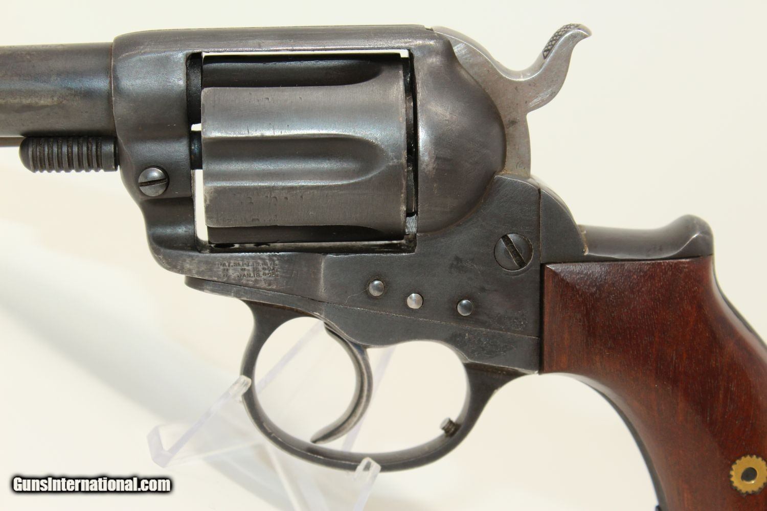 Description: VERY NEAT Antique COLT 1877 Conversion Revolver Double Action Colt .22 Conversion Made in 1883 Here we present an antique Colt Model 1877 Double Action Lightning Revolver, made in 1883 in Hartford, Connecticut, Originally in .38 Colt and converted to .22 rimfire sometime thereafter. The Model 1877 was Colt’s first venture into double action revolvers. It was quite successful, selling 166,849 from 1877 through 1909. Nonetheless, there was some hesitation to move away from the single action mechanism, which had so proven itself. Famous adopters of the Lightning were William “Billy the Kid” Bonney and John Wesley Hardin, along with “Doc” Holliday. Doc’s weapon of choice early in his western career was an 1851 Colt Navy revolver. Later, Doc carried a nickel-plated .41 caliber Colt Thunderer or the .38 caliber Colt Lightning. This .22 conversion from .38 entailed sleeving both thebarrel and the cylinder chambers. The hammer has been modified with a rimfire firing pin. The ejector housing has been modified for the caliber. The grip frame has vertical serrations added. The front sight has been modified for the caliber. Most of the original markings were retained. The whole gun has been re-blued and walnut grips added as well. It functions well! The overall condition is very good or better. The blue finish is 98%. The markings are clear. The numbers match. The grips are in great shape. The bore is bright with sharp rifling. The action is excellent. Here is something that you won’t find anywhere else! Own the original! This is a legitimate antique and not a reproduction. Barrel is 3-1/2 inches. Caliber: .22 Rimfire Overall condition as seen in photos. Very Fast. Very Safe. FREE SHIPPING WORLDWIDE. Delivered directly to your door by express mail! Guaranteed AUTHENTIC & Includes CERTIFICATE OF AUTHENTICITY. ancestryguns $1500 #190059 SOLD Antique: Yes |