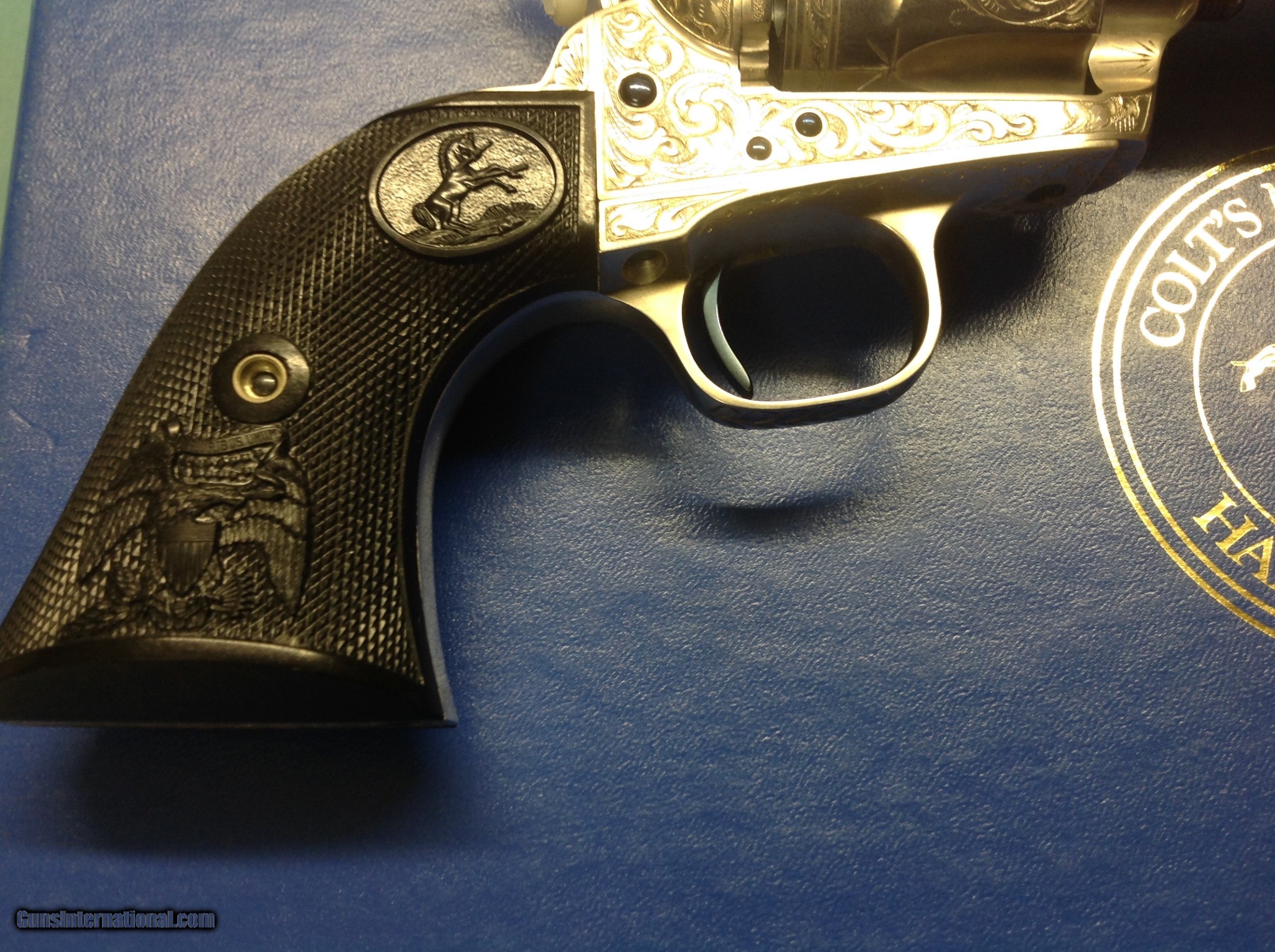 Description: We are proud to offer this stunning artwork appearing as a Colt Single Action Army Engraved and signed by master engraver John Adams, she was then plated in real silver. The screws, ejector head and base pin are finished in Fire Blue. John Adams started working for Harrington and Richardson and then engraved for Colt for years. He has engraved for many celebrities. His work is magnificent and is highly prized. This Colt is unfired, unturned. The original box, lock and paperwork are included. To make this Colt more interesting, it is built on a black powder frame. A diagonal screw retains the base pin, an early bullseye ejector handle pushes out the empties and the early three line patent dates are on the frame. Overall, this is the kind of heirloom Colt that can top a collection and will only increase in value. This gun , if engraved in the factory by this same engraver, would be over $7000.00 for just the engraving. Adams used to do this engraving in the factory. This one ,I believe, he did at home. It is Mint condition, NIB AND PRICED AT. 4995.00 , Couple bonuses ,the gun and the fire blueing . Contrary to my photos, this Colt is real silver plated and shines brighter than Nickel. I'm sorry that it appears almost Gold, I took dozens of pics but my camera and lighting just couldn't get the silver. There is absolutely NO tarnish or loss of bright silver color. Time will soon tell if all Americans are to be free or all to be slaves to a small country called Washington SOLD Manufacturer: Colt Model: 1873 SAA Serial Number: S37344A Barrel Length: 5 1/2 Condition: As new Finish: Silver Manufacture Date: ? Engraving: Adams