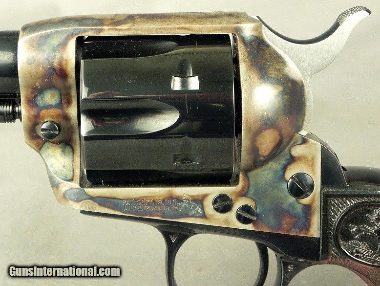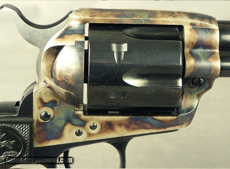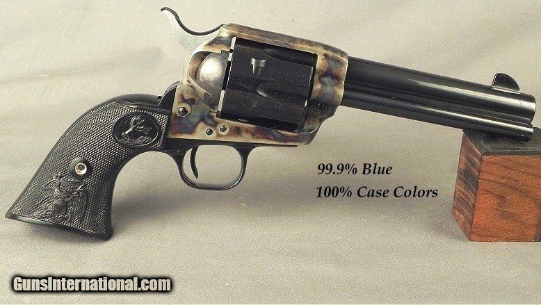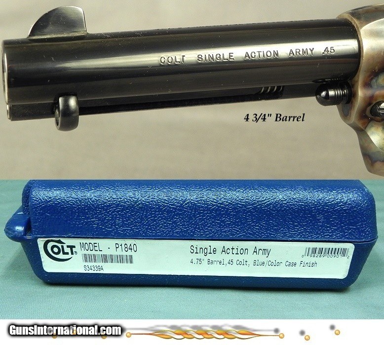 Description: #S34339A, Colt Single Action Army .45 Colt, It Remains Unfired and with the case, 3rd Generation (Some call this one a 4th Generation), Made in 2003, 4 3/4" Barrel; The barrel, cylinder and backstrap retains 99.9% blue, It has 100% case colors, It obviously was never used or fired, Original Black Eagle grips, It comes with the blue plastic case that includes the paperwork. This SAA is # S34339A and about # S34000A Colt reintroduced the full length cylinder bushing which had been eliminated in 1976. This piece was made in 2003. SOLD Handgun Caliber: .45 Colt |