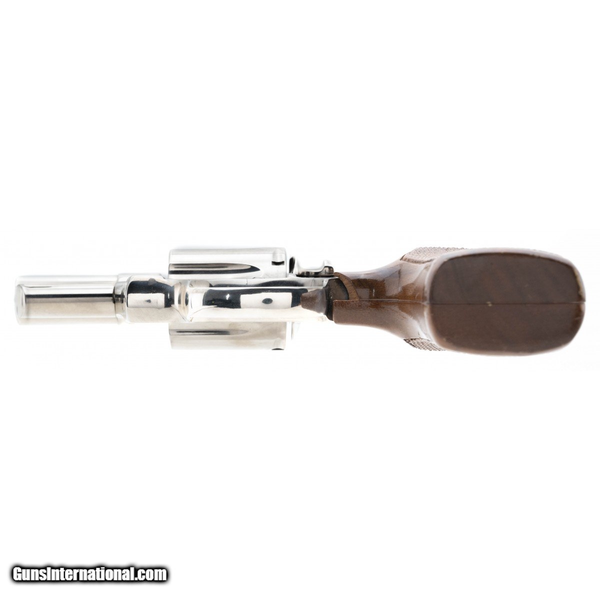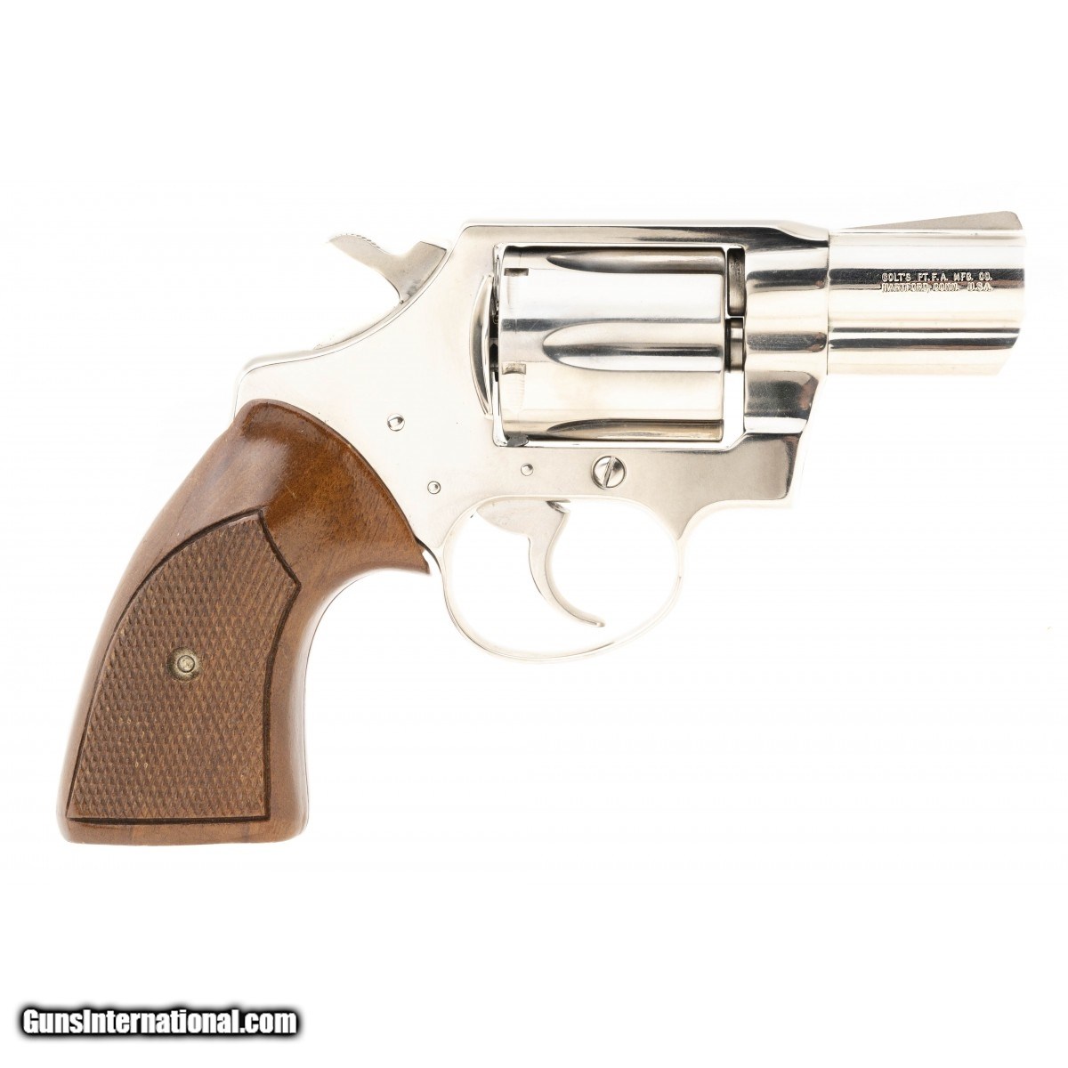 Nickel plated snub nose Colt with 2"" barrel and made in 1974. The grip is chipped, otherwise excellent condition,