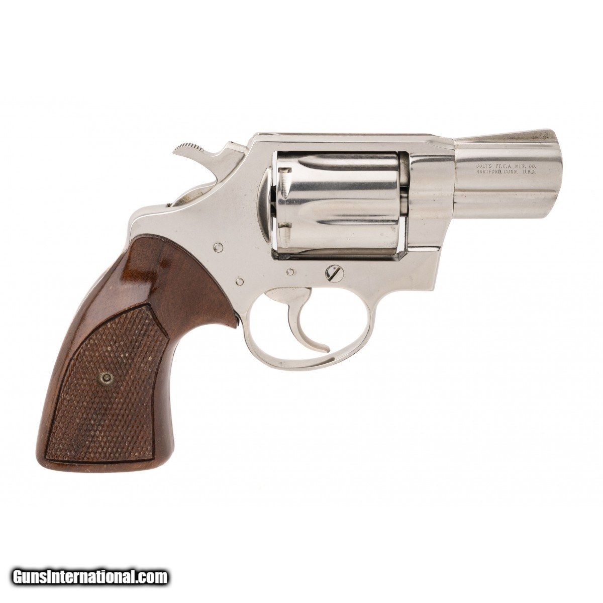 SN: F02381. Made in 1973. .38 Special with a 2"" snub nose barrel. Bore is in very good condition. Snub nose Colt double action revolver. Nickeled finish is in very good condition with light wear. Wood grips are in very good condition with light wear. Overall condition is very good. (Consignment)