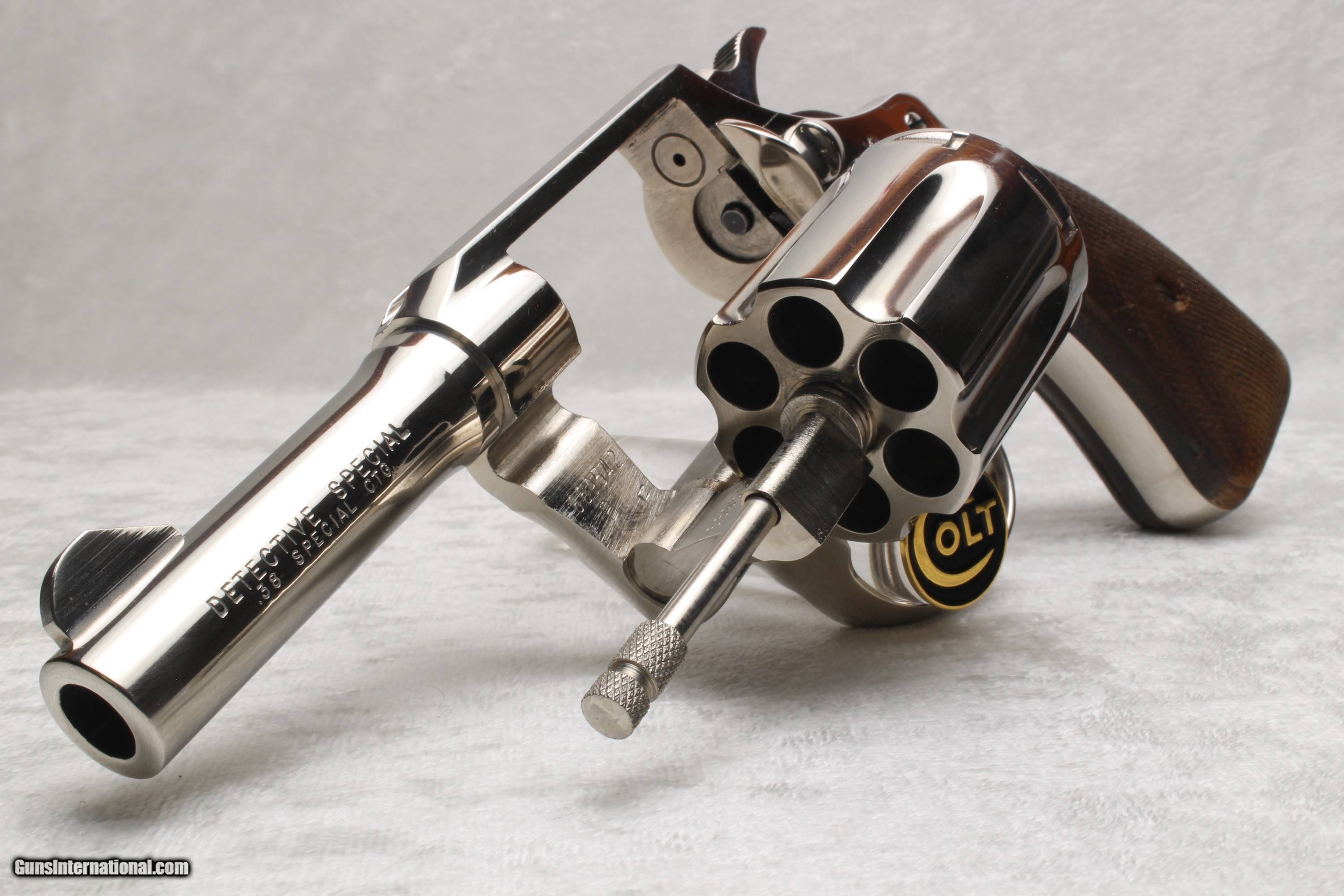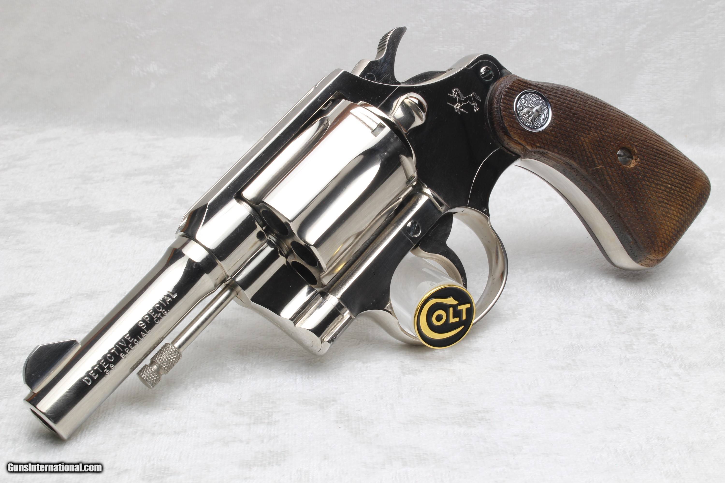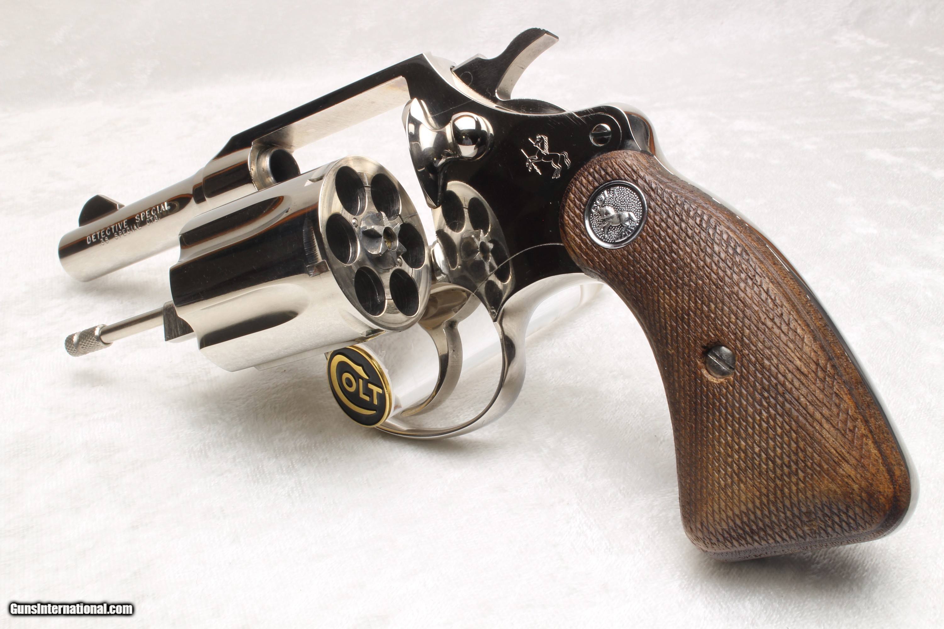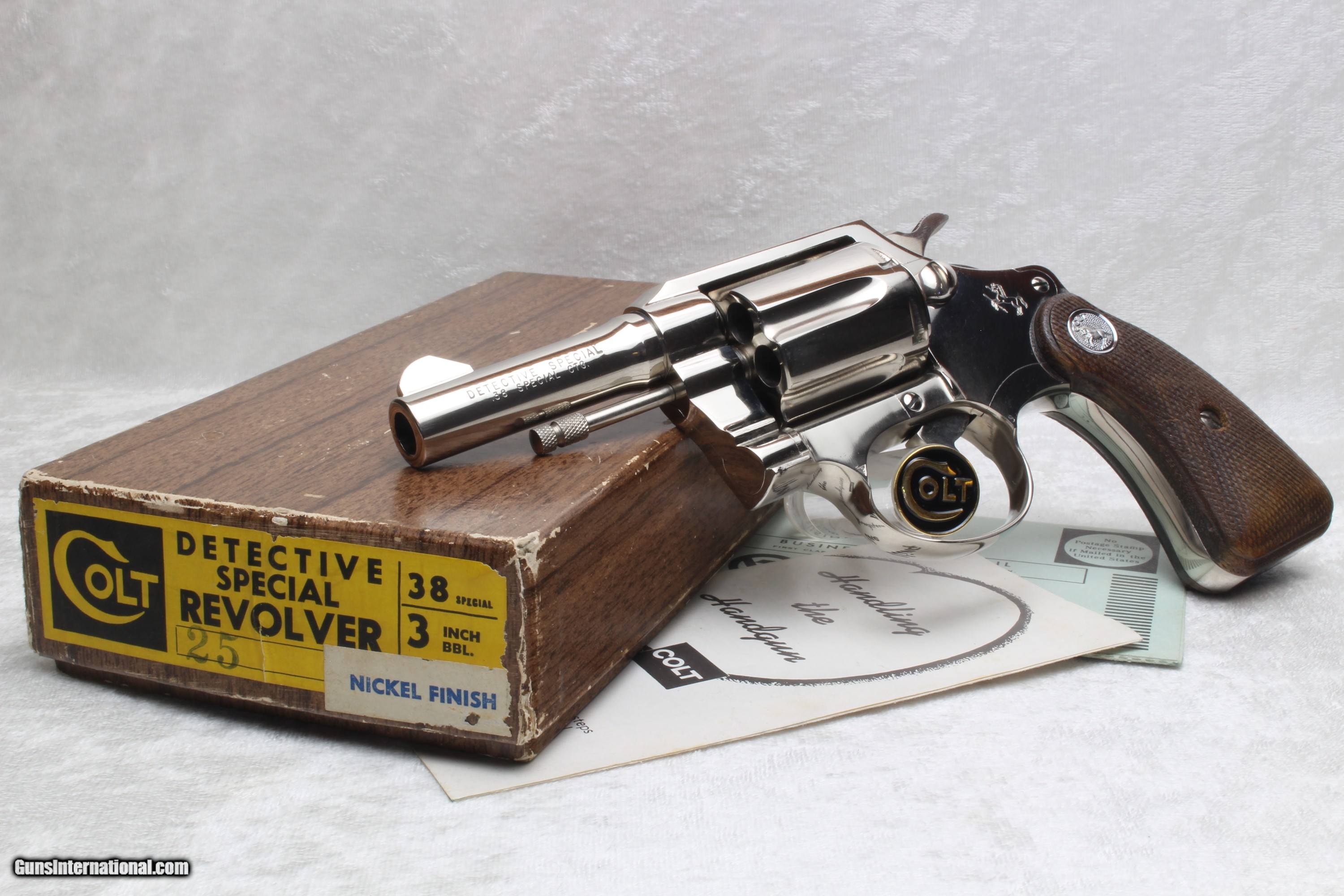 Description: Very scarce factory nickel 3" Colt Detective Special with serial number matching original box dating production to 1965. This revolver remains in very high condition with no detractions. The original nickel finish still retains a beautiful shine over the entire frame. Overall the finish rates 98%. The cylinder face, recoil shield, and forcing cone are very clean with only a very faint turn line on the cylinder itself. The action is crisp with tight lock up, and the bore is clean with strong lands/grooves. The factory walnut grips show some some light wear, but are serial number matched to the gun. Original "Handling the Hangun" brochure and warranty registration card included in the box. SOLD Curio/Relic: Yes Handgun Caliber: .38 Special Manufacturer: Colt Model: Detective Special Condition: Excellent Item Location: Arizona |