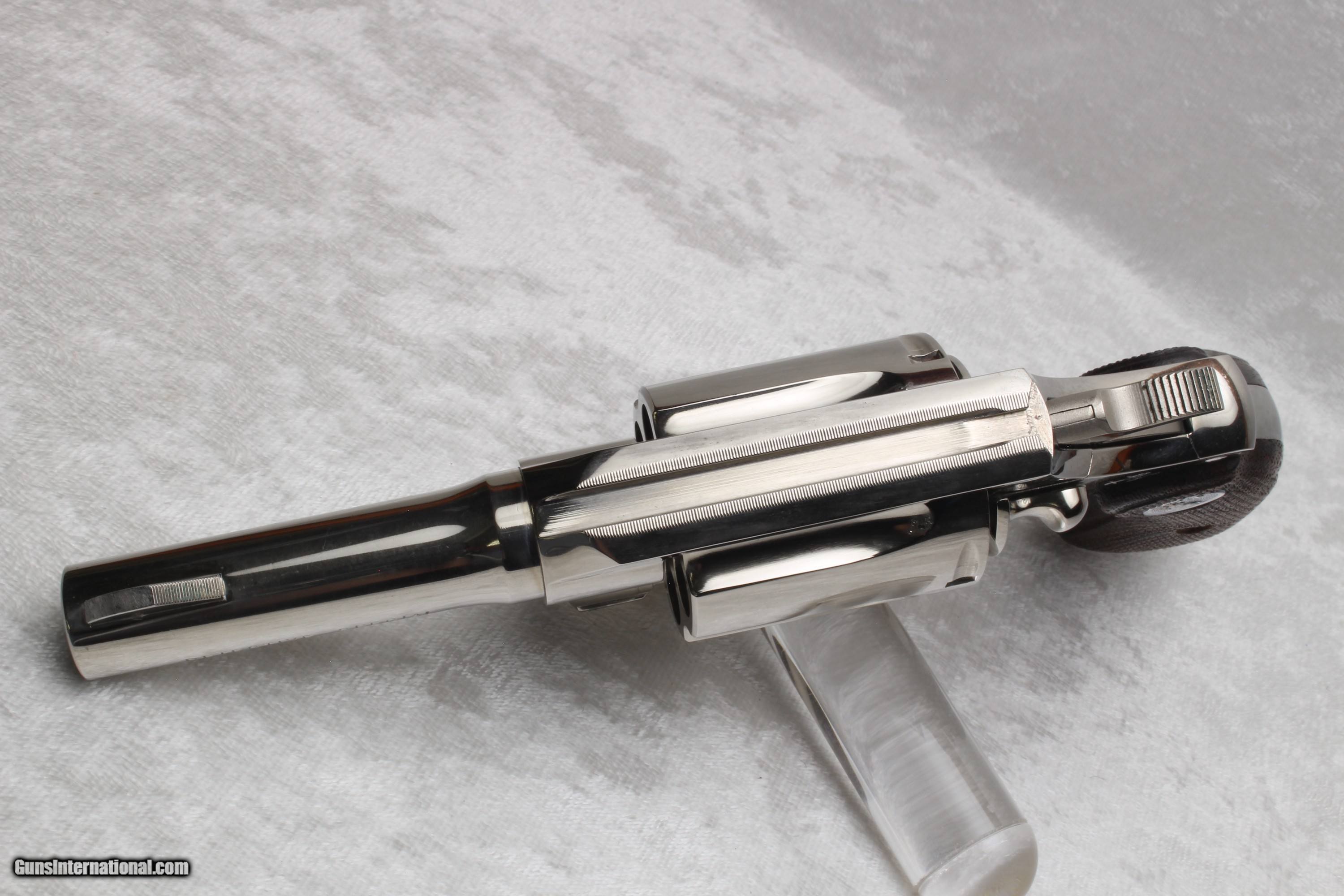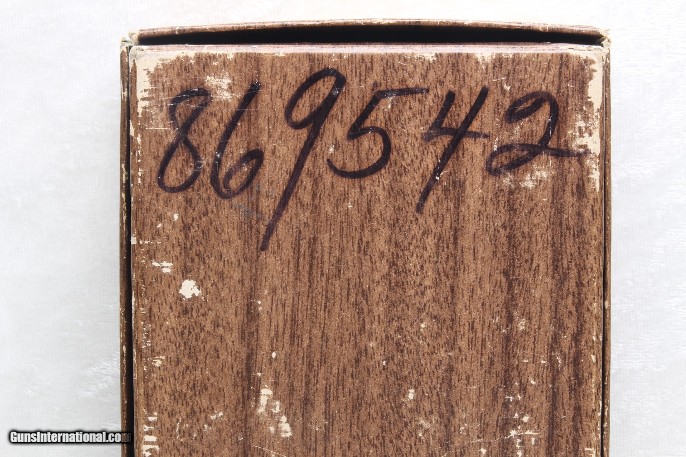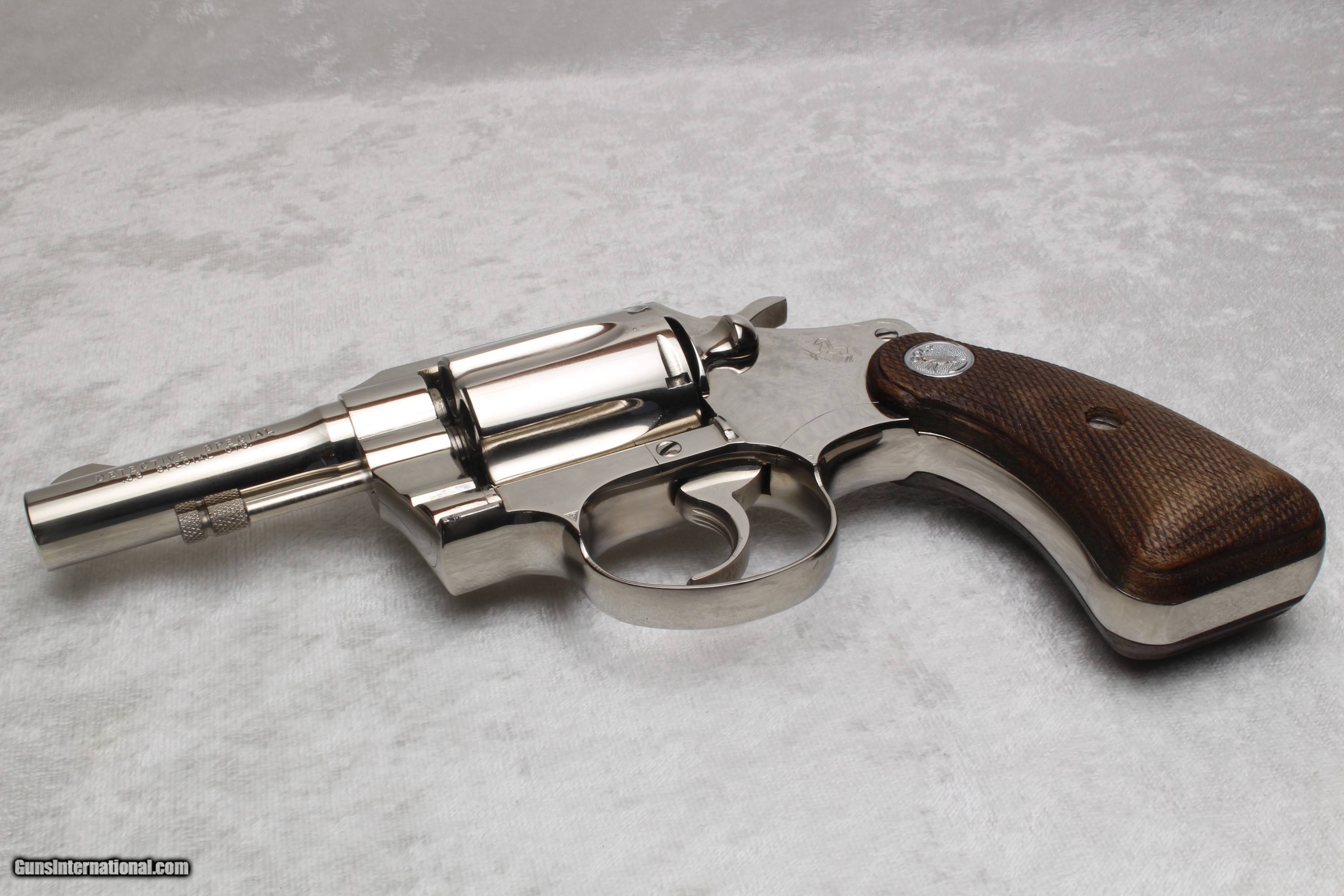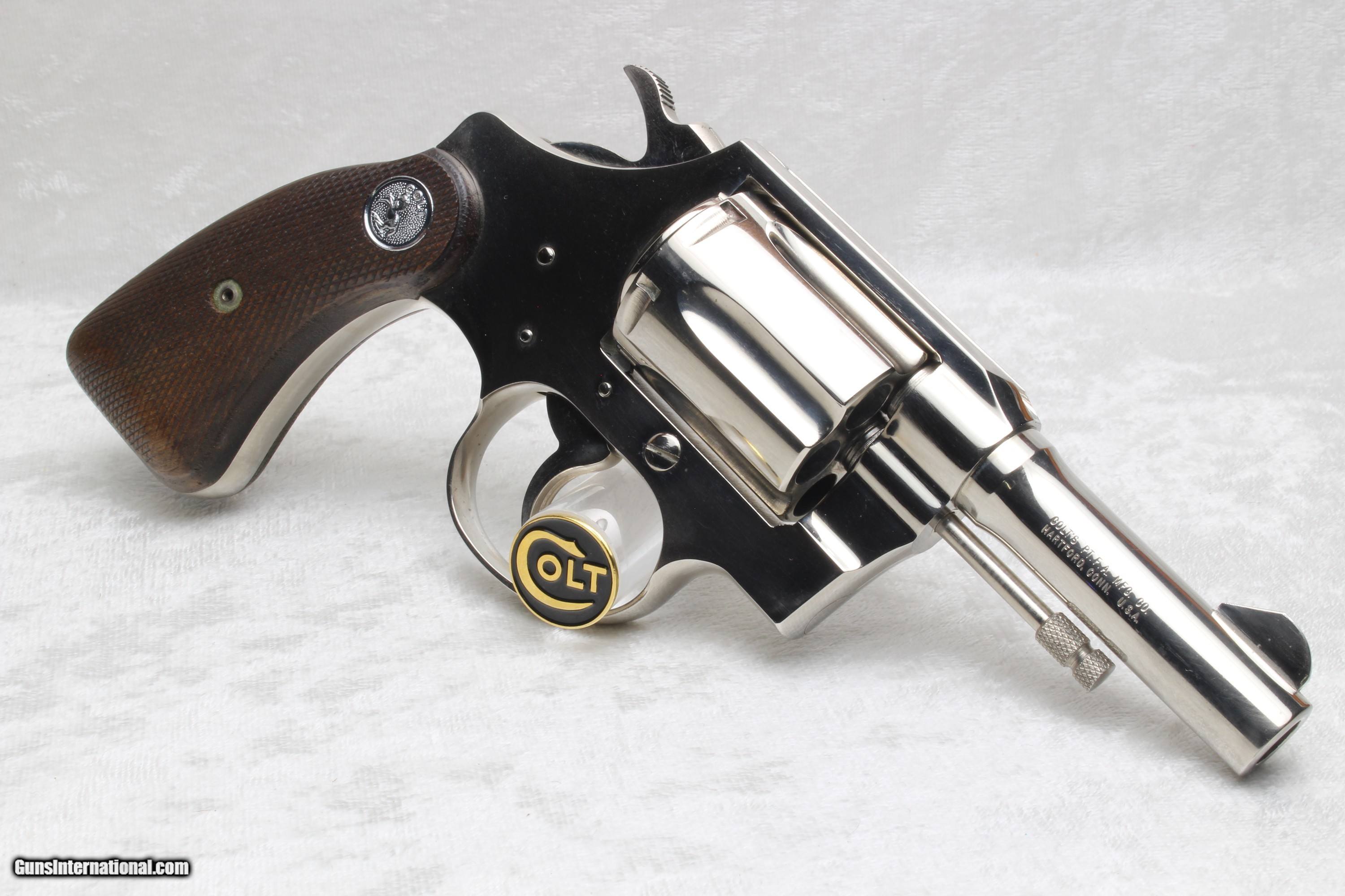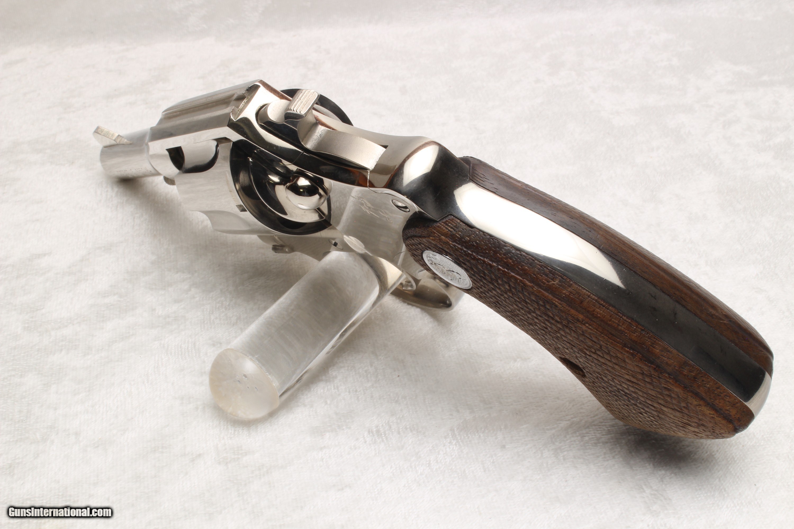 Description: Very scarce factory nickel 3" Colt Detective Special with serial number matching original box dating production to 1965. This revolver remains in very high condition with no detractions. The original nickel finish still retains a beautiful shine over the entire frame. Overall the finish rates 98%. The cylinder face, recoil shield, and forcing cone are very clean with only a very faint turn line on the cylinder itself. The action is crisp with tight lock up, and the bore is clean with strong lands/grooves. The factory walnut grips show some some light wear, but are serial number matched to the gun. Original "Handling the Hangun" brochure and warranty registration card included in the box. SOLD Curio/Relic: Yes Handgun Caliber: .38 Special Manufacturer: Colt Model: Detective Special Condition: Excellent Item Location: Arizona |