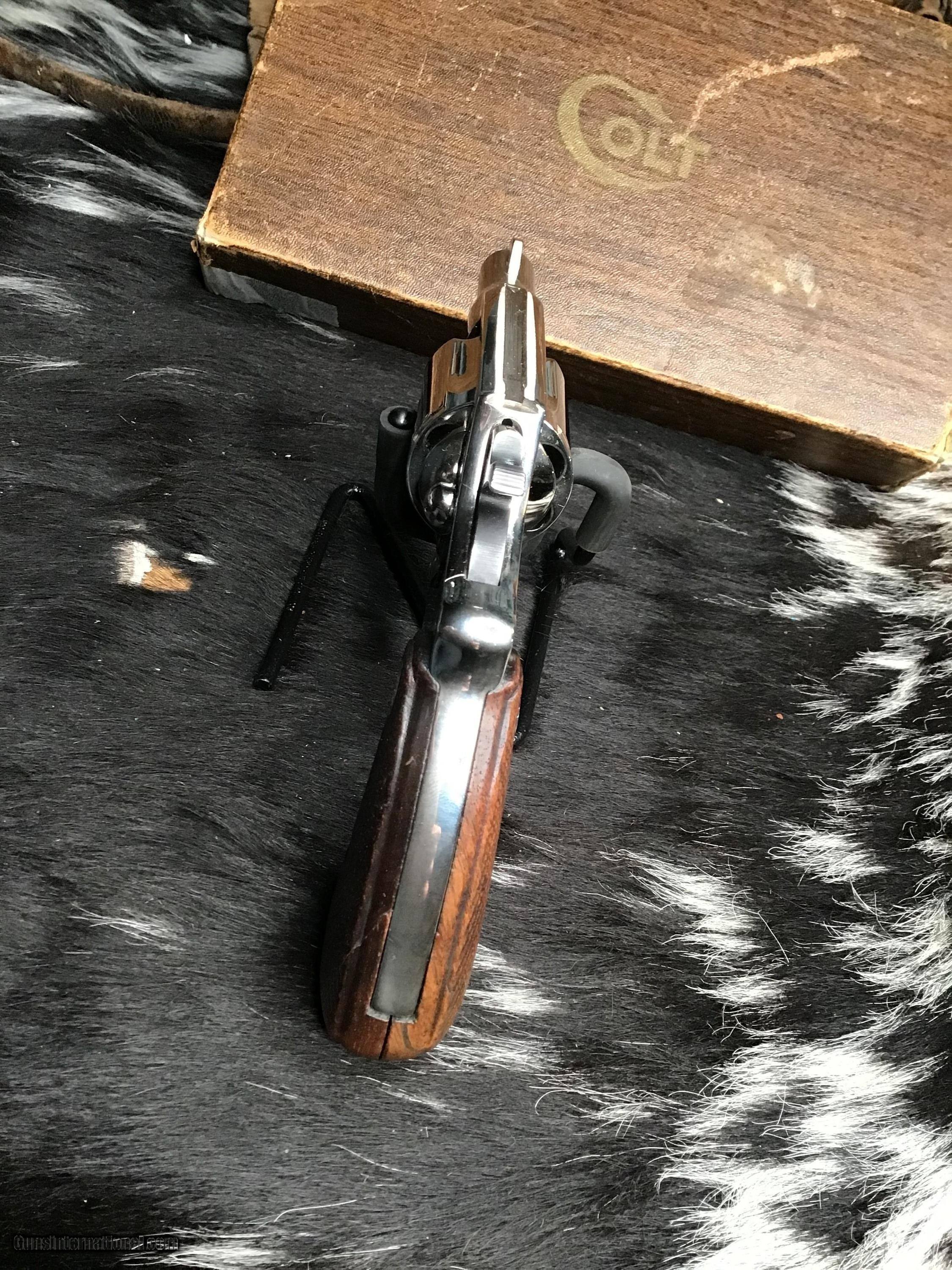 Description: Scarce Brilliant Nickel 1967 Colt Detectice Special wearing a 2 inch barrel, full checkered numbered grips with Silver ramparts medallions and chambered in .38 Special cartridge. Gun comes in original numbered to gun box with original receipt showing sale to a Chicago Policeman. Gun is in excellent used condition with factory N stamped on grip frame to confirm it is an original nickel gun. Grips show partial SN written on inside of grip panel. A buetiful addition to any investment gun collection. Add 3% if paying with card. Free shipping for all US Veterans. God Bless America from a proud American, and a Viet Nam Vet , thankful for our freedoms.. paid for by the Blood ,Sweat and Tears of our brave men and women in uniform. Ten Below Firearms is a Veteran owned and operated business. We specialize in out of production models of high quality firearms. We love to ship! We ship to all states where legal, just give us a call! Handguns normally ship for $35 and Long guns for $50 and up for extra length long guns. That's 2-3 day USPS Priority shipping, Delivery conformation and with tracking number. Optional Postal insurance is additional $1.75 per $100 and highly recommended. We are OPEN BY APPOINTMENT ONLY FOR IN PERSON VISITS, We trade, sometimes. All payments sent via mail must be received within five days of date of purchase or item will be relisted for sale. Layaway:If needed we offer a 60 day layaway program. Terms, 1/3 of purchase price down, 1/3 due in 30 days, and the final third to include card fees and shipping due at 60 days. Funds are non transferable and non refundable .Layaway is not available on negotiated prices. SOLD Curio/Relic: Yes Handgun Caliber: .38 Special Manufacturer: Colt Model: Detective Special Barrel Length: 2 inch Chambers: 6 Condition: Excellent Metal Condition: Excellent Wood Condition: Good Bore Condition: Excellent Action: DA/SA Triggers: DA Finish: Nickel Sights: Fixed notch Manufacture Date: 1967 Case: Box Item Location: Mn |