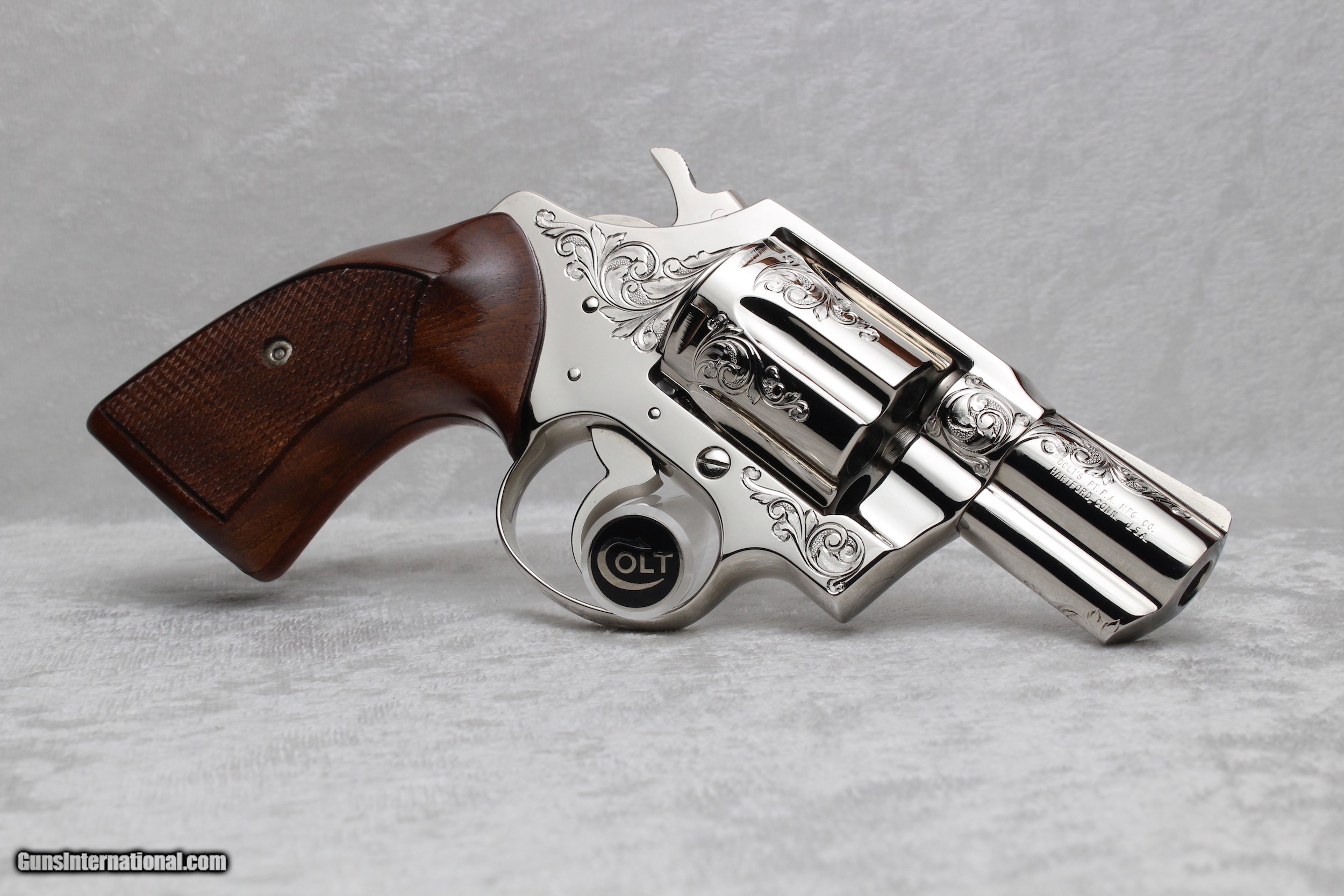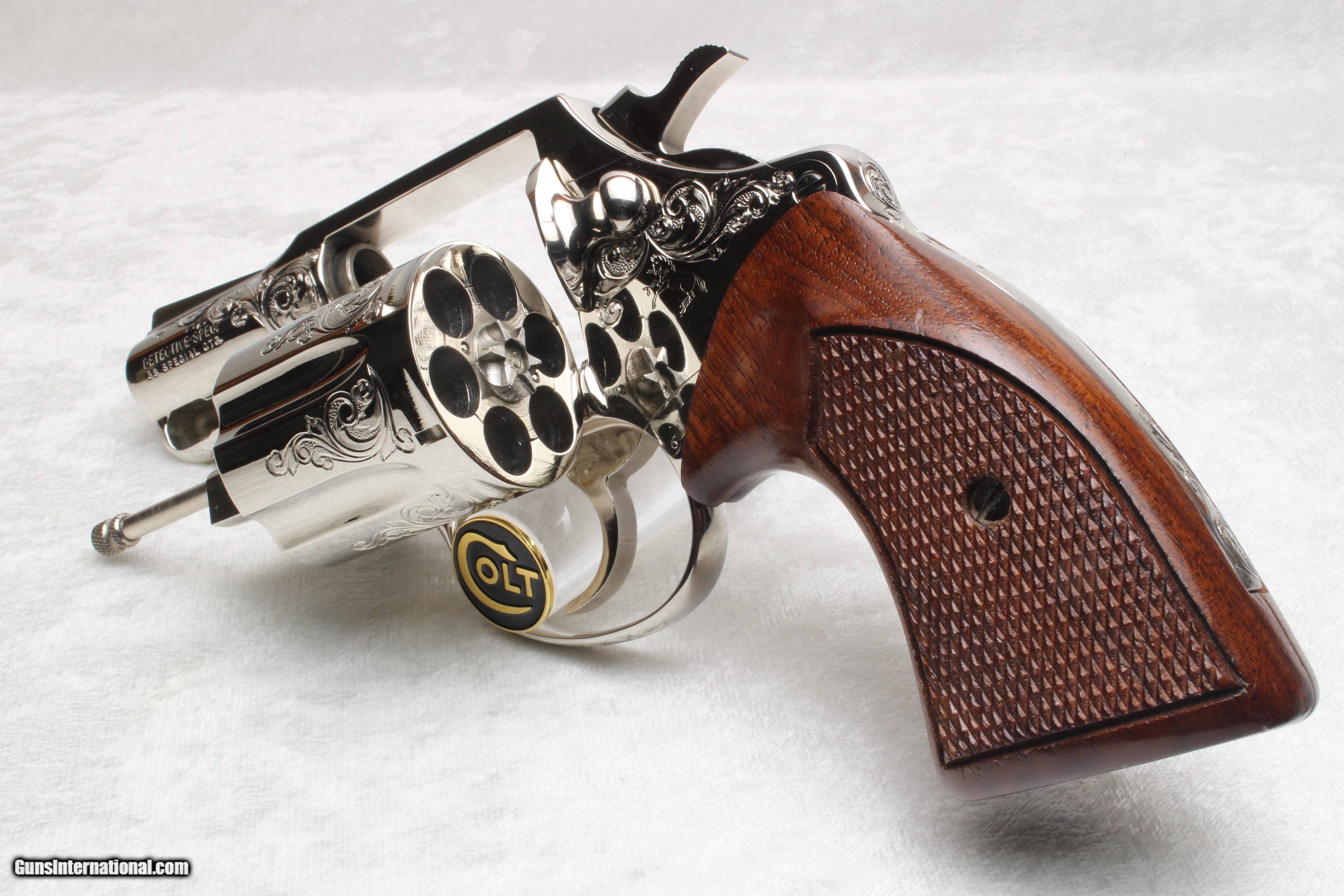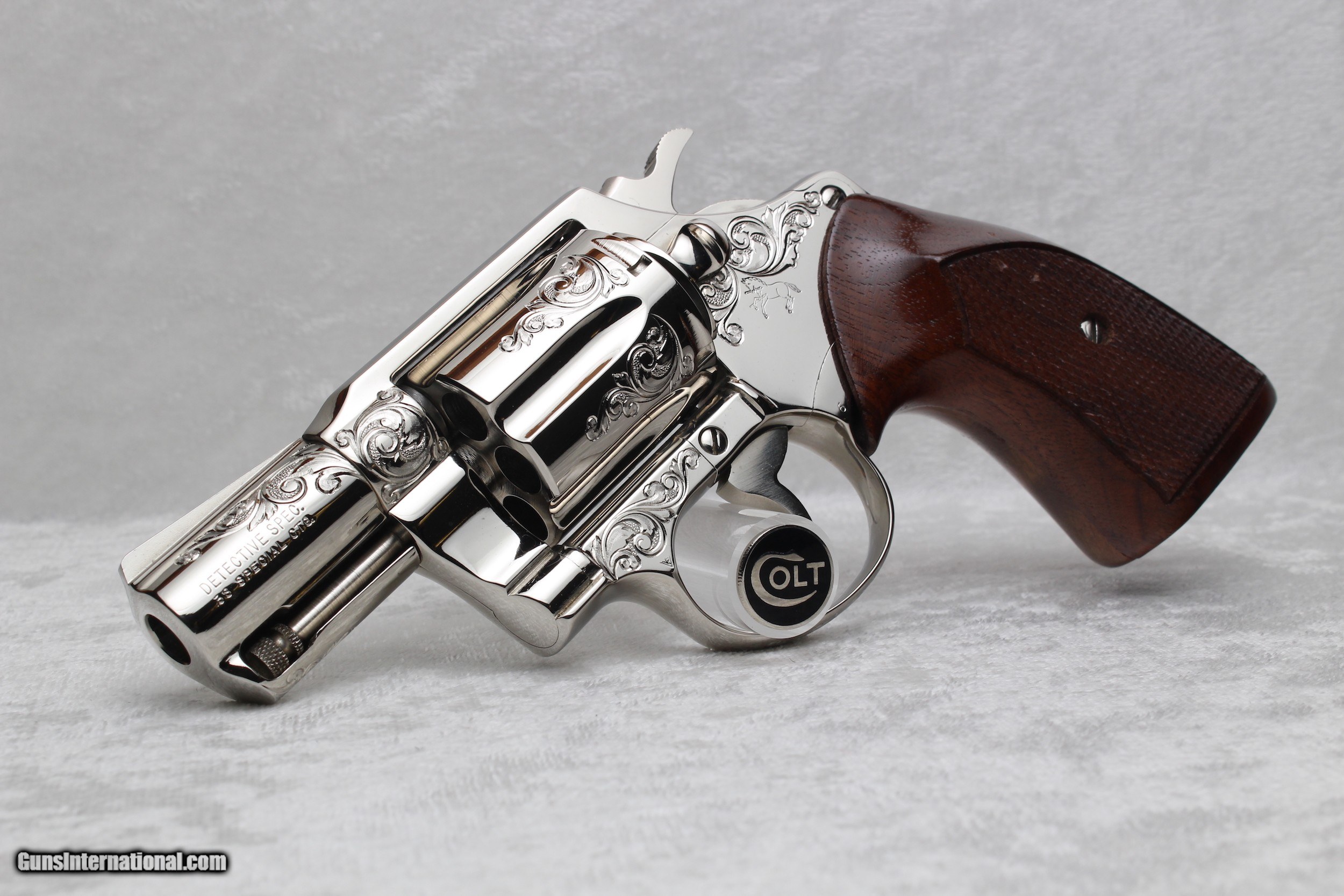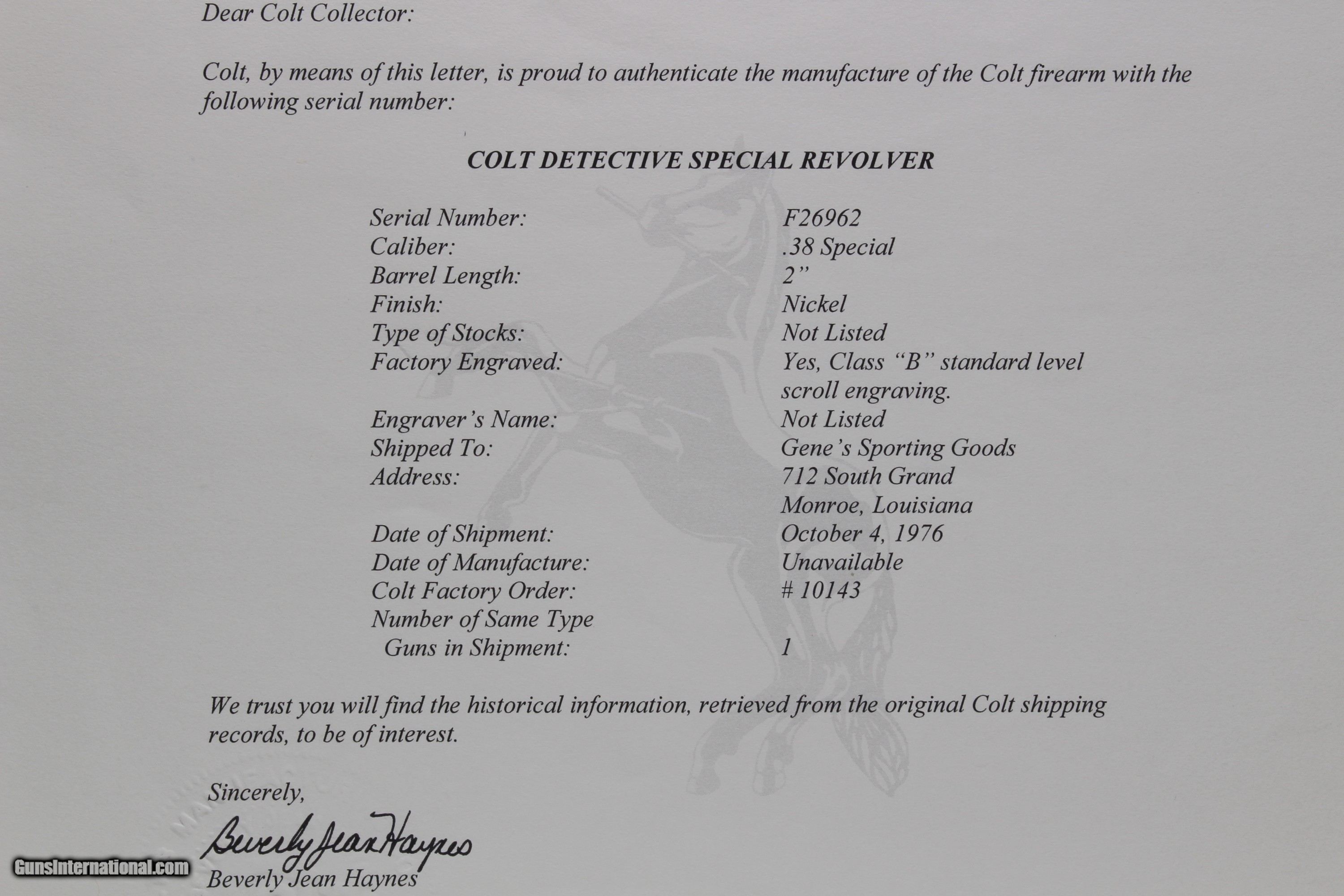 Description: Extremely Rare Factory Engraved 2" Colt Detective Special chambered in .38 Special with serial number matching original box dating production to 1974. This revolver remains in "as new" unfired condition with no detractions. The stunning original nickel finish still retains a deep shine over the entire frame. Overall the condition rates 99+%. The cylinder face, recoil shield, and forcing cone appear as new with no discernable turn line on the cylinder itself. The action is crisp with tight lock up, and the bore is clean with strong lands/grooves. The factory walnut grips are excellent. The box itself is in fair condition with tape repair. A Colt Archive letter, along with all the original paperwork is included. A seldom encountered, complete and original factory engraved Colt collector package that would be difficult to improve on at any price. Free Shipping FFL to FFL. Note: These are only being offered for a limited time (10/6). SOLD Handgun Caliber: .38 Special Manufacturer: Colt Model: Detective Special Condition: NIB Item Location: Arizona |