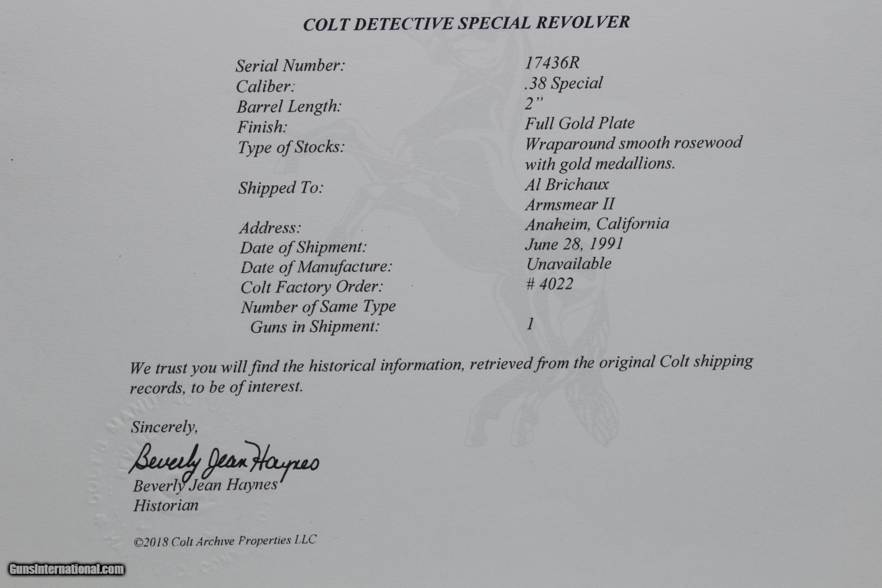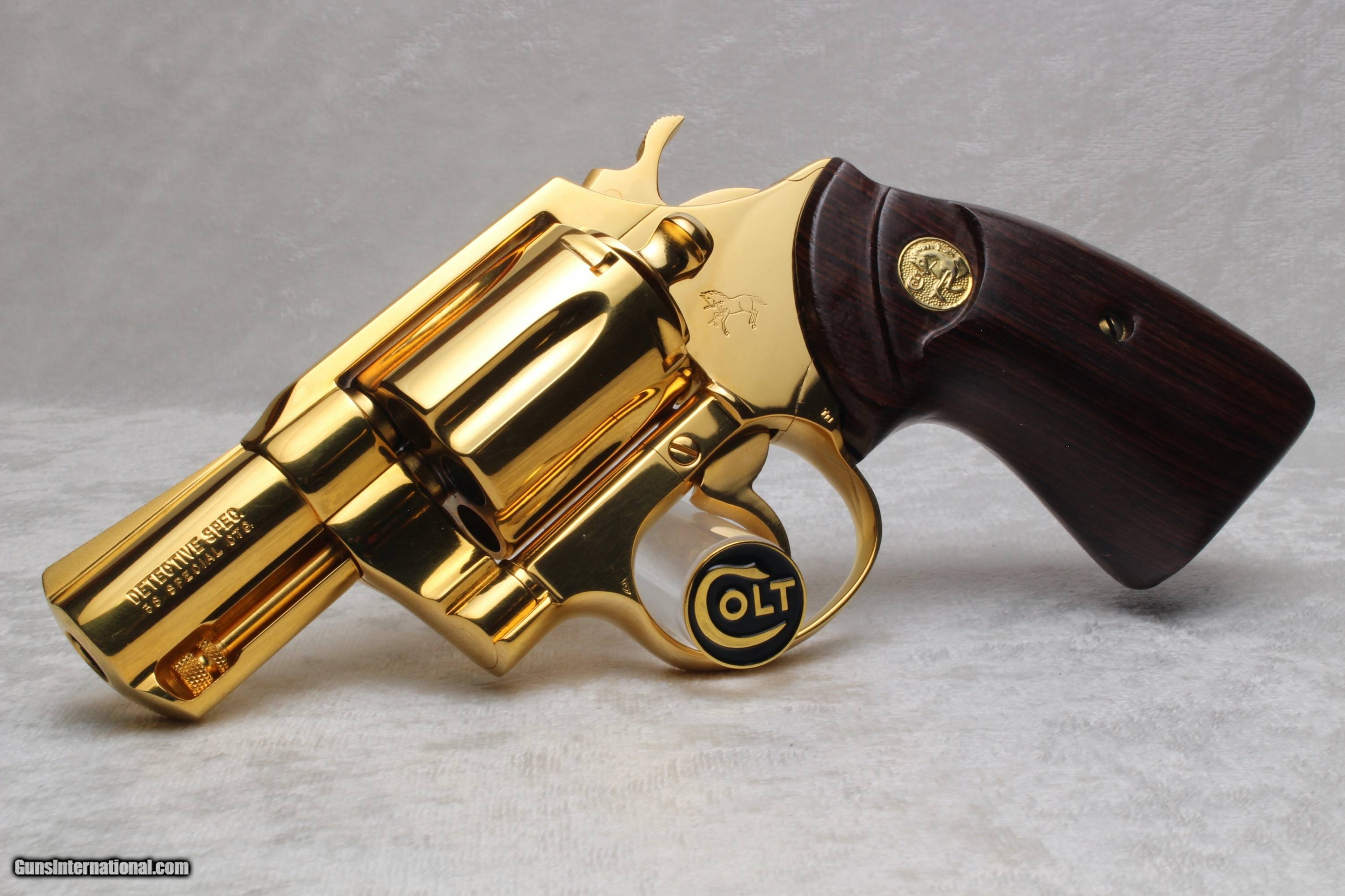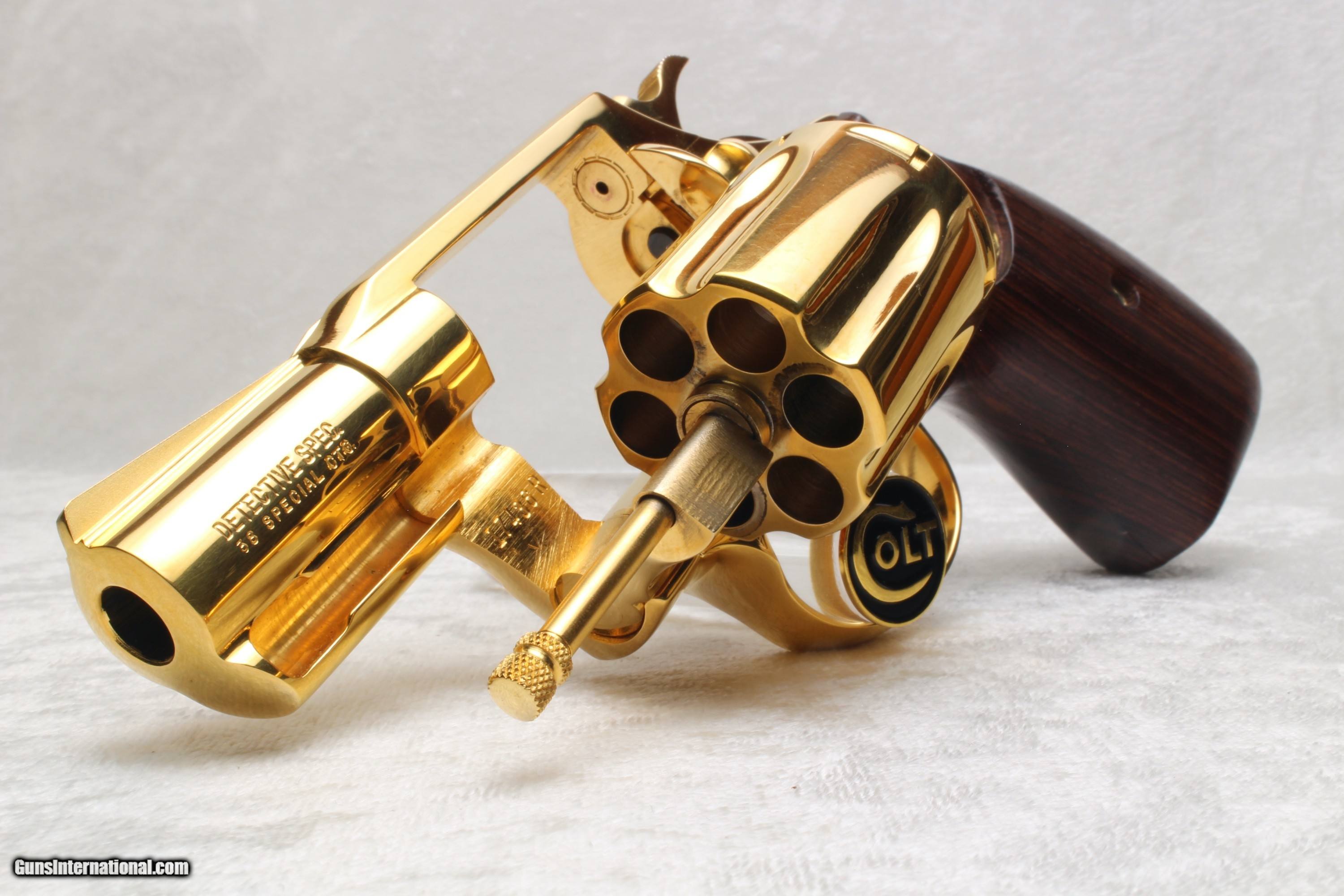 Description: "Snakeman's Den" Collection: According to the Colt Archives department, this is likely the only factory original fully gold plated Detective Special ever produced. This example shipped in June of 1991 under Factory Order #4022, and is in "As New in Box" condition. Please notce the residual burn ring around every other chamber resulting from the "Test Fire" procedure before leaving the factory. It's complete with the original serial number matching box with all original contents (hang tag, Instruction Manual, "The Colt Companion", one year service agreement, "Congratulations" letter), and Colt Archive Letter confirming the original configuration. This is a complete and truly RARE collector package (1 of 1) that cannot be improved upon in any way. I think it's pretty safe to say you'll never see another one like it anywhere, at any price... SOLD Handgun Caliber: .38 Special Manufacturer: Colt Model: Detective Special Serial Number: 17436R Condition: New In Box Manufacture Date: 1991 Item Location: Arizona |