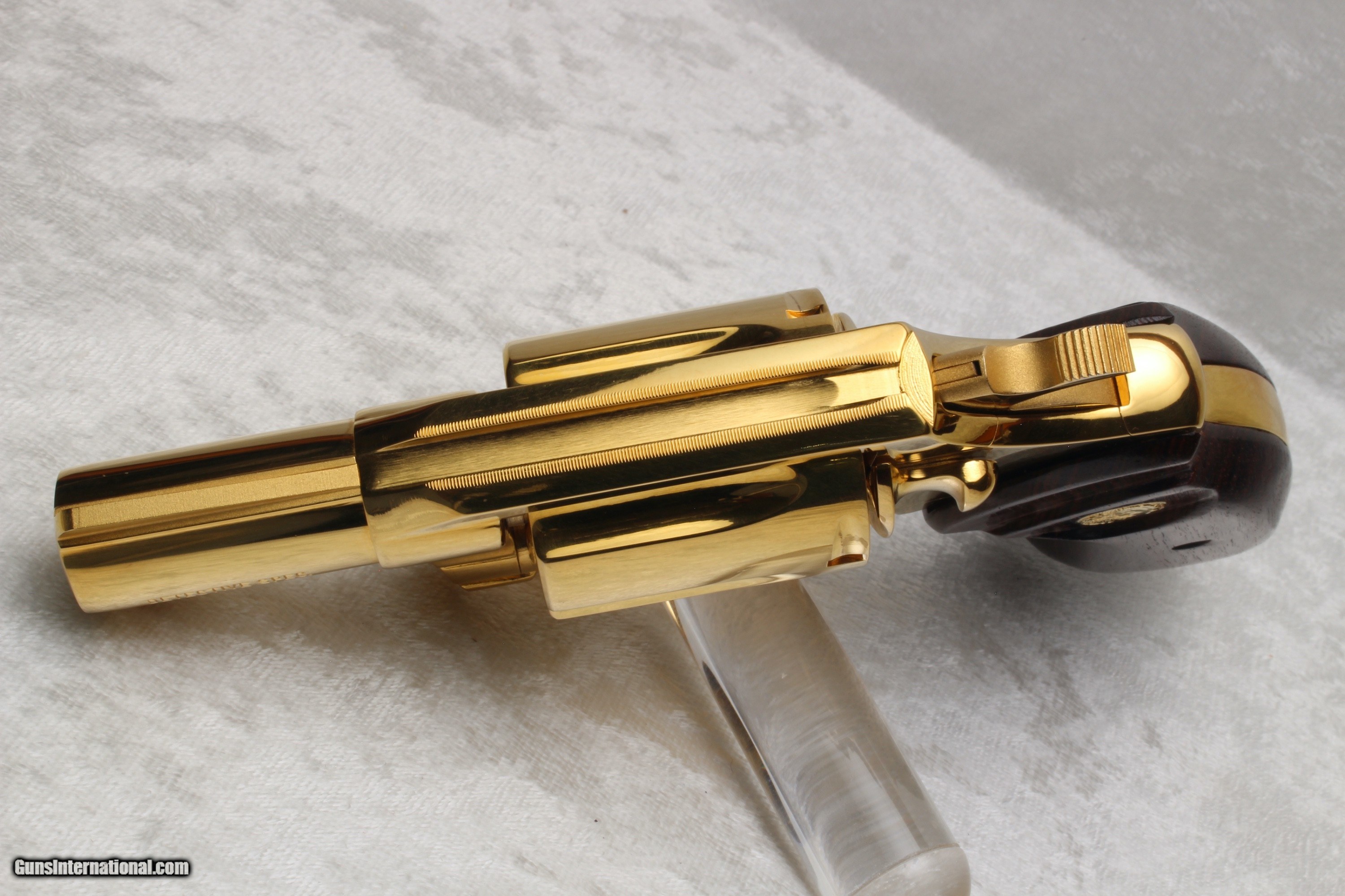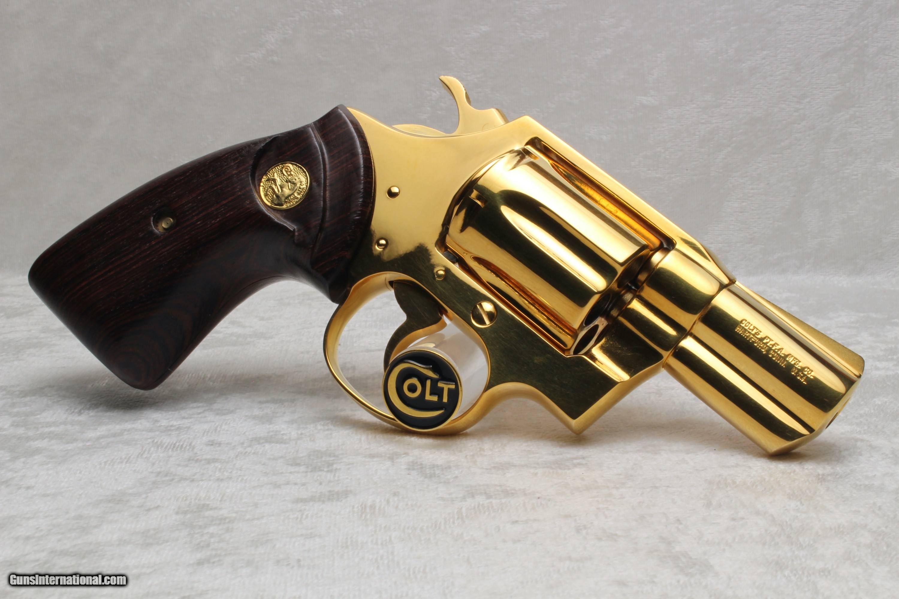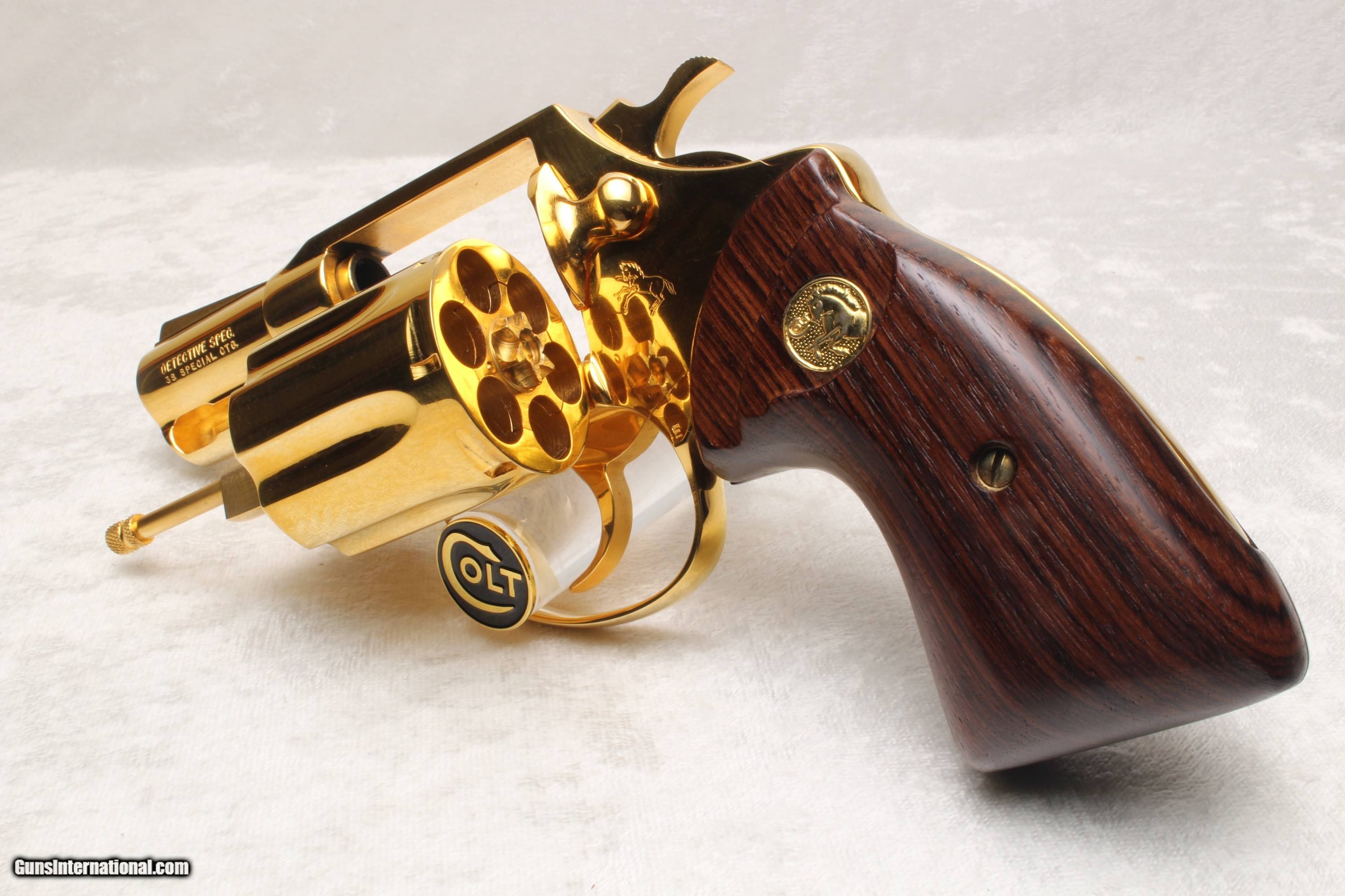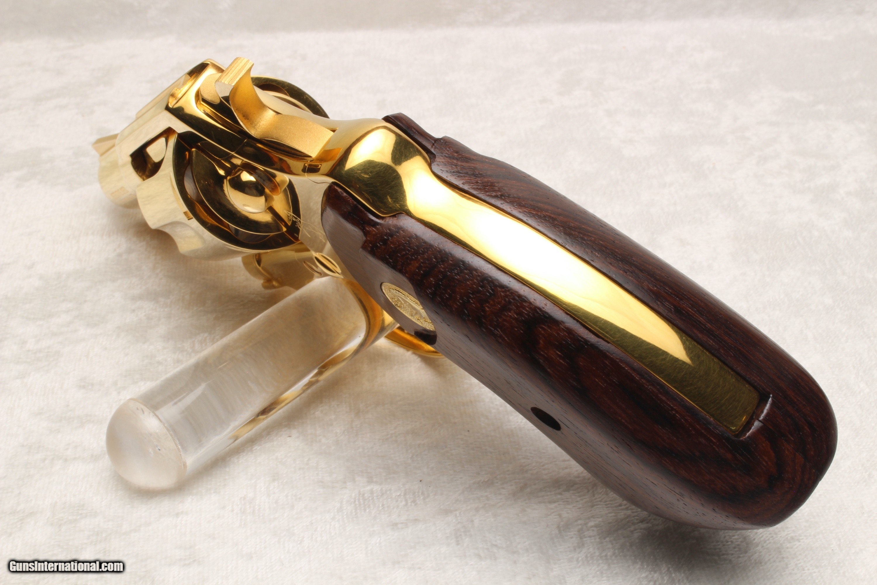 Description: "Snakeman's Den" Collection: According to the Colt Archives department, this is likely the only factory original fully gold plated Detective Special ever produced. This example shipped in June of 1991 under Factory Order #4022, and is in "As New in Box" condition. Please notce the residual burn ring around every other chamber resulting from the "Test Fire" procedure before leaving the factory. It's complete with the original serial number matching box with all original contents (hang tag, Instruction Manual, "The Colt Companion", one year service agreement, "Congratulations" letter), and Colt Archive Letter confirming the original configuration. This is a complete and truly RARE collector package (1 of 1) that cannot be improved upon in any way. I think it's pretty safe to say you'll never see another one like it anywhere, at any price... SOLD Handgun Caliber: .38 Special Manufacturer: Colt Model: Detective Special Serial Number: 17436R Condition: New In Box Manufacture Date: 1991 Item Location: Arizona |