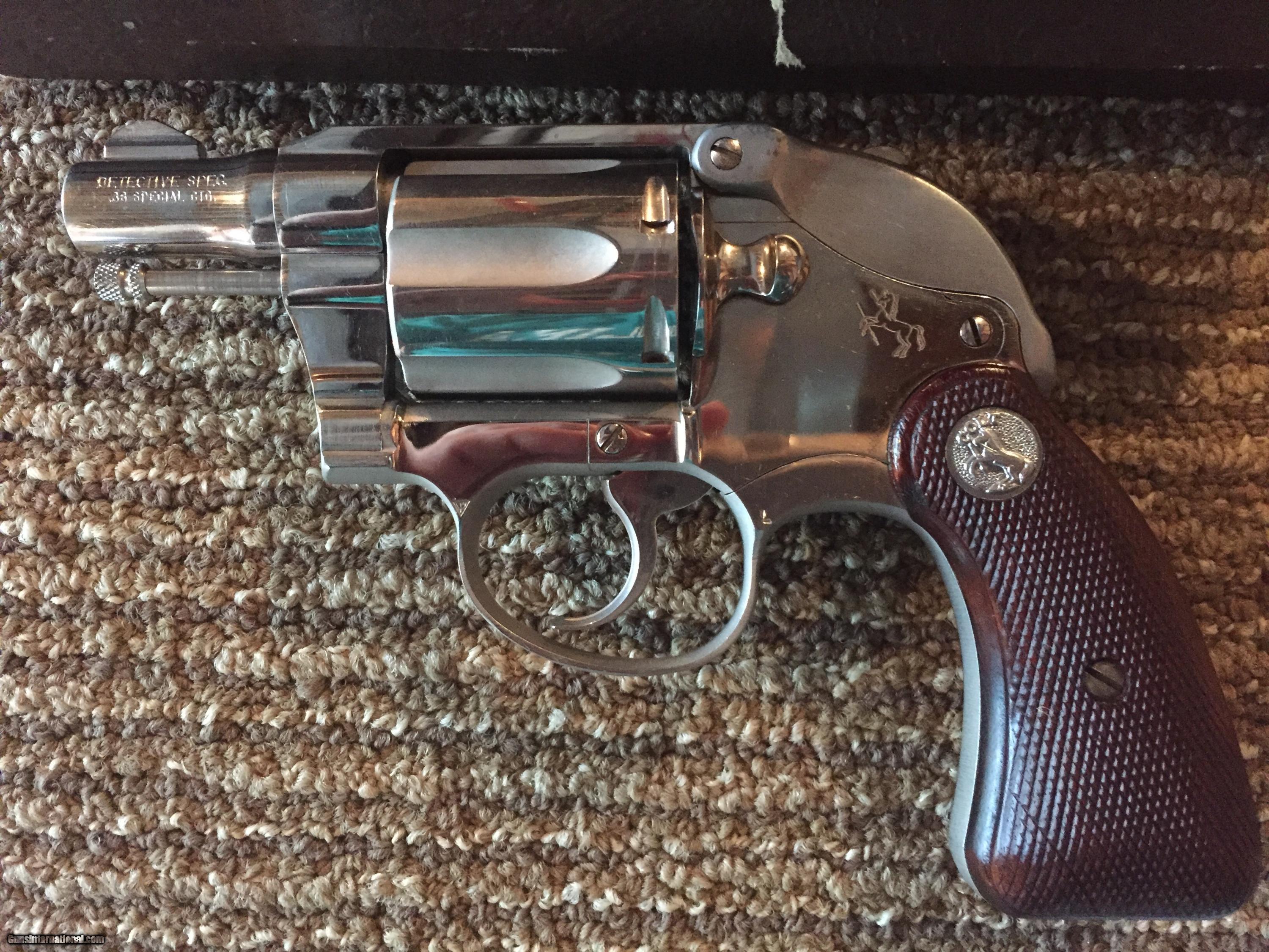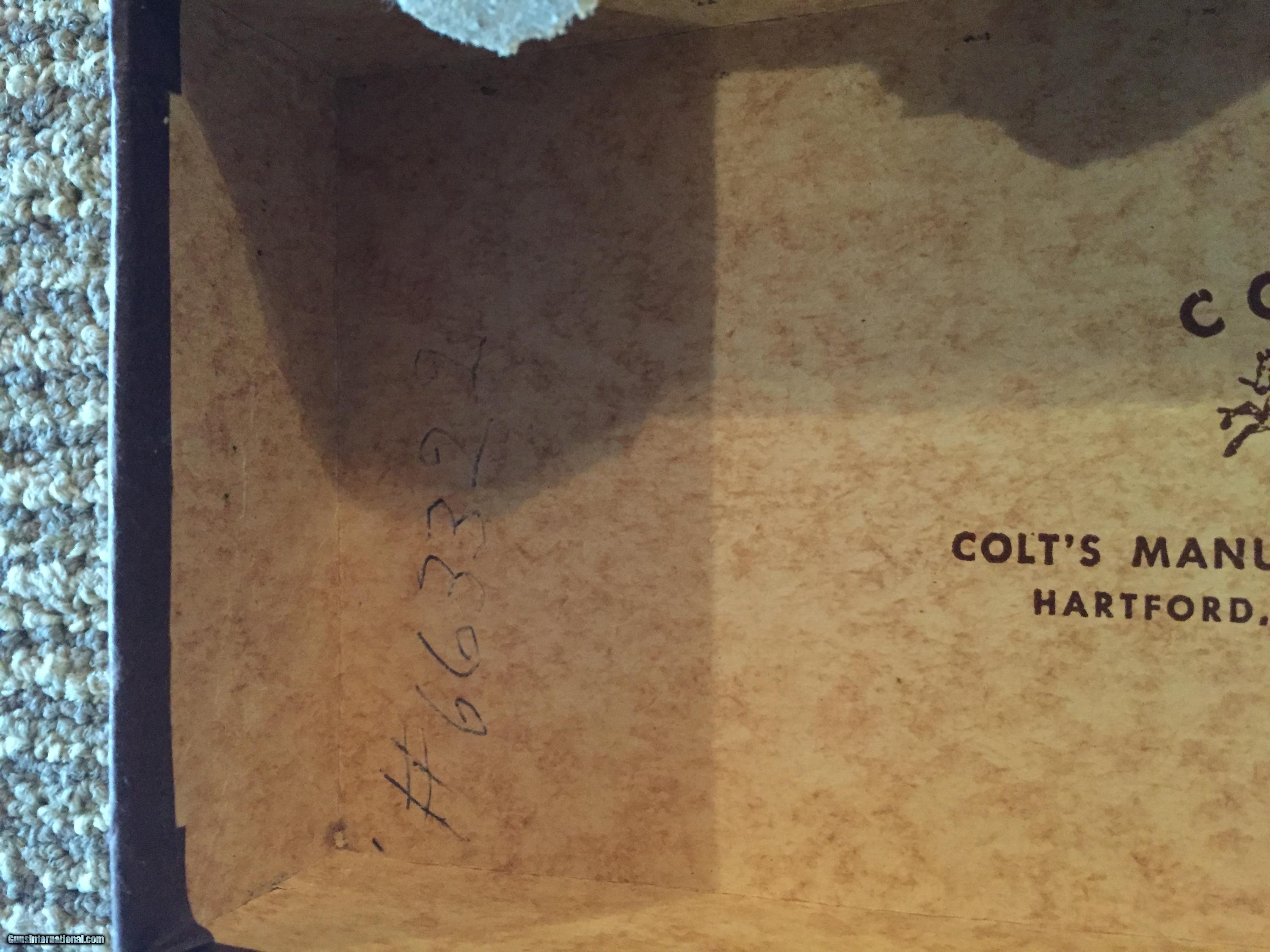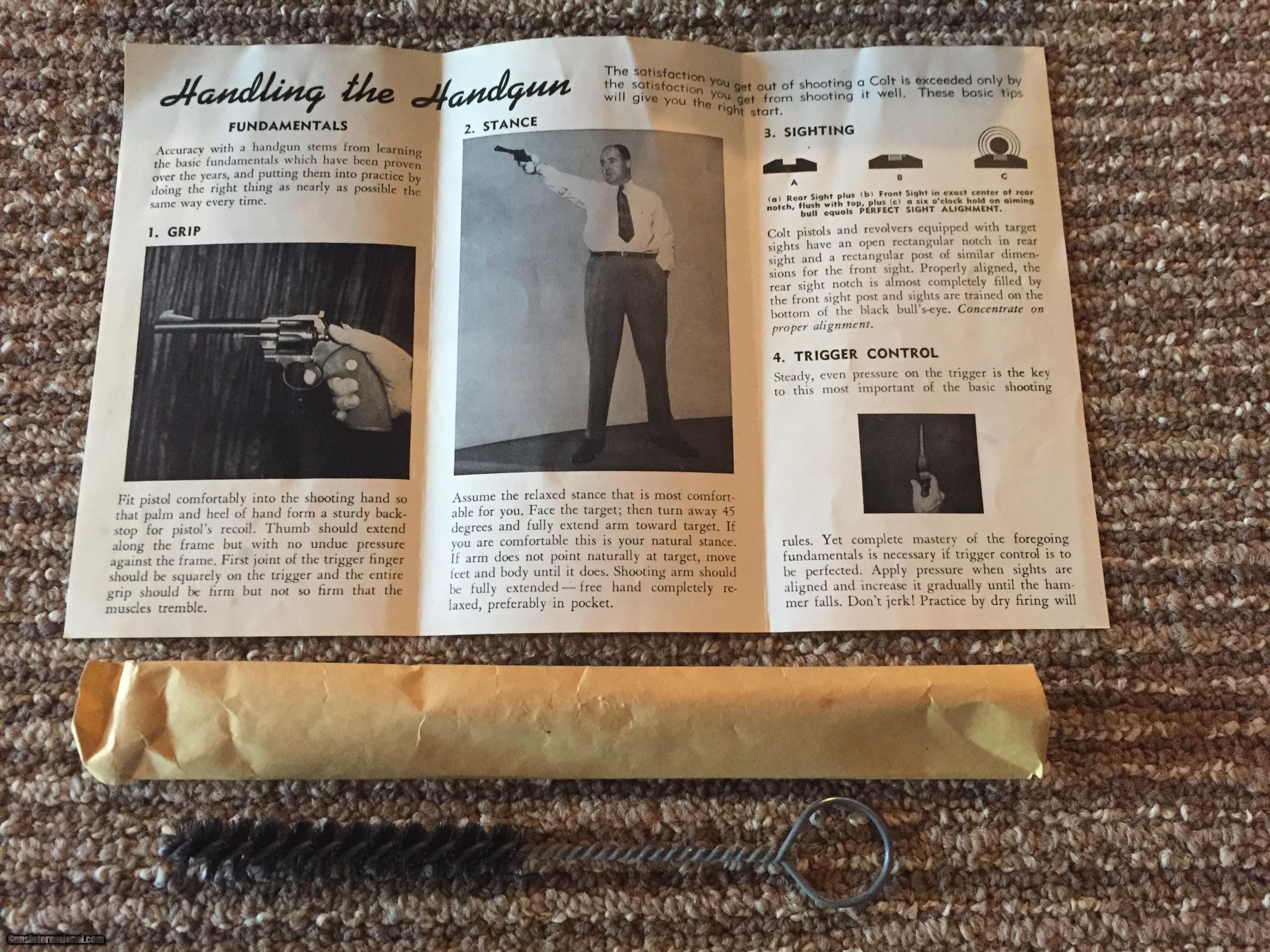 Description: 2nd Issue Nickel Colt Detective Special with Factory Shroud. 1955 Manufacture. 2" barrel. .38 Special. Original Wood Grips in excellent condition. Some minor scratches and wear to nickel, see photos. It has been fired but not much, perhaps only the test shots at Colt. With Original Box and Accessories. Box lid has separated, original serial number in box. Pamphlet by Colt with 1954 date. Original Cleaning tool. Excellent original condition, a perfect collectable! SOLD Manufacturer: Colt Model: Detective Special Serial Number: 663322 Caliber Info: .38 Special |