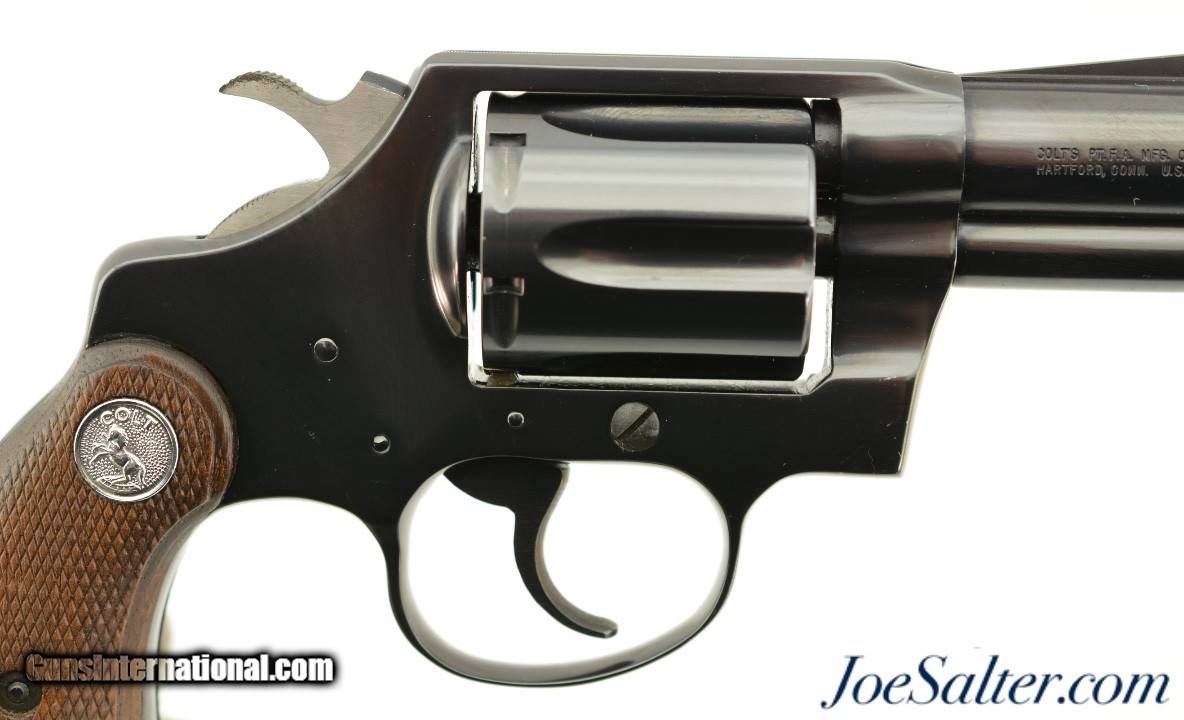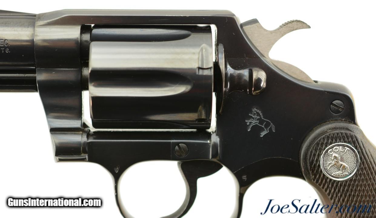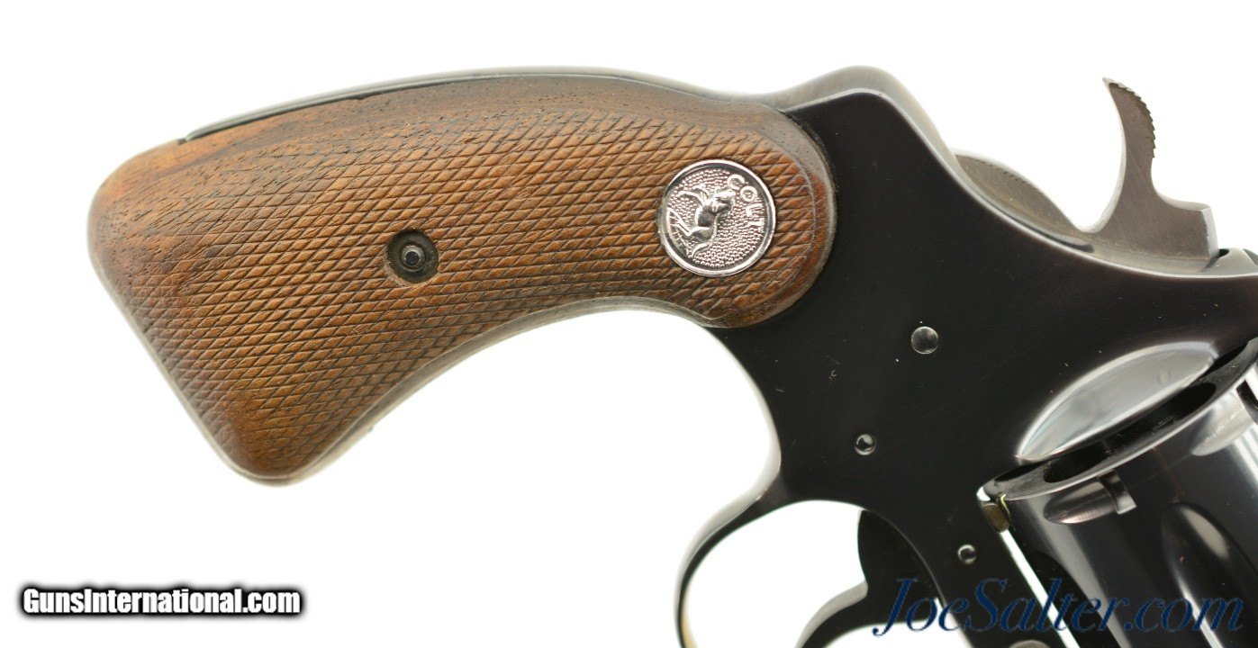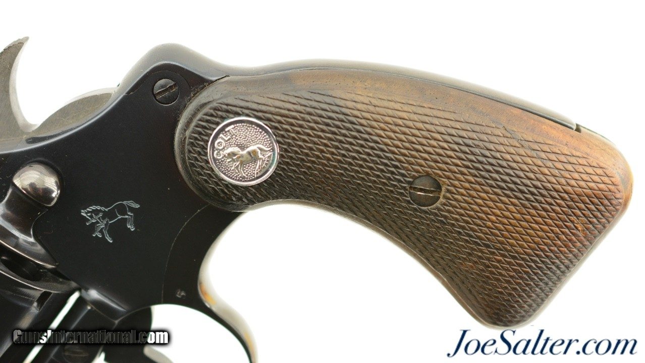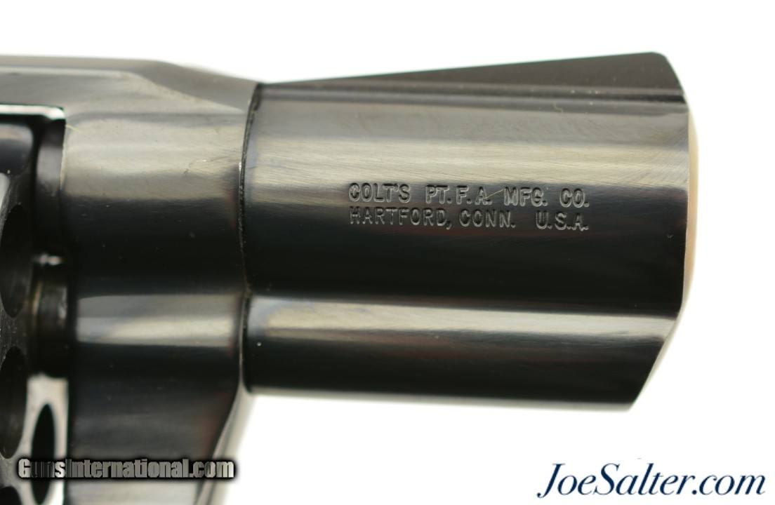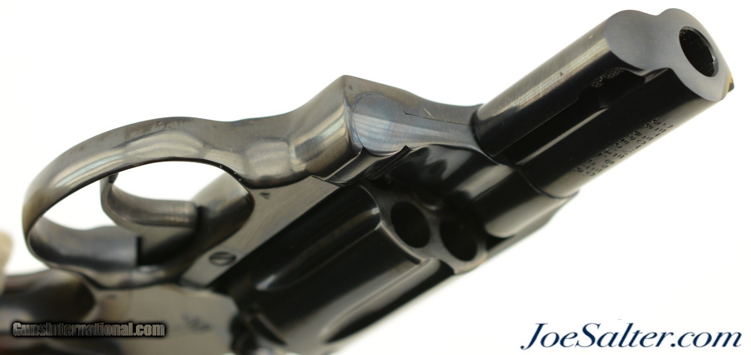 Description: Serial #P38473, .38 Special, 2 inch barrel with a bright, excellent bore. This is the third issue Colt Detective Special revolver manufactured in 1982 featuring the shrouded ejector housing and integral long serrated ramp front sight. In excellent condition the barrel frame and cylinder retain virtually all, 98-99% of the original Colt blue finish. The checkered Rampant Colt emblem walnut grips show light wear and are tight but slightly bowed on the left panel at the top. It comes in a correct, original Colt box with manual and Colt gun lubricant tube. An excellent Detective Special. FFL SOLD |