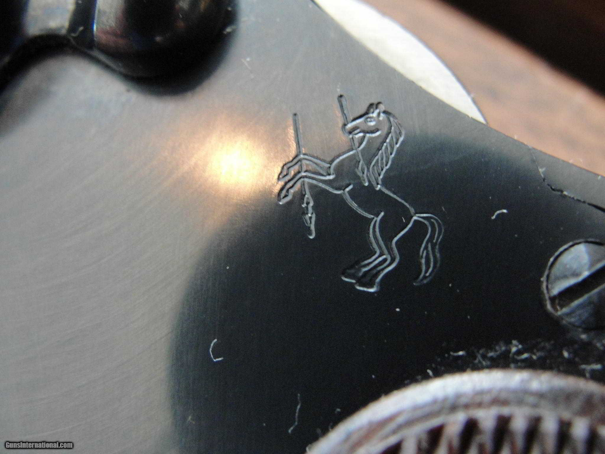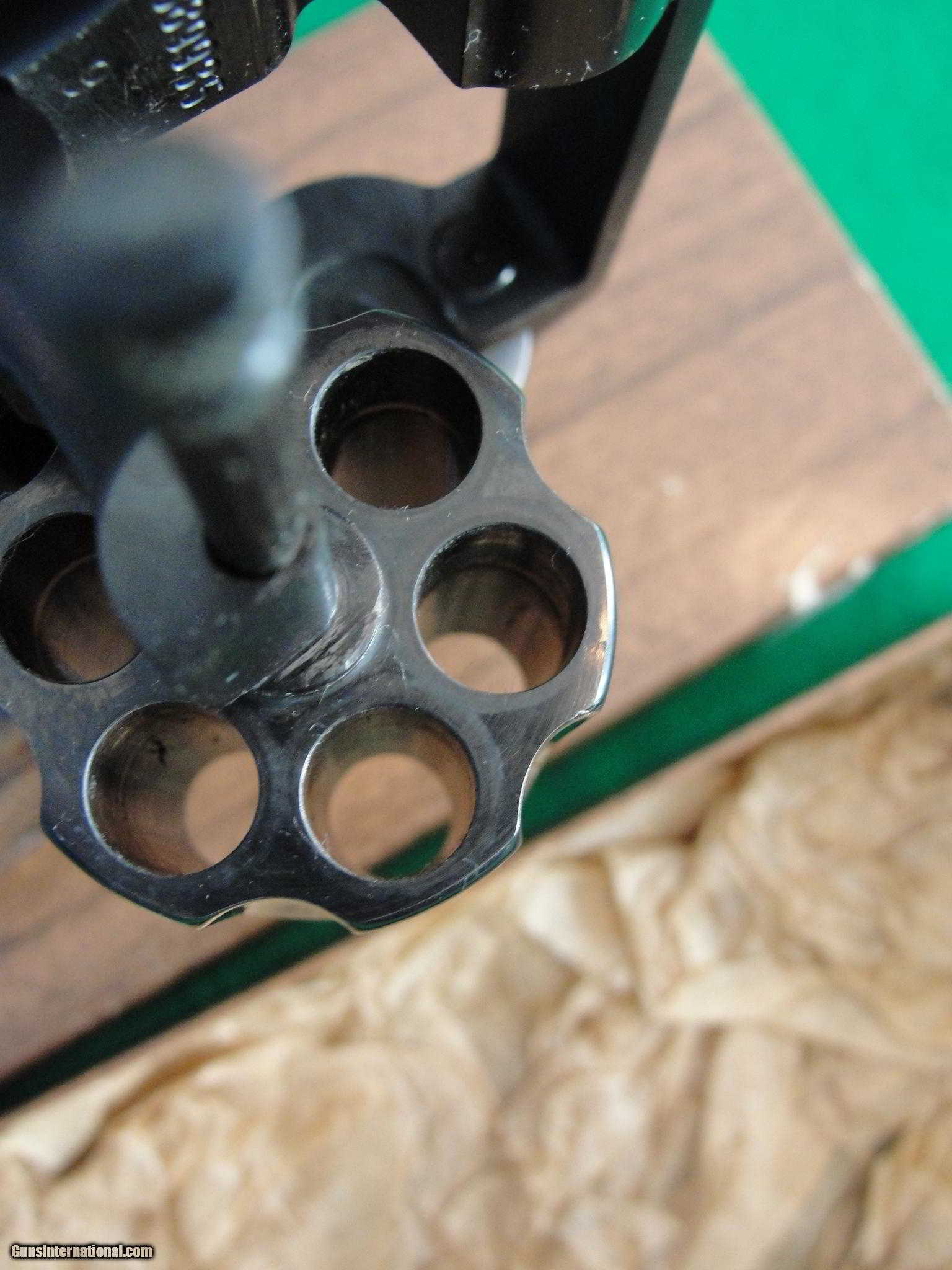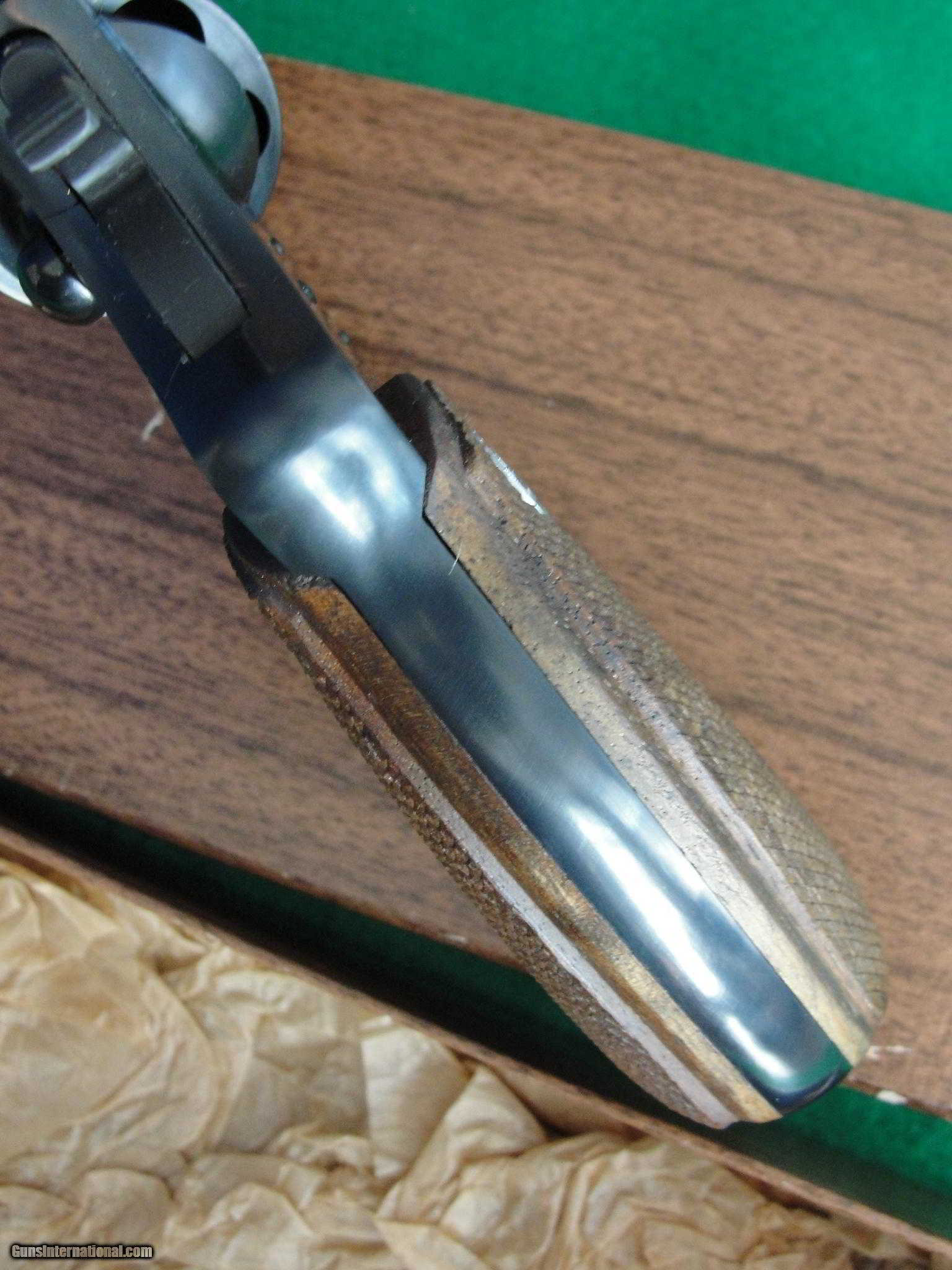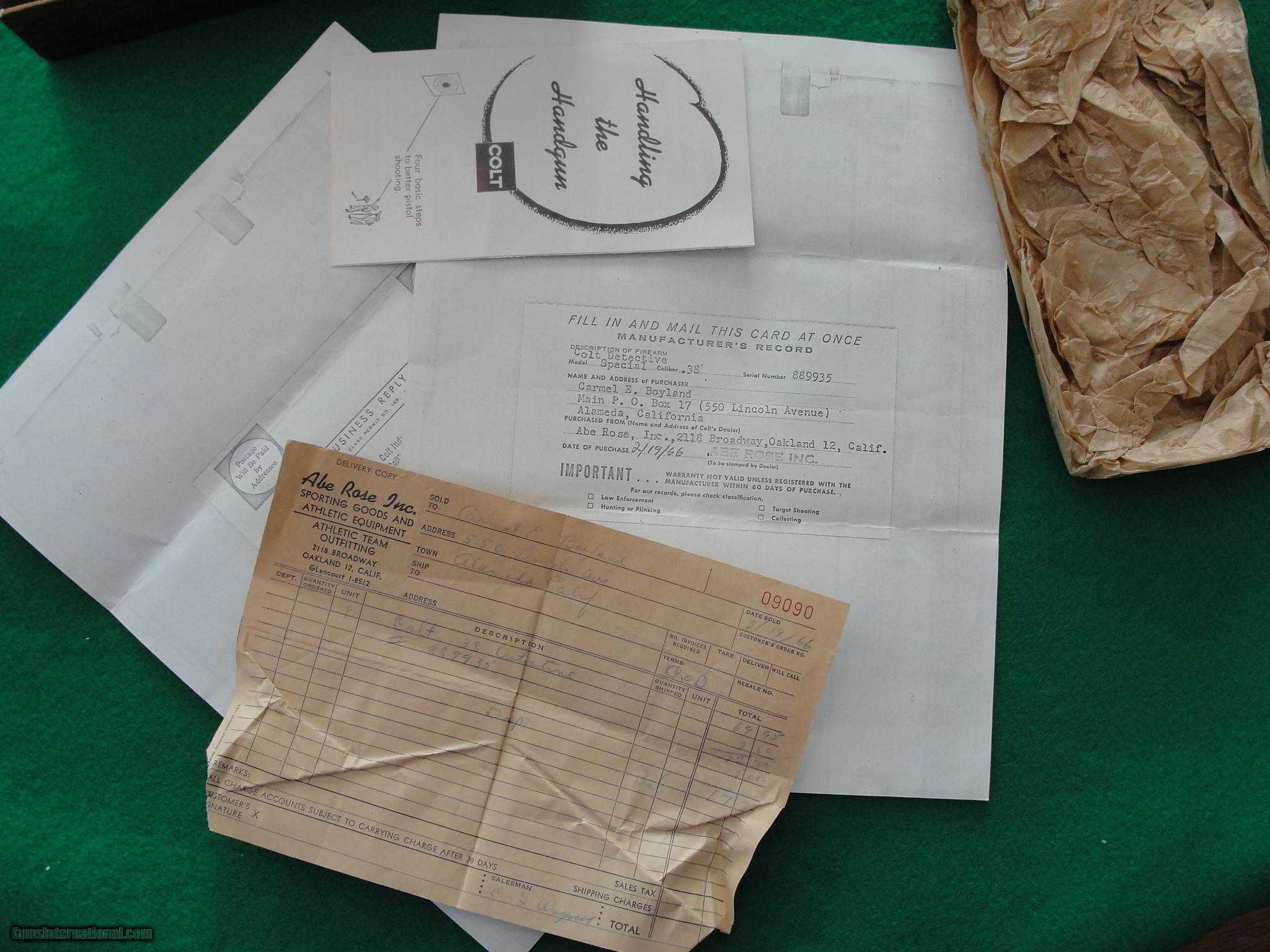 Description: Perfect for the advanced Colt collector, this revolver only reveals having been fired at all by the faintest of smoke rings on the cylinder face. This MAY be just from factory test firing! Theres NO marring of the finish on the breech face and there's only the slightest evidence of a turn ring, ONLY in the detent cut outs. Blueing, under close inspection, appears flawless, with NO visible high edge wear or handling marks. Grips are in similarly excellent condition. Box lid has some skid marks, as seen in the pictures. This is the original factory box, with the matching serial number on the bottom. Included with the revolver is the pictured paperwork: photocopy of the completed warranty card as mailed to Colt, and the original sales invoice from 1966, from Abe Rose Sporting Goods in Alameda, California. Serial # 8881xx made in 1964. CA sales OK. Call or email for additional information. SOLD |