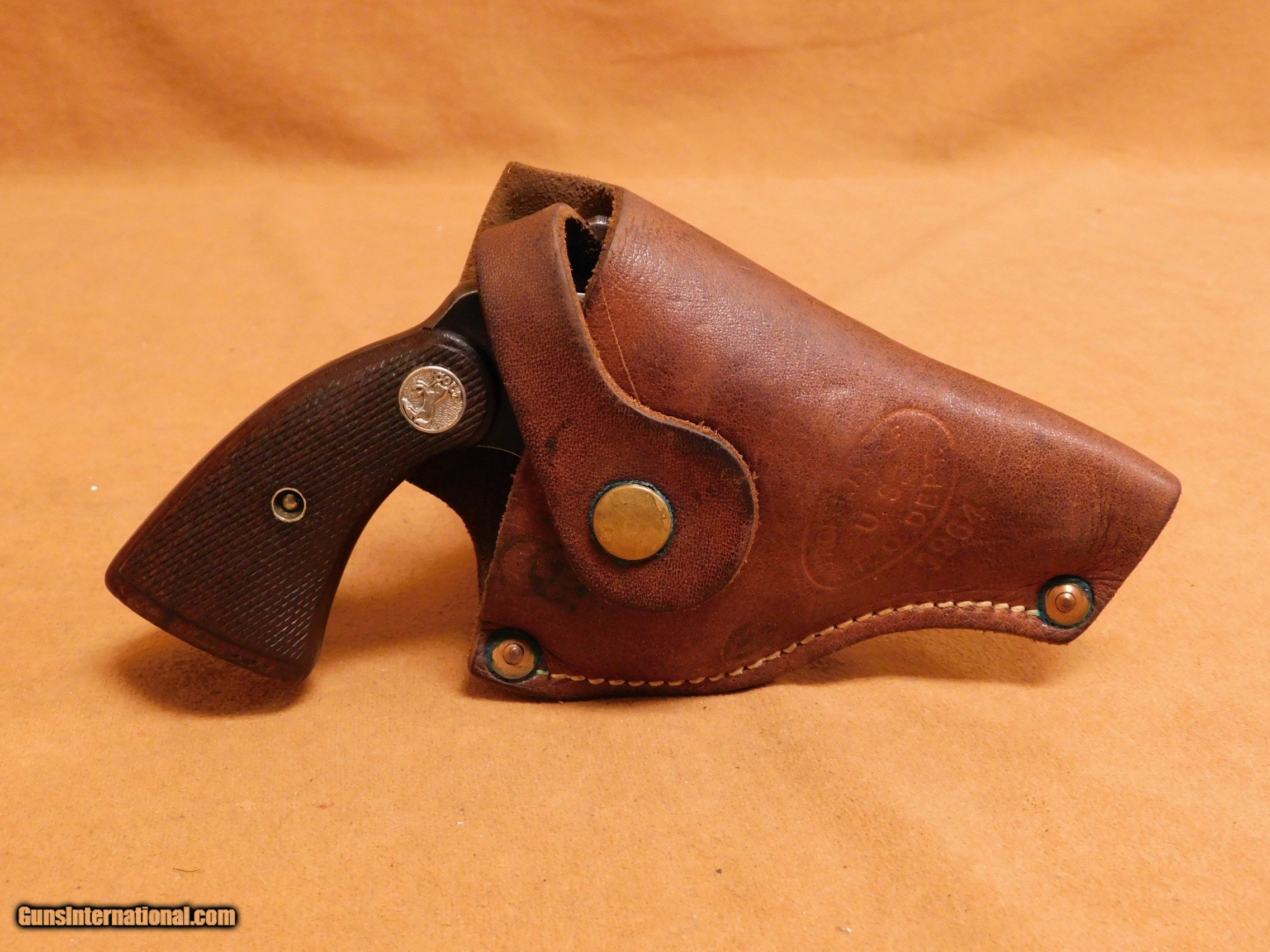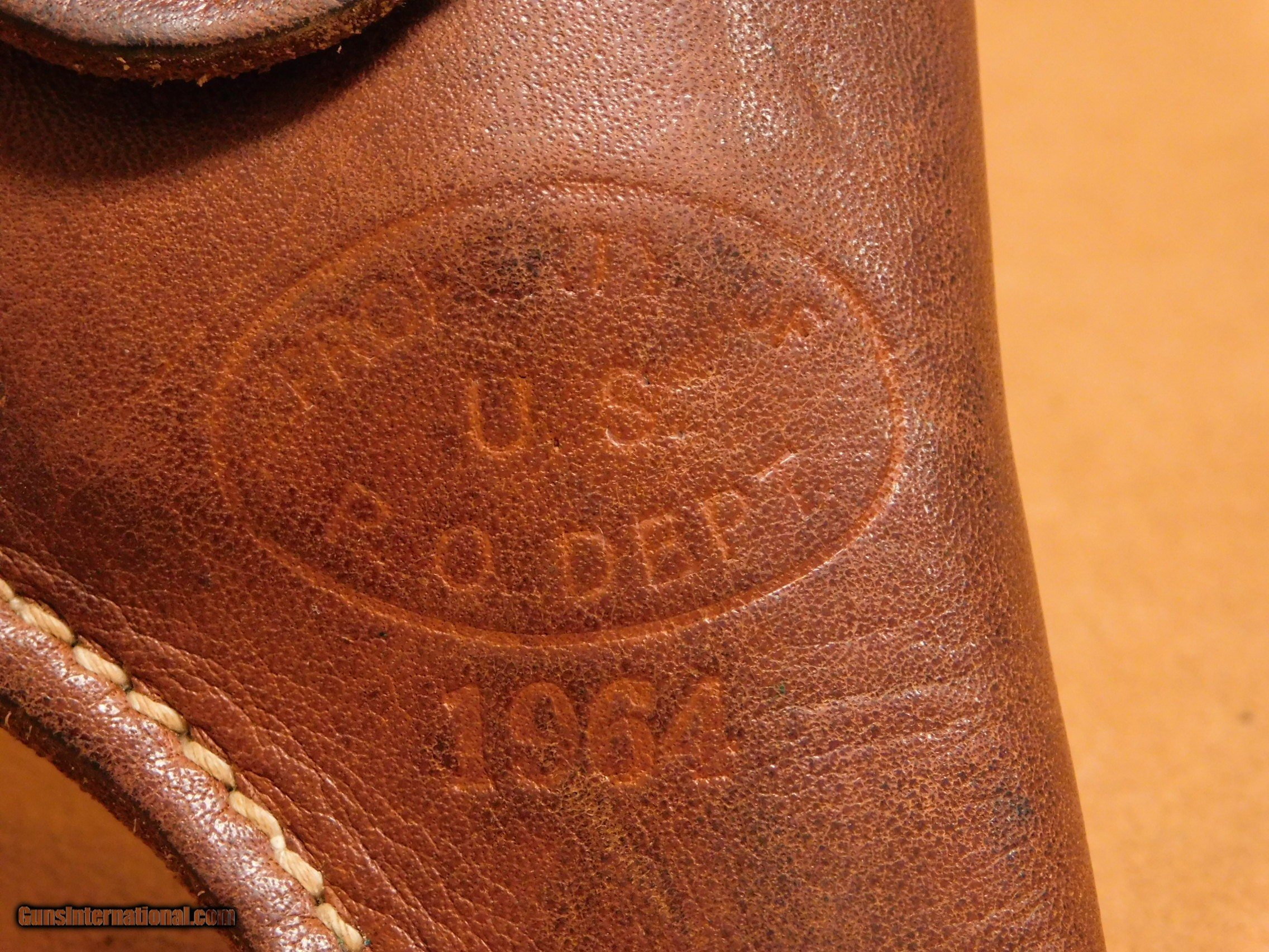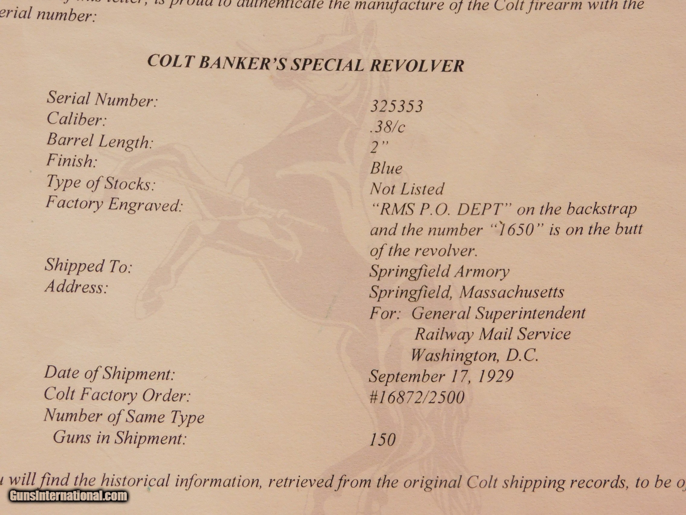 Description: This is a Colt .38 Banker's Special that was sold to the United States Government prior to WWII. The Banker's Special can be considered the baby brother to the more common Detective Special and it features a smaller frame and shorter cylinder to accommodate the .38 Colt New Police cartridge (aka the .38 S&W). With its 2-inch barrel, the Banker's Special was ideal for concealed carry as a personal defense handgun. Interestingly, one of the biggest buyers of the Banker's Special was the U.S. Government for issue to the Post Office. Prior to WWII, much of the mail was carried by rail car. The "roaring twenties" had produced a number of infamous bank robbers and protecting mail shipments of cash, gold, and other valuables was considered high priority. It was decided that each U.S. Mail rail car would have two armed guards. These guards were largely armed with Colt Banker's Special revolvers. These revolvers were procured through U.S. military channels and carry military inspection markings. Additionally, the back straps were factory marked "R.M.S. P.O. DEPT." and the butts were factory marked with Post Office property numbers that ran sequentially from 1 to approximately 20,000. Considering that total production of the Banker's Special is estimated at about 35,000 it appears that the Post Office purchased well over half of the total made! These revolvers remained in Post Office inventory & service into the 1960's when most Post Office employees were required to turn them in. They were never sold to the public and were eventually destroyed in 1992. Those few that are in circulation today were somehow "liberated" along the way. Many of those had their Post Office markings removed out of fear of prosecution (it was a felony to be found in possession of Gov't property at the time). Relatively few remain with their original markings intact. This example also has a US Property-marked, Post Office-marked and dated holster, making for an incredibly rare rig! SOLD Curio/Relic: Yes Manufacturer: Colt Model: Banker's Special Serial Number: 325353 Caliber Info: .38 S&W Condition: Used |