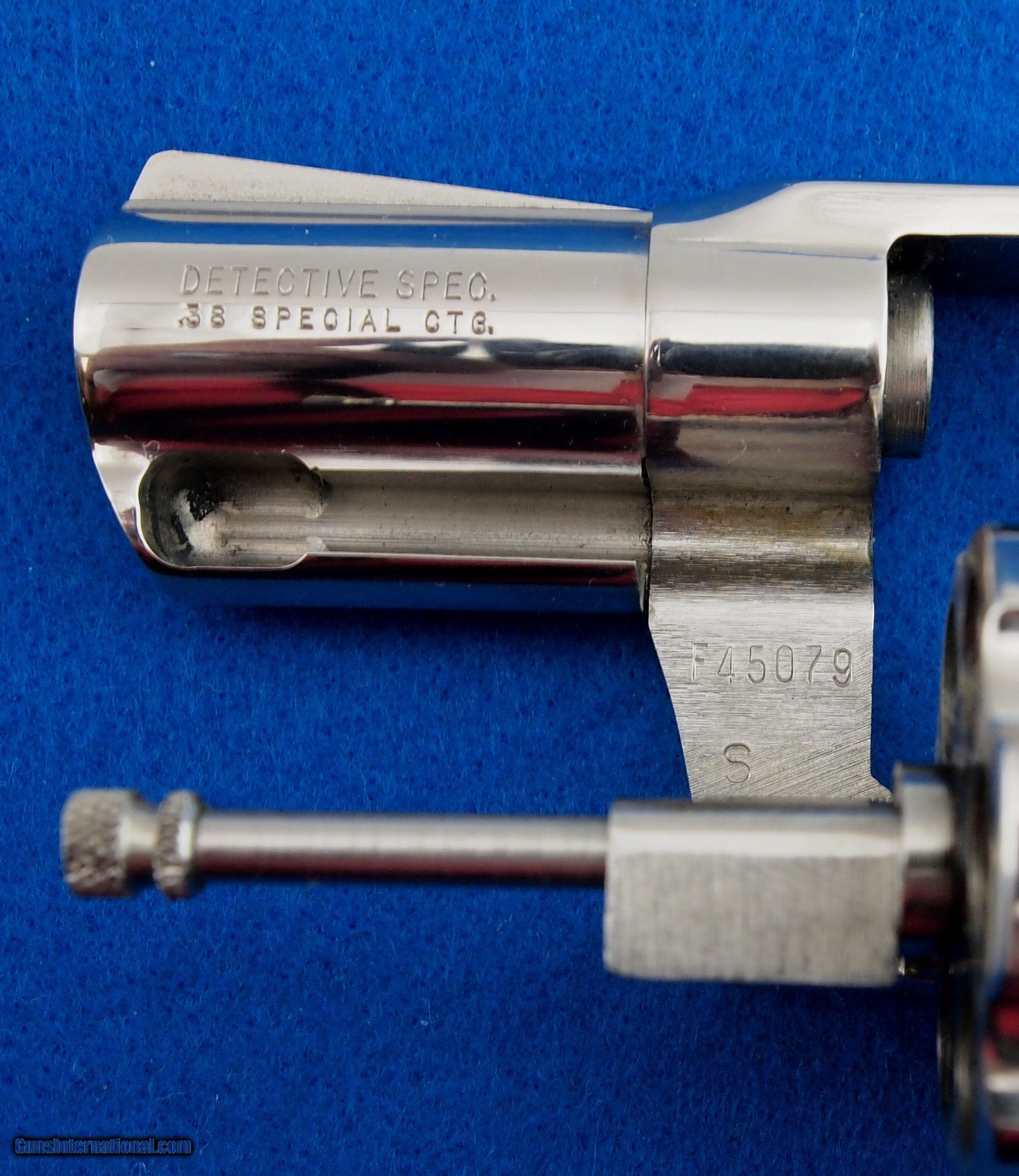 Description: Colt Detective Spec. Nickel MFG 1974 .38 SPL, 2" bbl, bright shiny bore, good rifling, square notch rear sight, serrated ramp front sight, and nice checkered hardwood grips. Very clean revolver! Add 3% for Credit Card Shipping $25.00 SOLD |