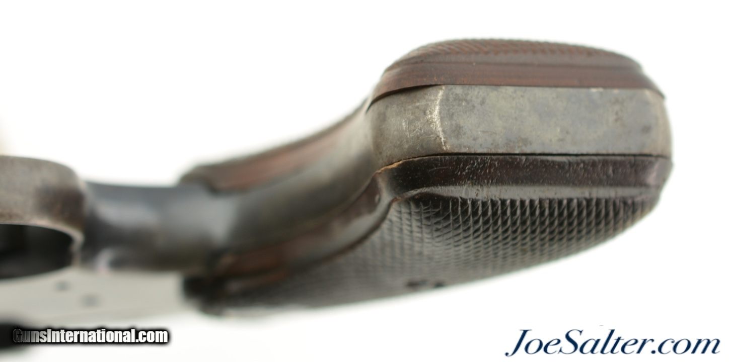 Description: Serial #837494, .38 Special, 2" barrel with a fine, bright bore that has a couple of specks of freckling within the grooves at the muzzle. This is a 1963-made revolver that has retained 70-75% of the original blue finish, with the balance faded to gray along the projections and bearing surfaces. Some specks of mild freckling are also present at the muzzle and on the front of the cylinder, with a light turn-ring on the rear of the cylinder. A Colt-marked hammer shroud is installed on the rear of the frame. The checkered walnut Colt medallion grips are in fine shape with only light wear and flattening of the points, mainly at the butt on either panel. The lock-up is still tight, and the action functions smoothly in both single and double-action. This is a very nice 2nd Issue Detective Special with a desirable factory add-on, and is in very good plus condition overall. FFL or C&R; SOLD Curio/Relic: Yes |