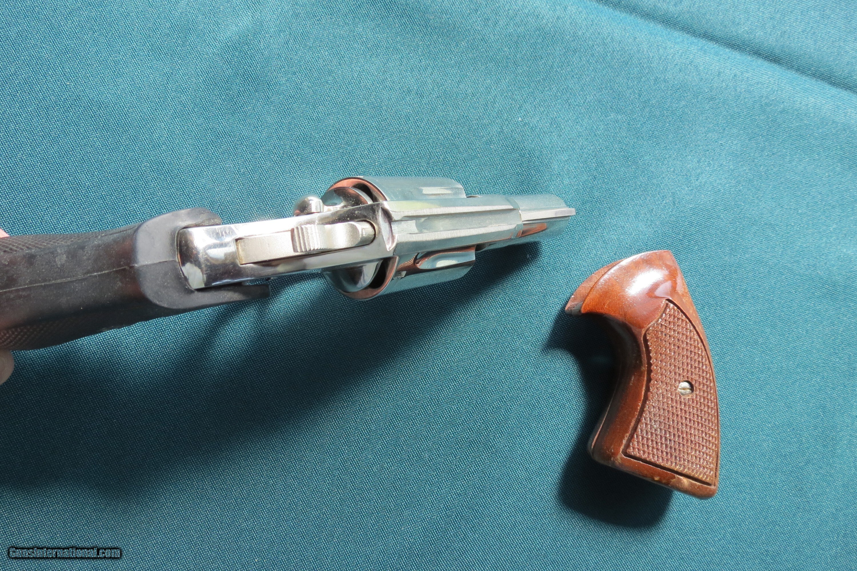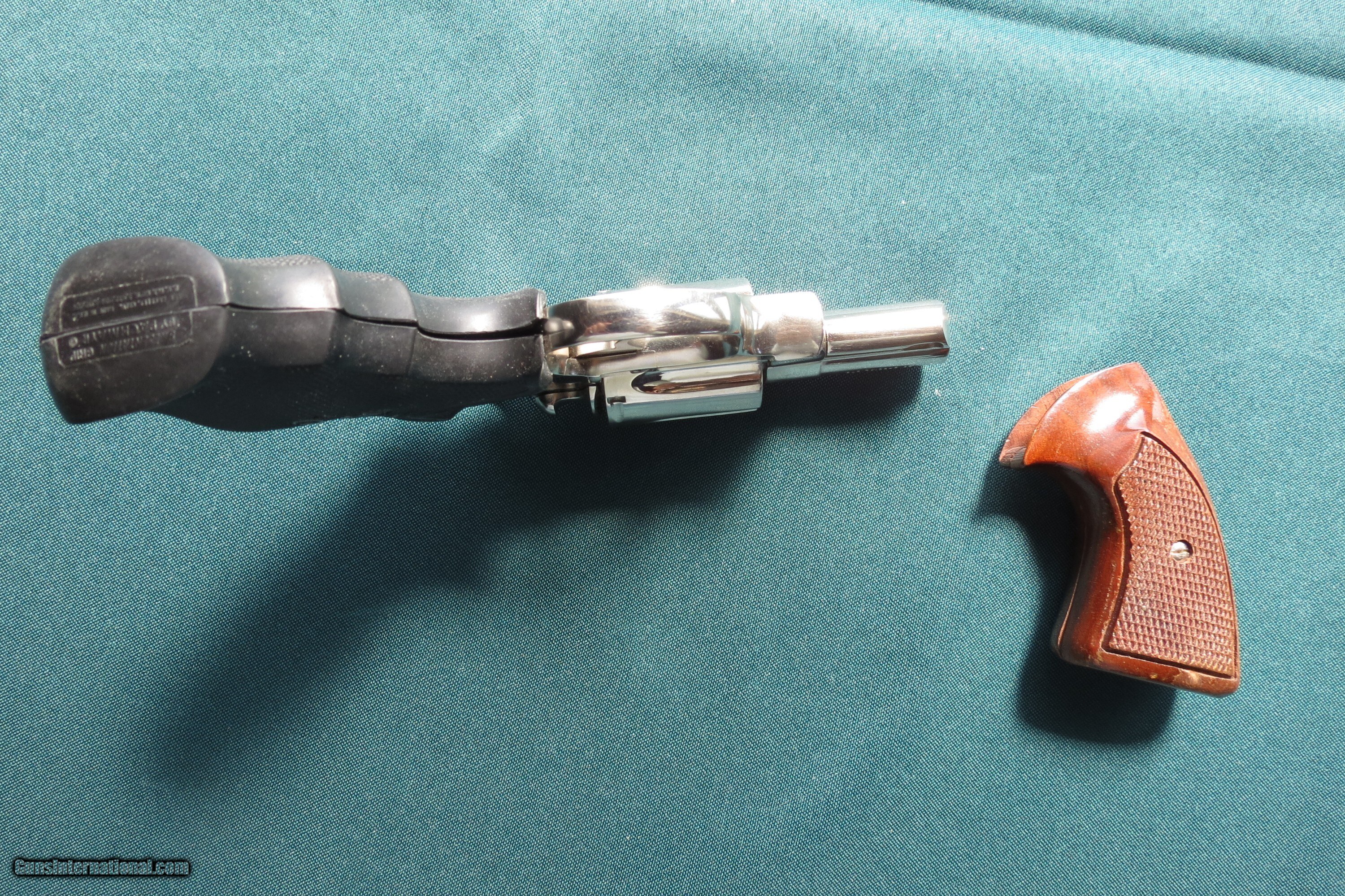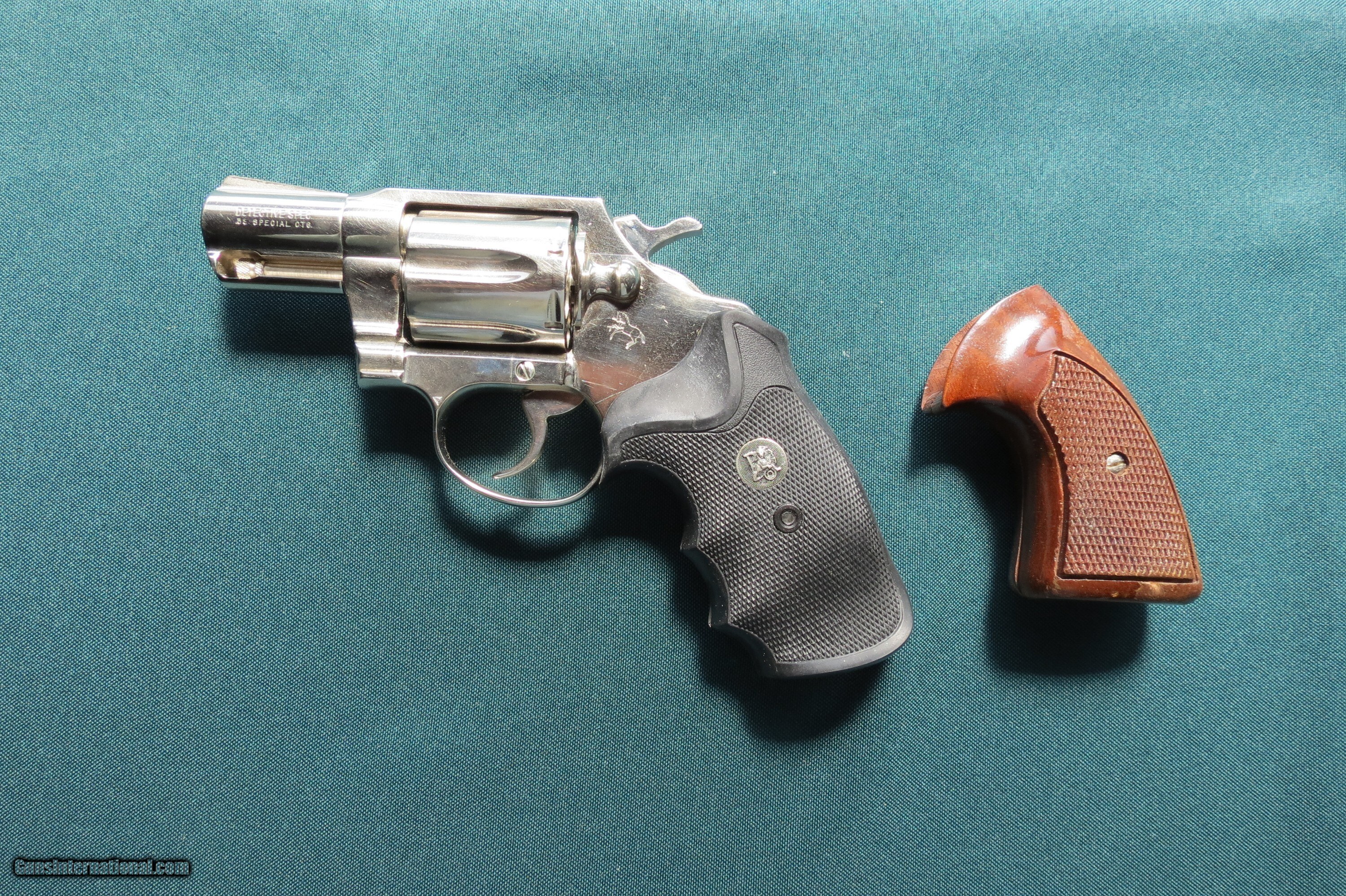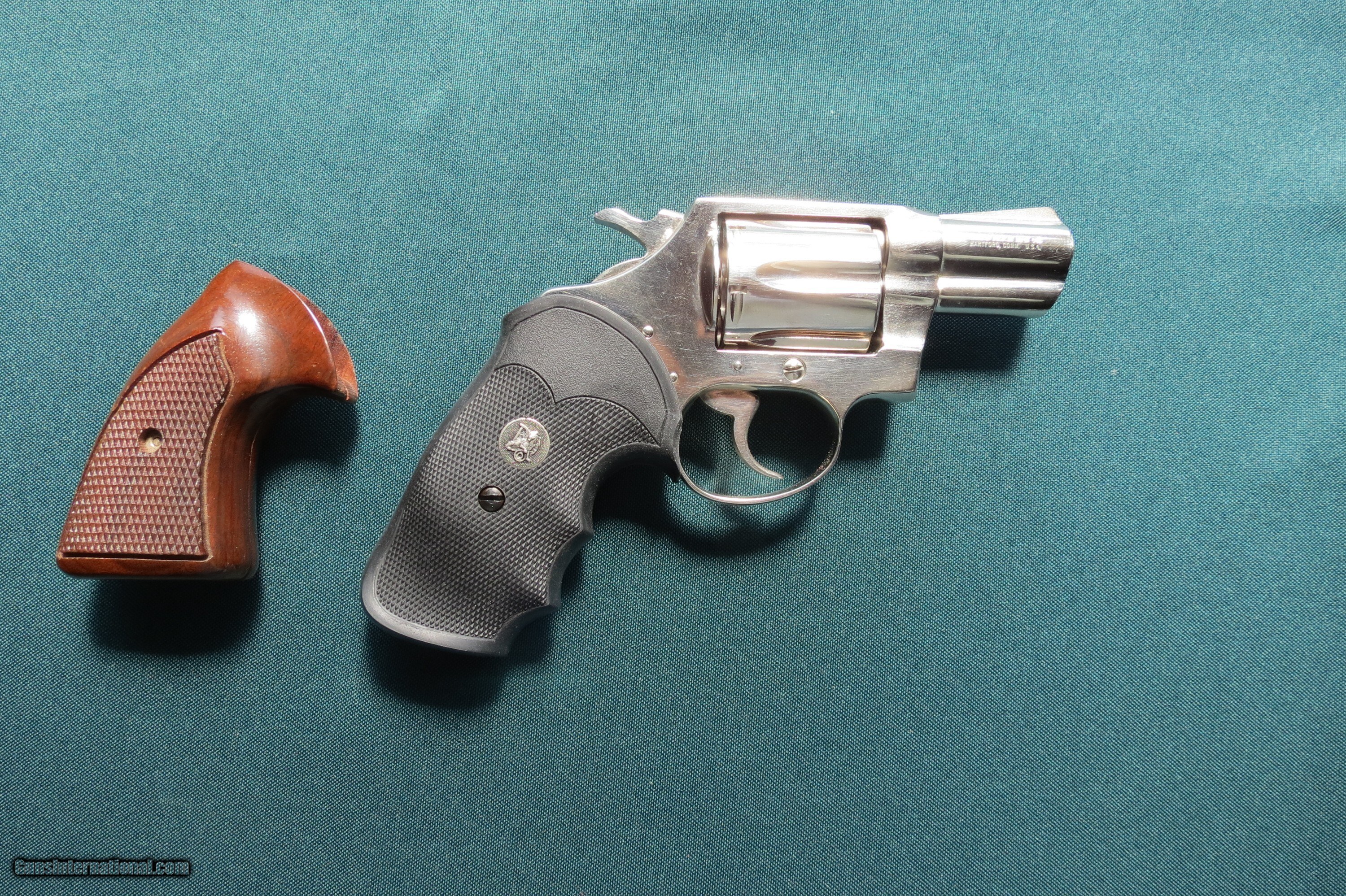 Description: Colt Detective Special in 38 Special, 2" Barrel, Shrouded ejector rod, Integral ling serrated ramp front sight, Pachmayr decelerator grip, Origonal wood grip, Nickel finish. Revolver shows to be in excellent condition. Shipping $35. SOLD Handgun Caliber: .38 Special Manufacturer: Colt Model: Detective Special Barrel Length: 2 Condition: Excellent |