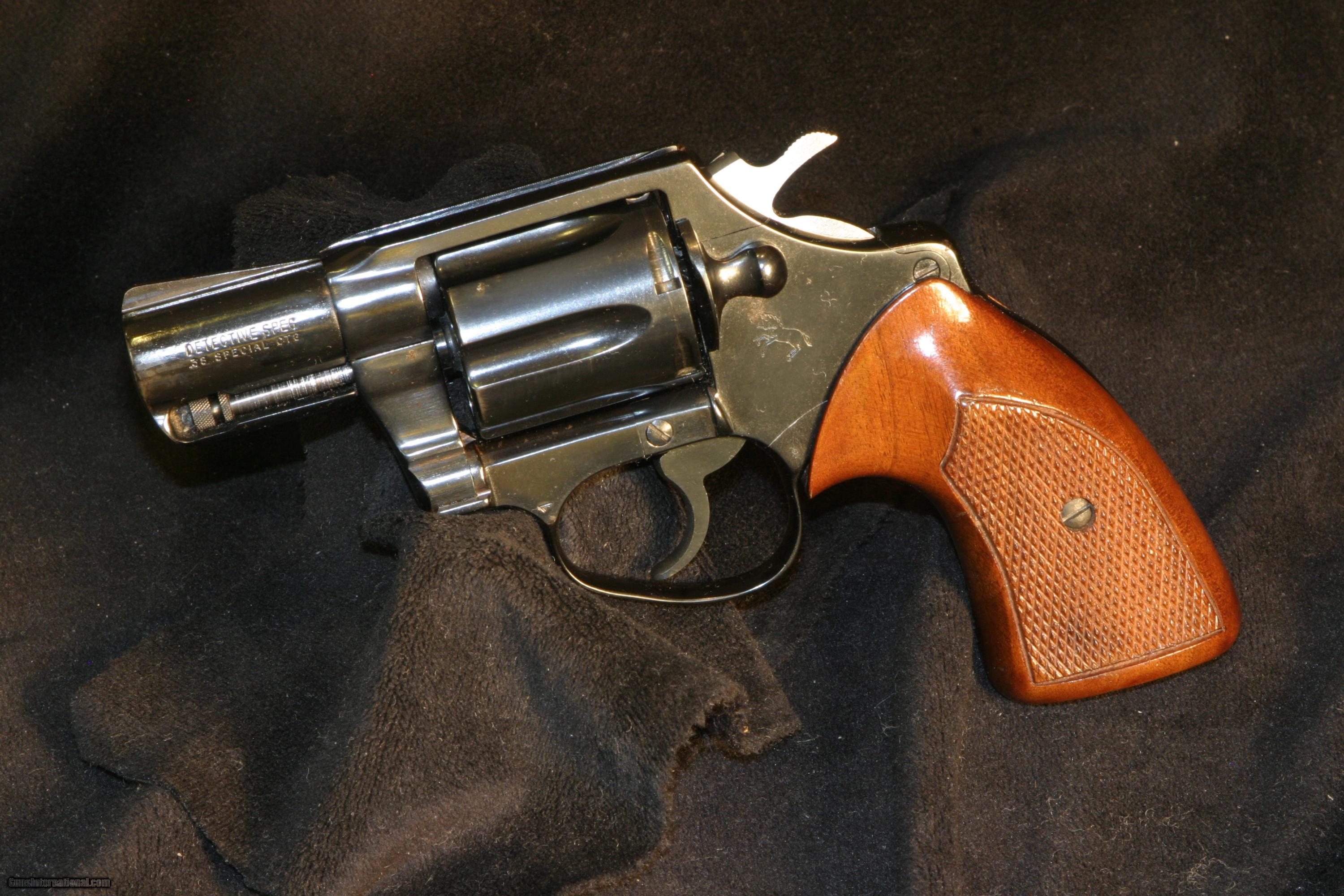 Description: A 1974 DETECTIVE SPECIAL IN .38 SPECIAL. 2" SHROUDED BARREL,WRAP-AROUND WOOD GRIPS. 95% OVERALL, A LITTLE MUZZLE WEAR,6 SHOTS VERY NICE CLASSIC! SOLD |