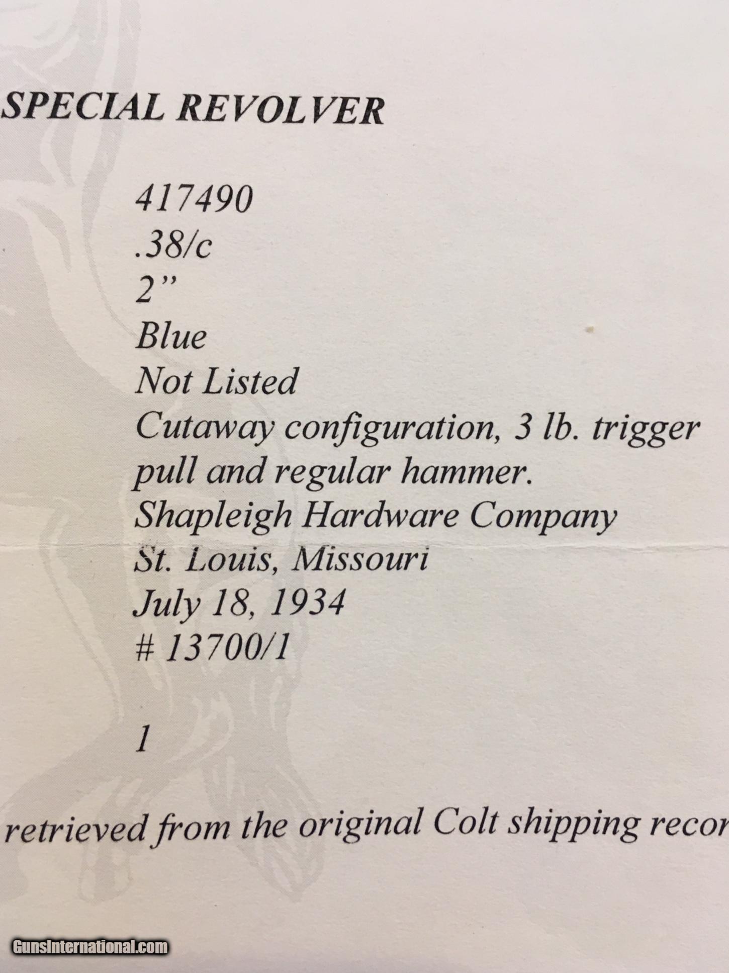 Description: Colt Detective Special FITZ , This detective special Fitz is a special order shipped in 1934 in a one gun order. Shipped to Shapleigh Hardware Company , St.Louis, Missouri July 18th 1934. The proper Colt Factory letter as you can see describes the Ser # 417,490 and all the other information about this piece. Note the words Cutaway Configuration , this is usually the only words that describe a Factory Fitz, but this special order also says 3 lb trigger pull and the regular hammer ( not the bobbed hammer). . This is a real Factory Fitz original and a seldom seen gun for sale.. It comes with The letter and the Fitz Book as well. Its the original 1930 published book by him. Its in great mechanical condition super bore and cylinder. Locks up tight, very nice grips, the usual holster wear and some cylinder edge wear.Probably carried buy a detective or police officer?? Still a lot of original blue both on the front and back straps,roughly 90% or better. Not many original lettered fitz's out there. call with any questions, Tom 612 859 5673 SOLD Curio/Relic: Yes |