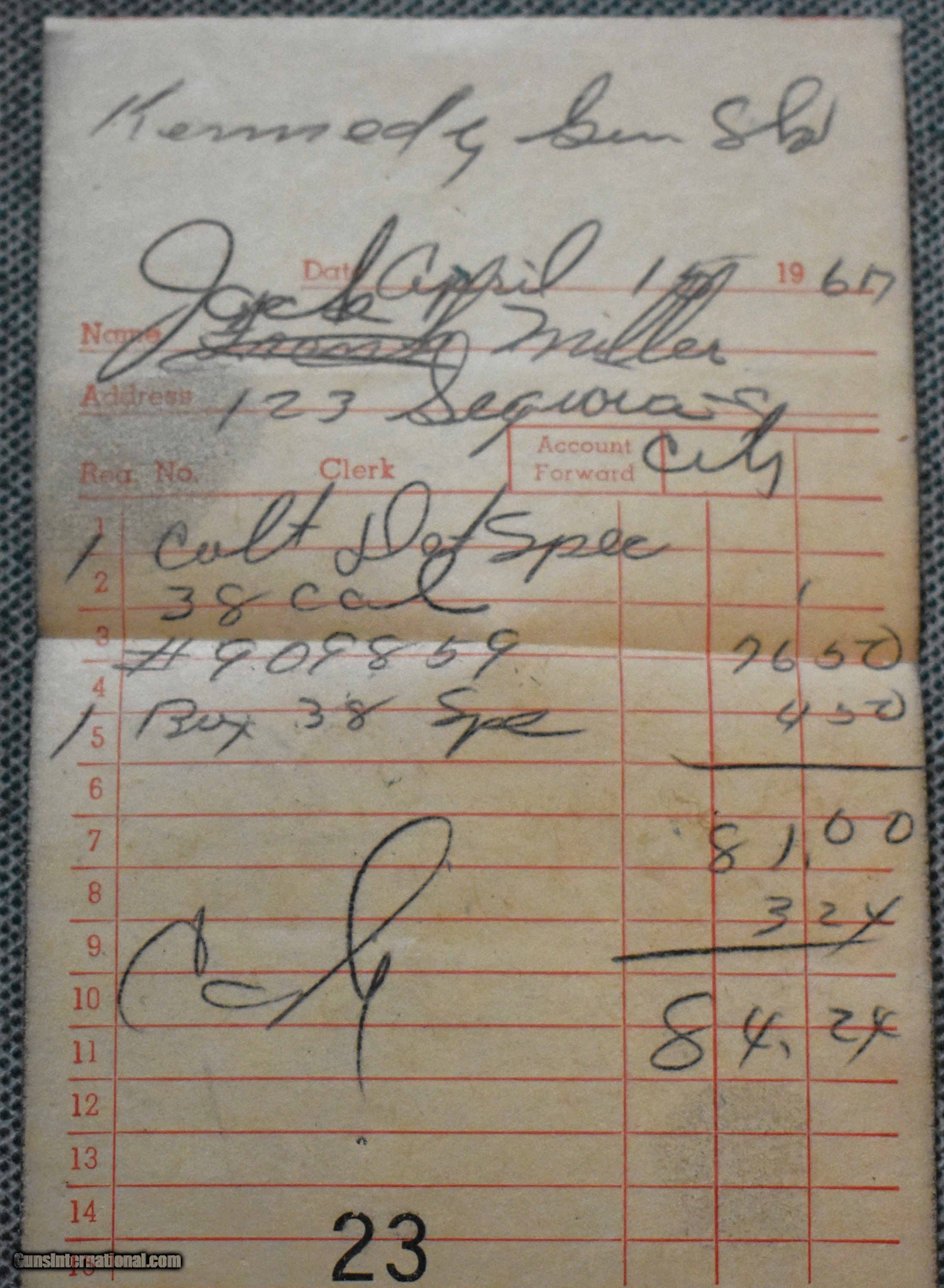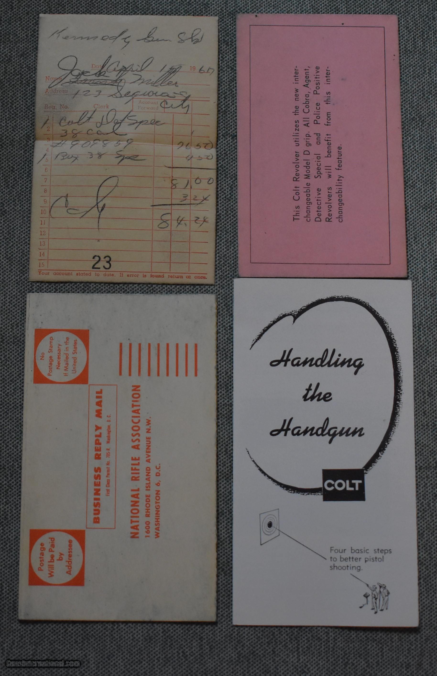 Description: Colt Detective Special in 38 special. Built in 1966,this revovler is in mint original condition. It retains 100% of the original blue finish and the checkered wood grips show no wear at all. It comes in a period correct box with manual,warranty card,and the original purchase receipt dated 1967. The box is not numbered to the gun but I am convinced that it is the box it was sold in originally since the receipt and other paperwork match the gun. These early style detective specials are getting hard to find in this condition. C&R eligible. SOLD Curio/Relic: Yes Handgun Caliber: .38 Special Manufacturer: Colt Model: Detective Special Serial Number: 909859 Barrel Length: 2 Condition: mint Metal Condition: mint Wood Condition: mint Bore Condition: mint Action: Revolver Manufacture Date: 1966 |