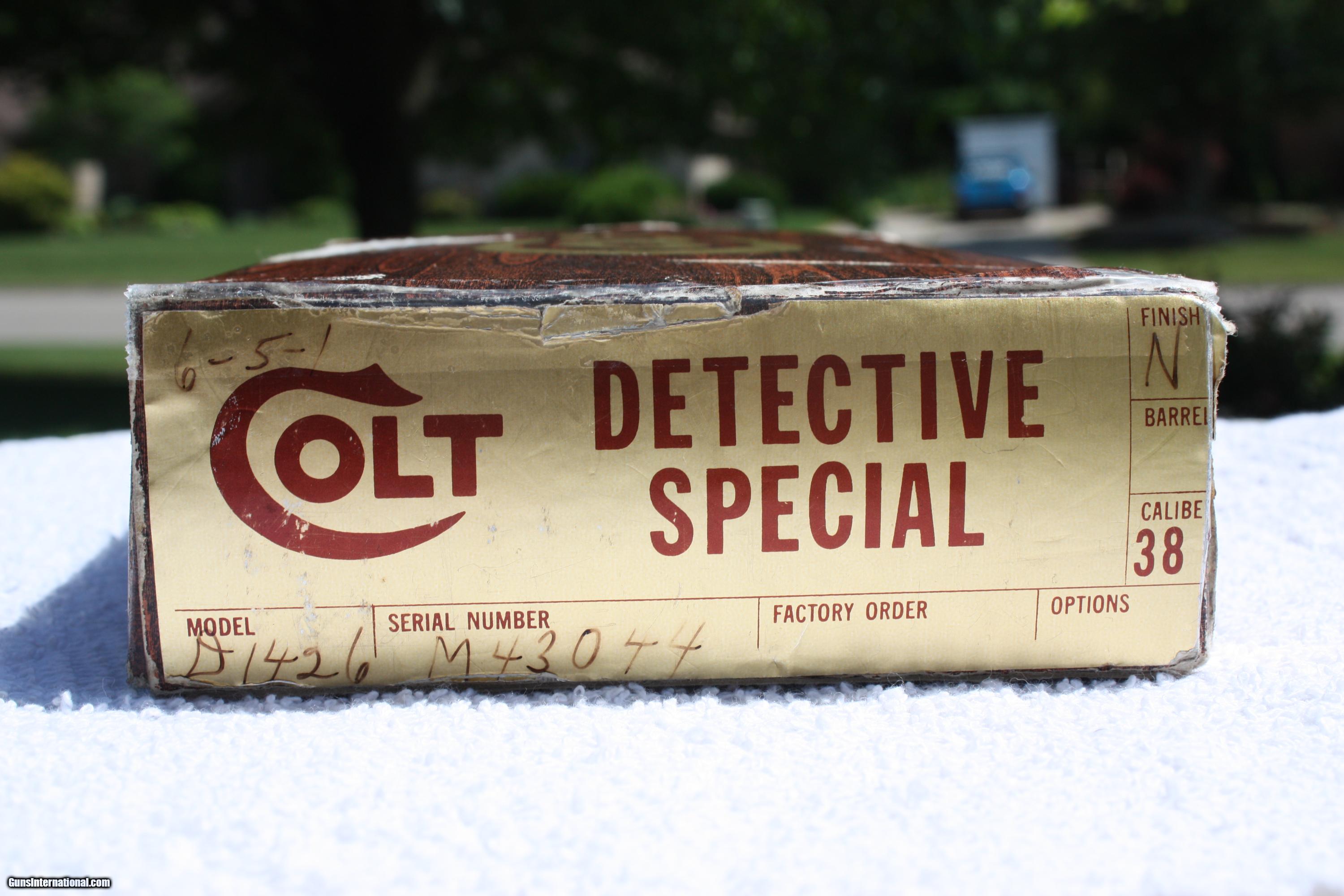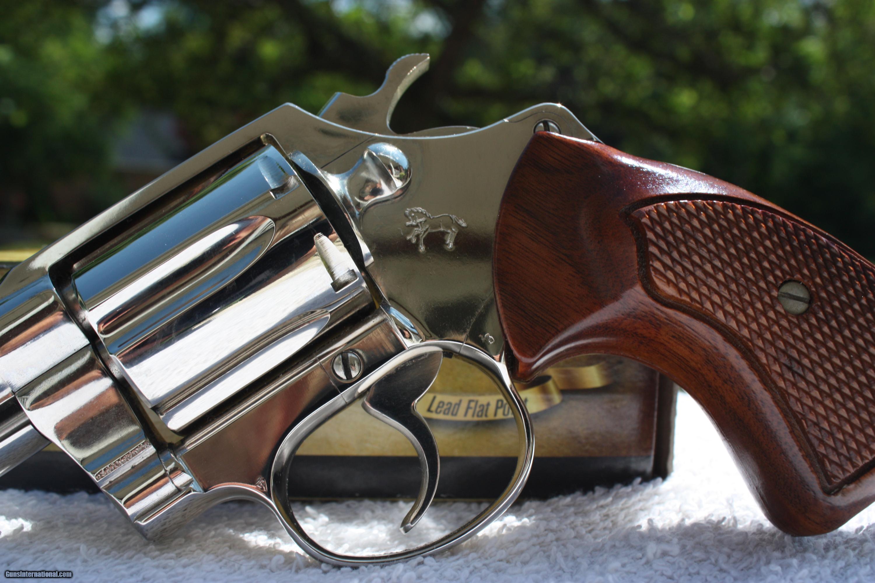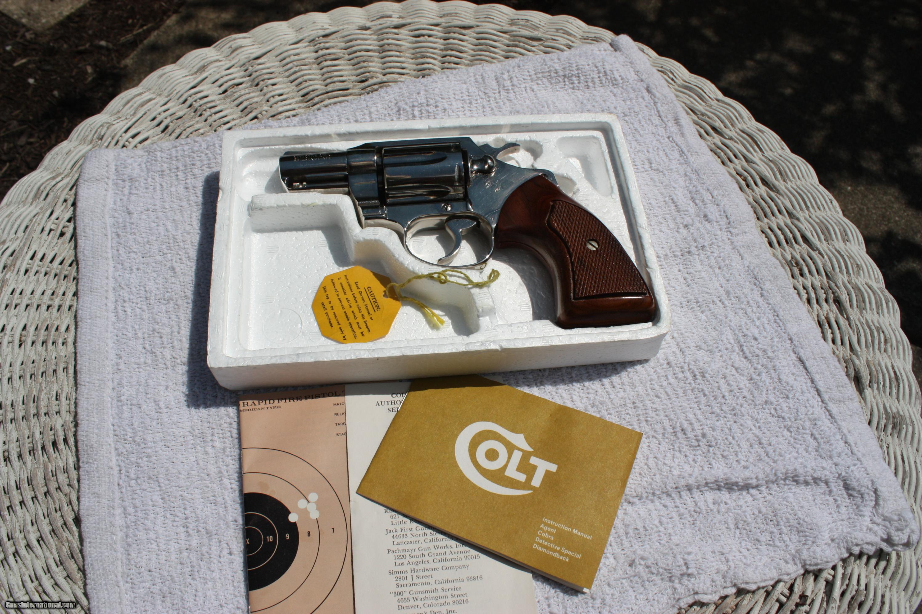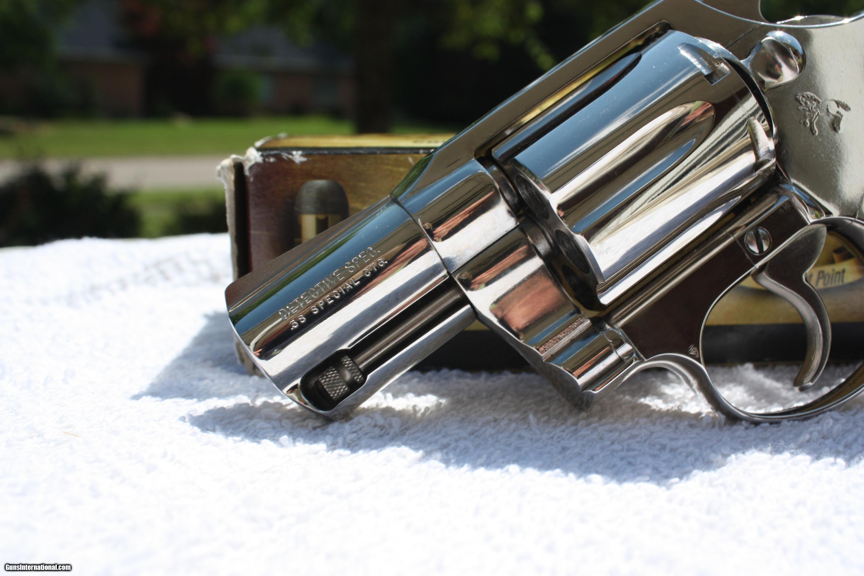 Description: Colt Detective Special chambered in .38 special. Original nickel finish with original wood grips. Gun is serialized to original colt box, with all paperwork and hangtag. Gun is near perfect, box is a bit tattered and has some tape on it. But its all there.!! Nice collector piece. 50.00 ship/insured fee SOLD |