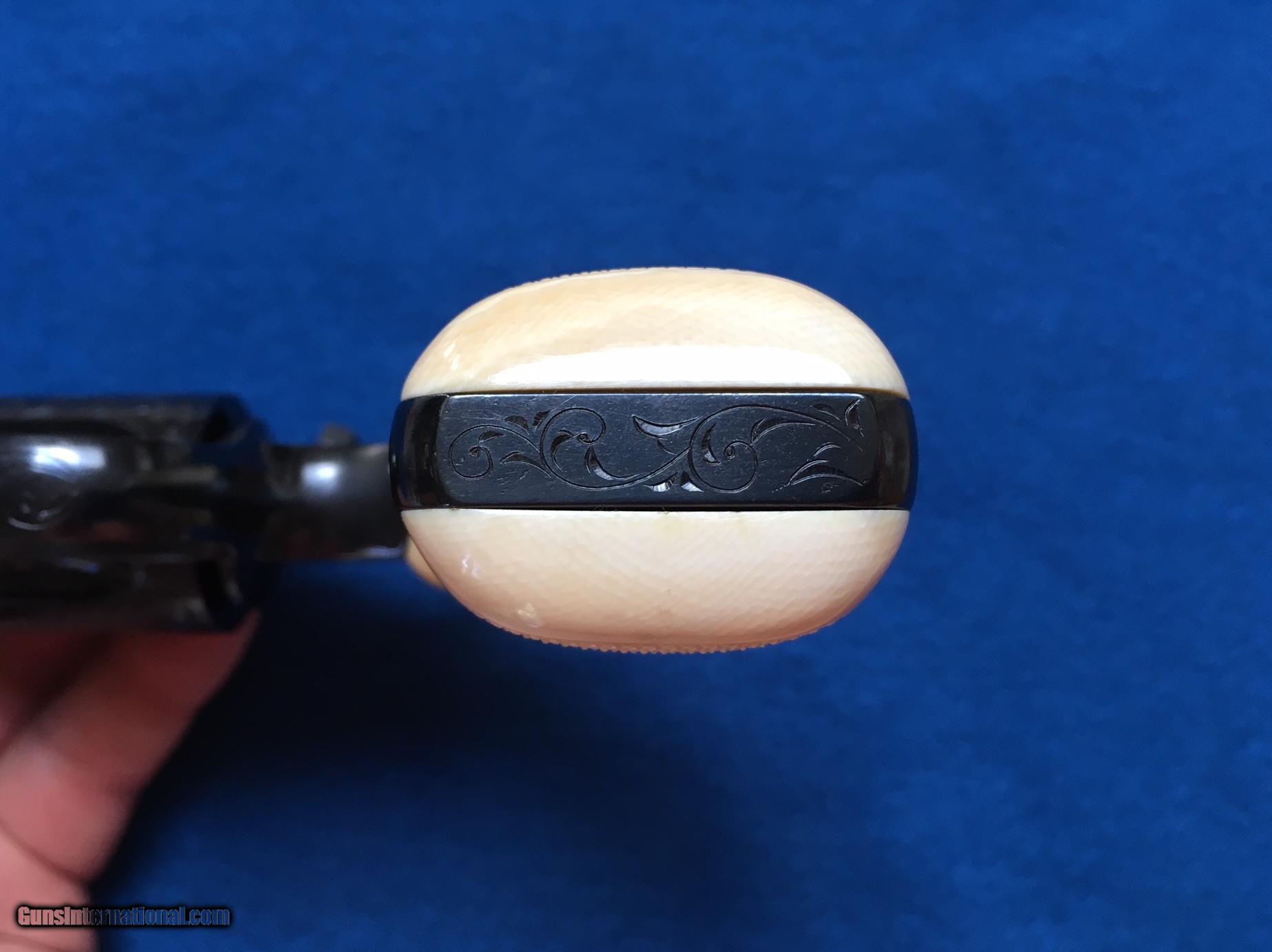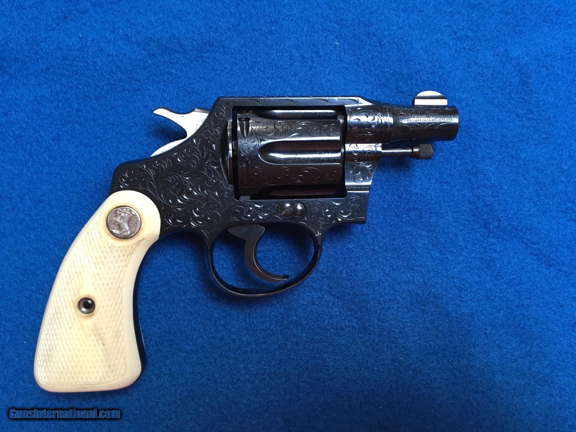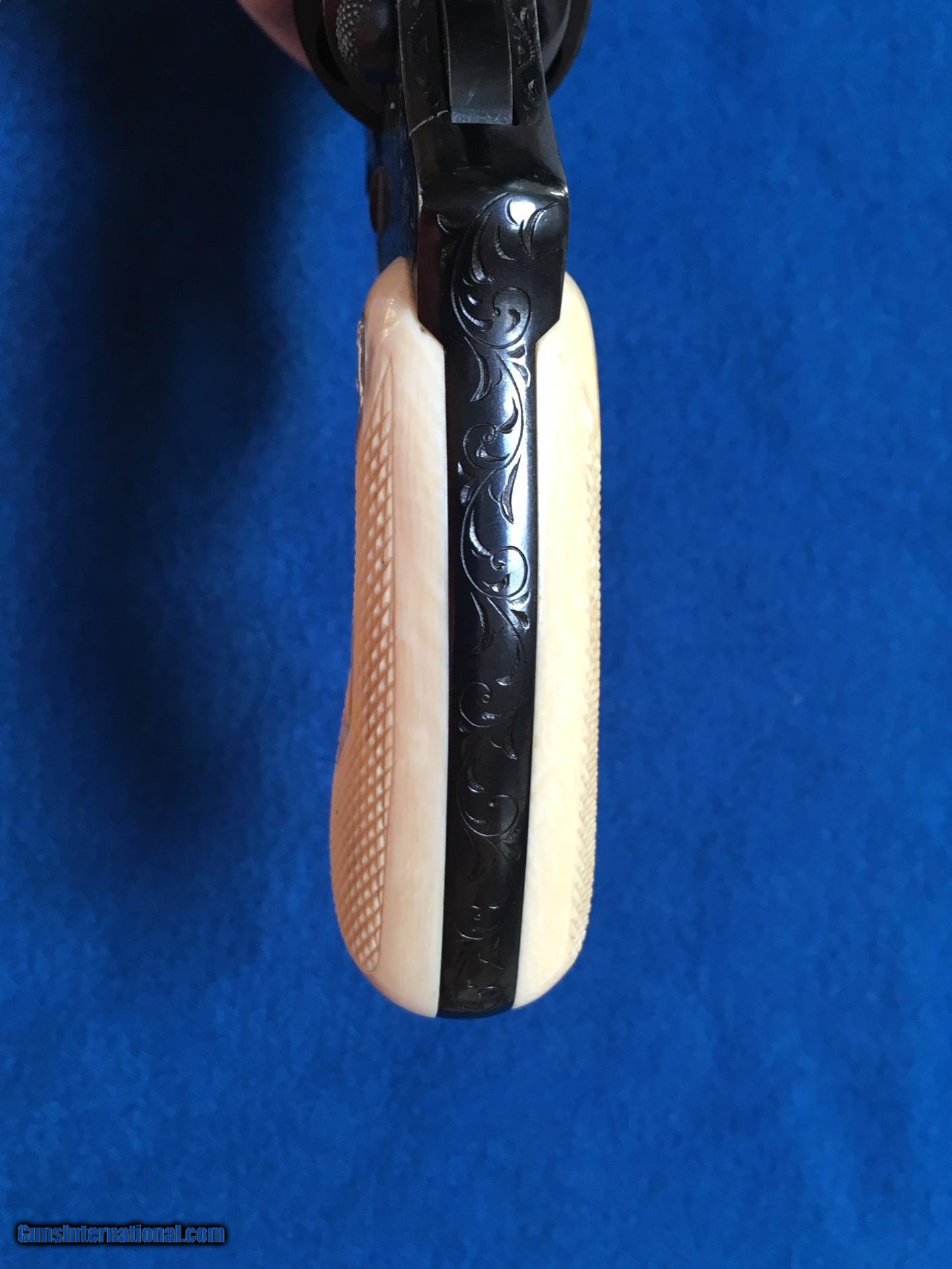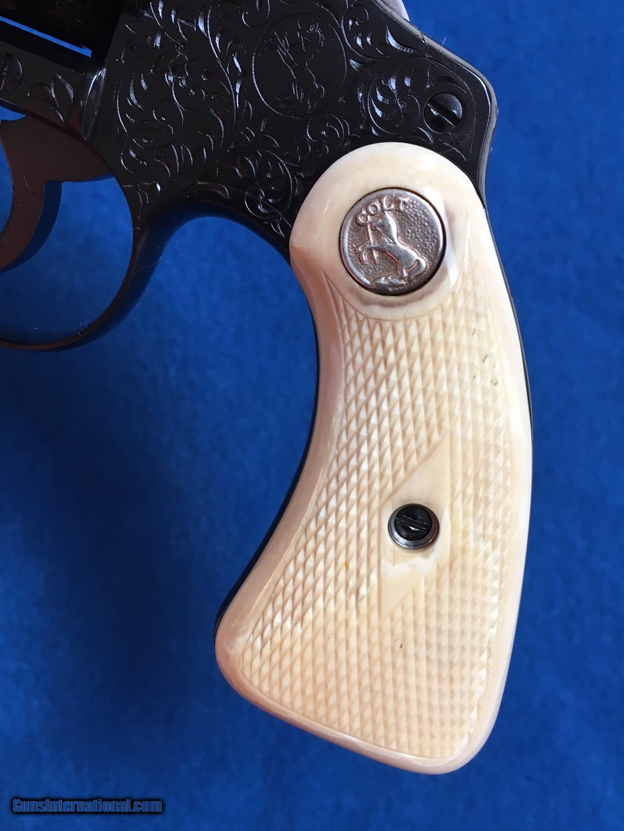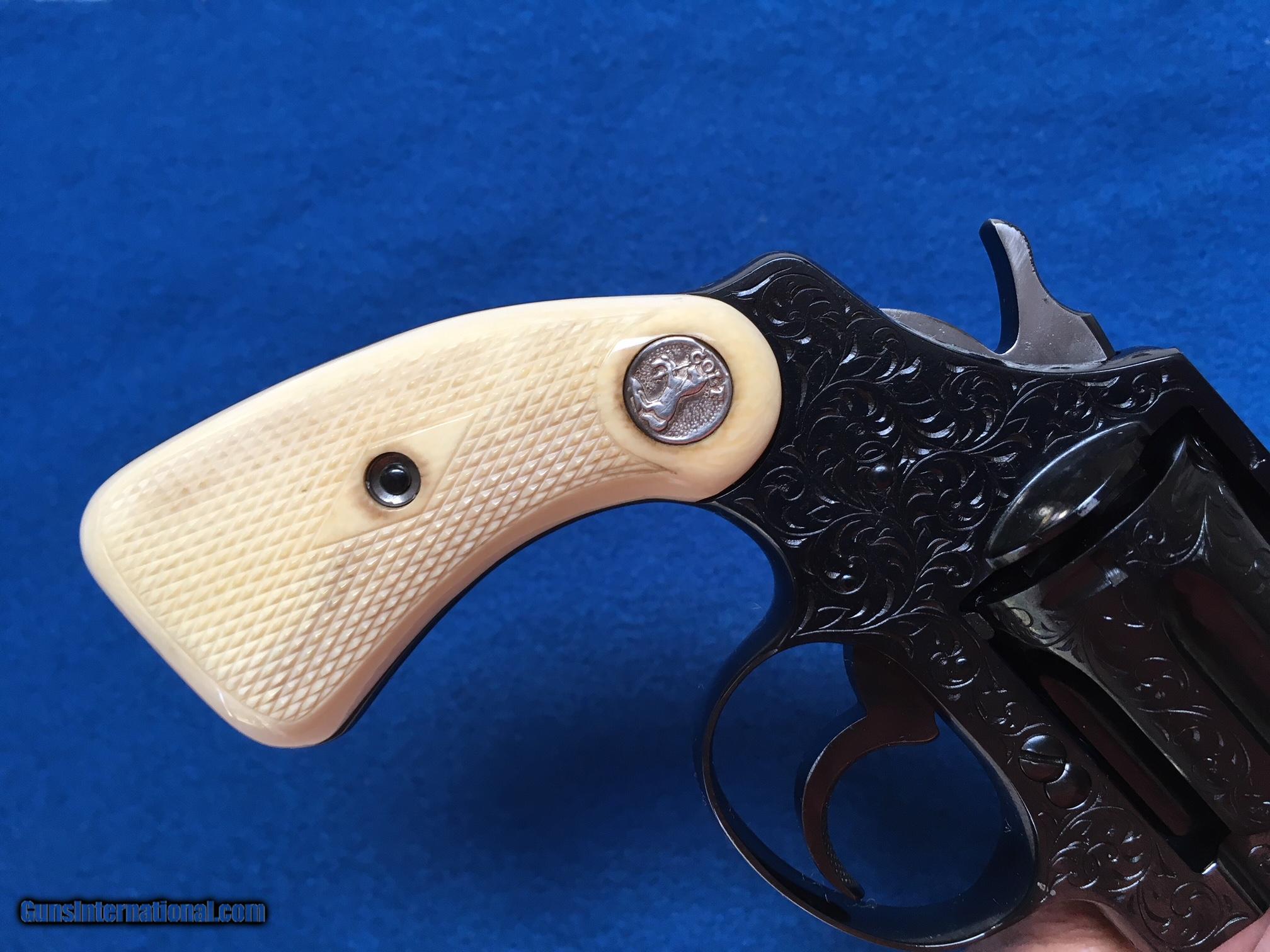 Description: Very nicely engraved Pre war Detective Special round butt, professionally engraved by Master Engraver Phil Quigley. His signature engraved on the lower frame in front of the trigger guard . This piece was made in 1935,ser# 442,103. Grips are real Ivory not imitation, checkered with Colt medalions that are perfectly fit to the gun. The Bore is minty as well as the cylinder. Action is excellent and locks up tight in Single and double action. Looks as though not fired after engraving. All correct and matching gun . A nice addition to a colt Detective Special or snubby collection. Call with any questions, Tom 612 859 5673 SOLD Curio/Relic: Yes |