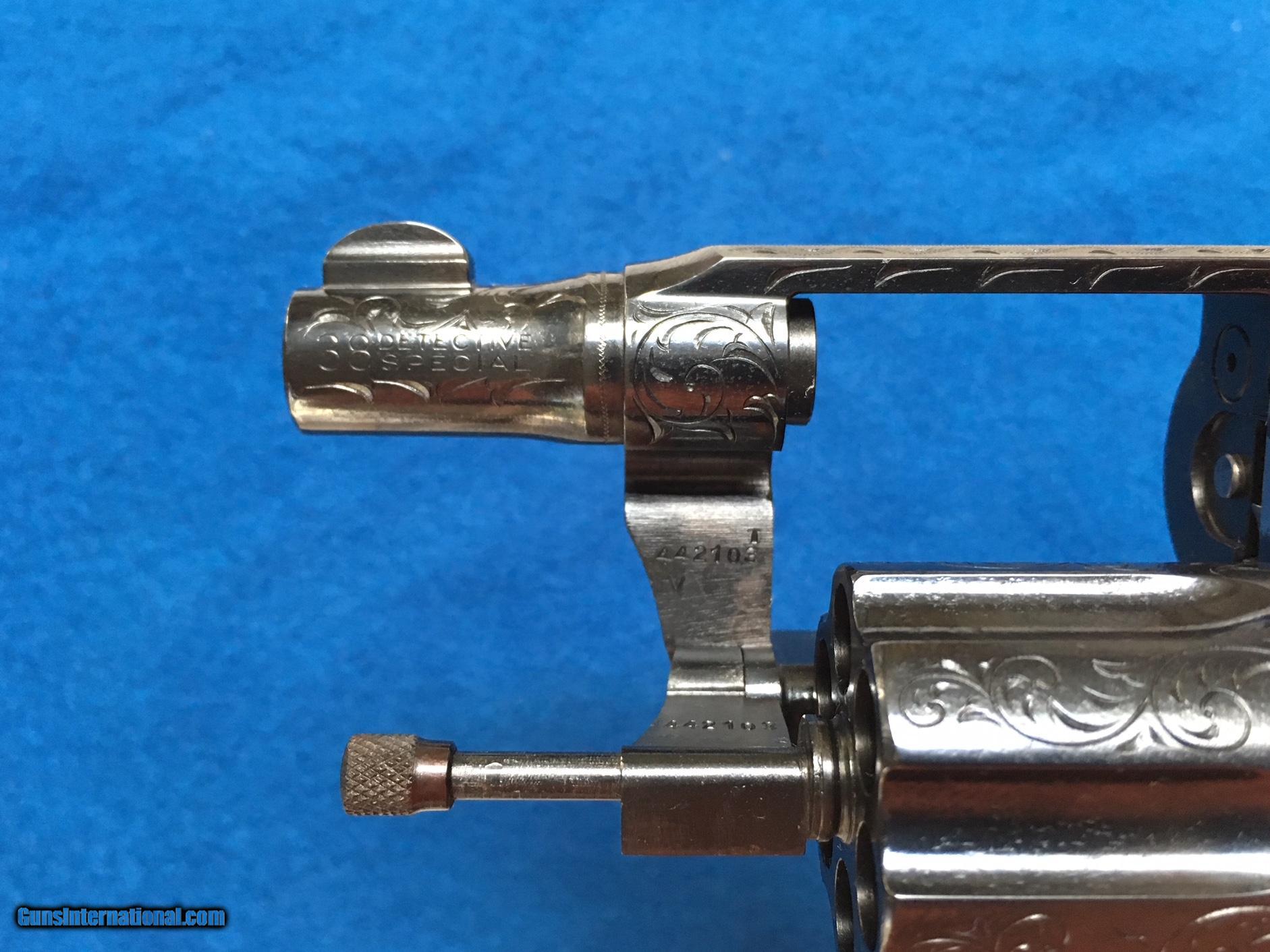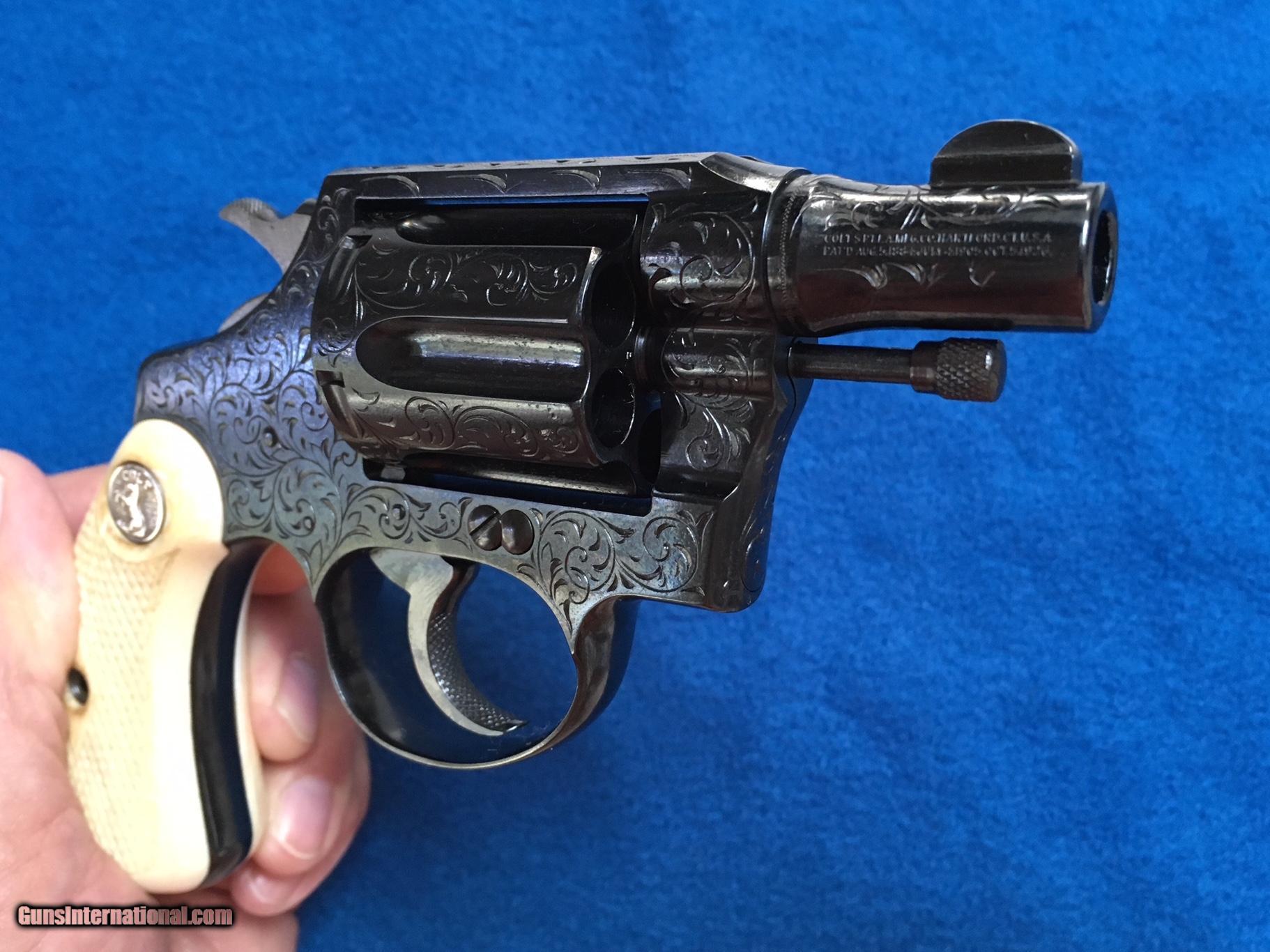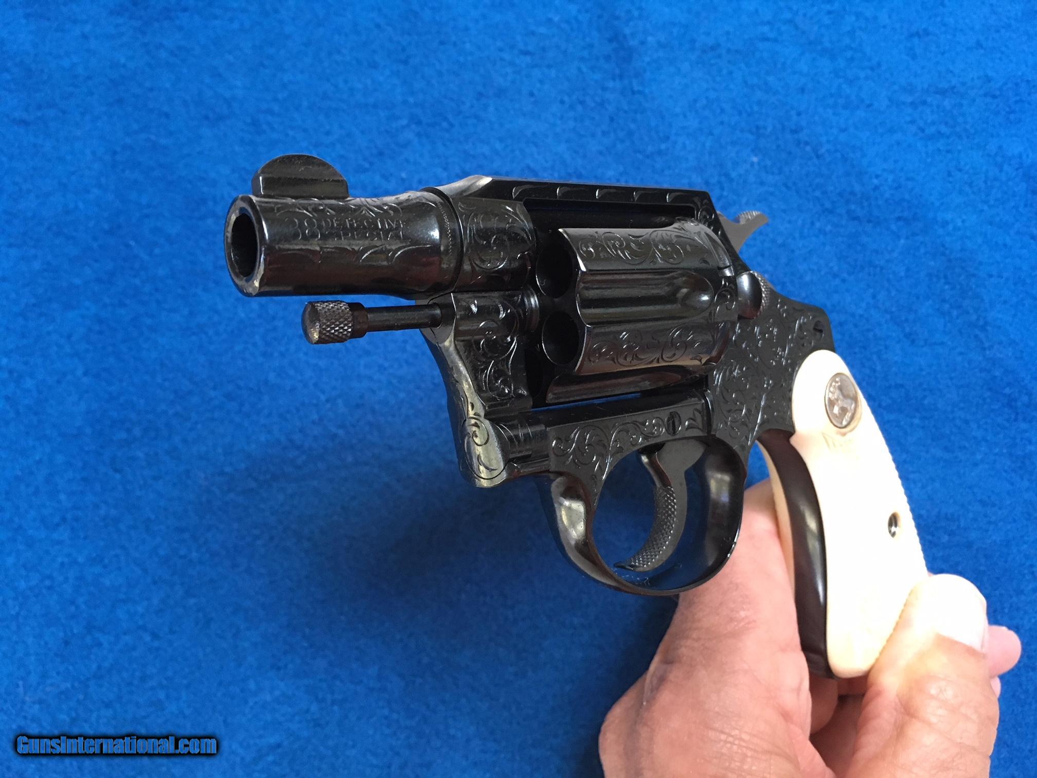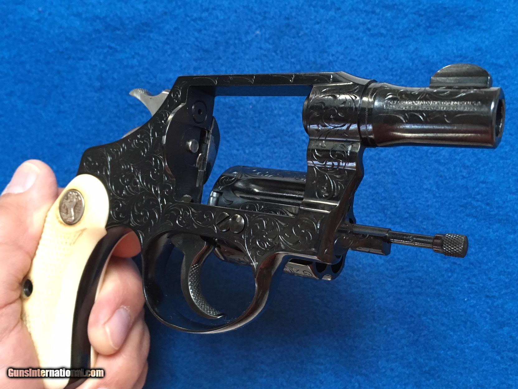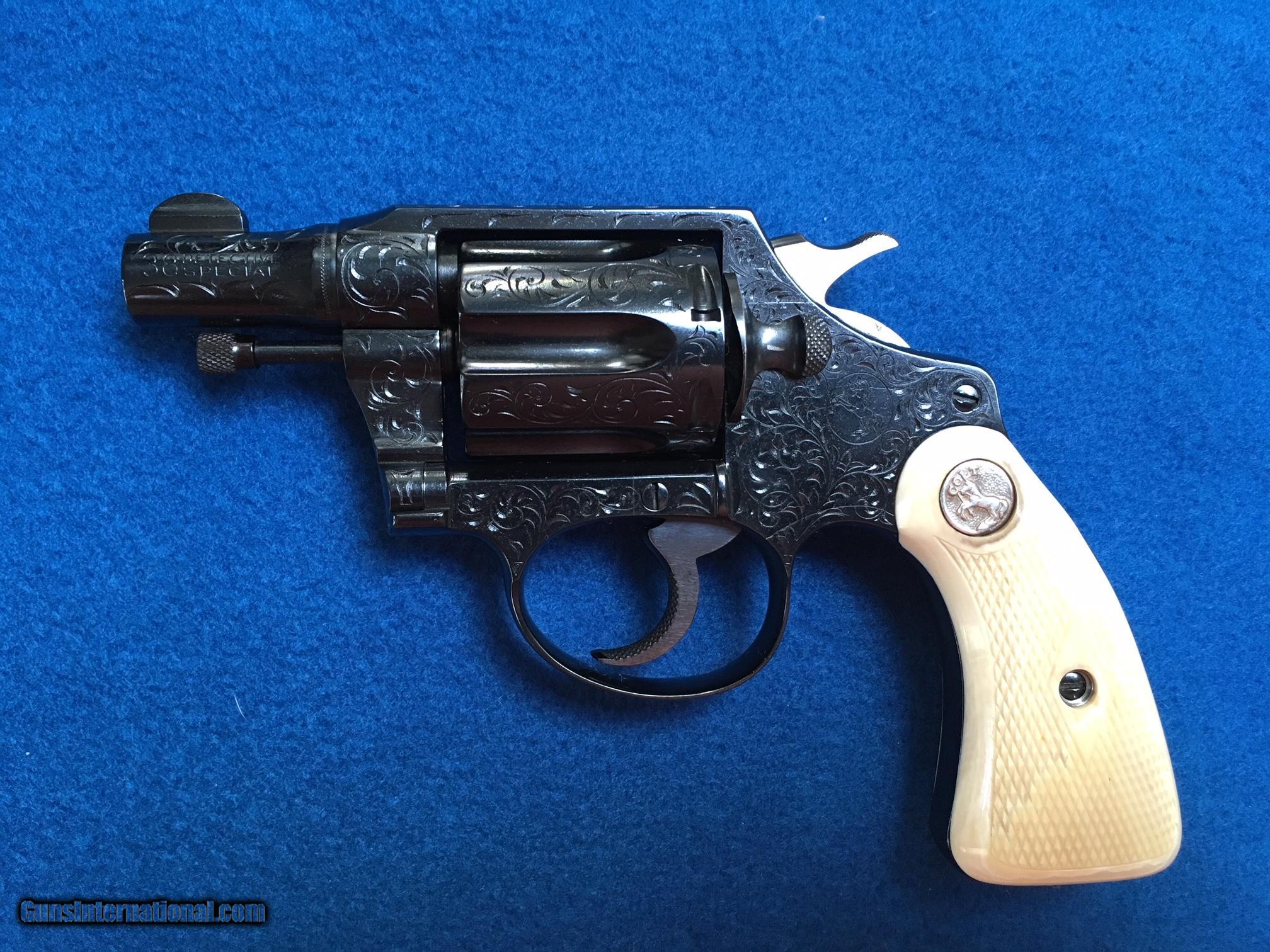 Description: Very nicely engraved Pre war Detective Special round butt, professionally engraved by Master Engraver Phil Quigley. His signature engraved on the lower frame in front of the trigger guard . This piece was made in 1935,ser# 442,103. Grips are real Ivory not imitation, checkered with Colt medalions that are perfectly fit to the gun. The Bore is minty as well as the cylinder. Action is excellent and locks up tight in Single and double action. Looks as though not fired after engraving. All correct and matching gun . A nice addition to a colt Detective Special or snubby collection. Call with any questions, Tom 612 859 5673 SOLD Curio/Relic: Yes |