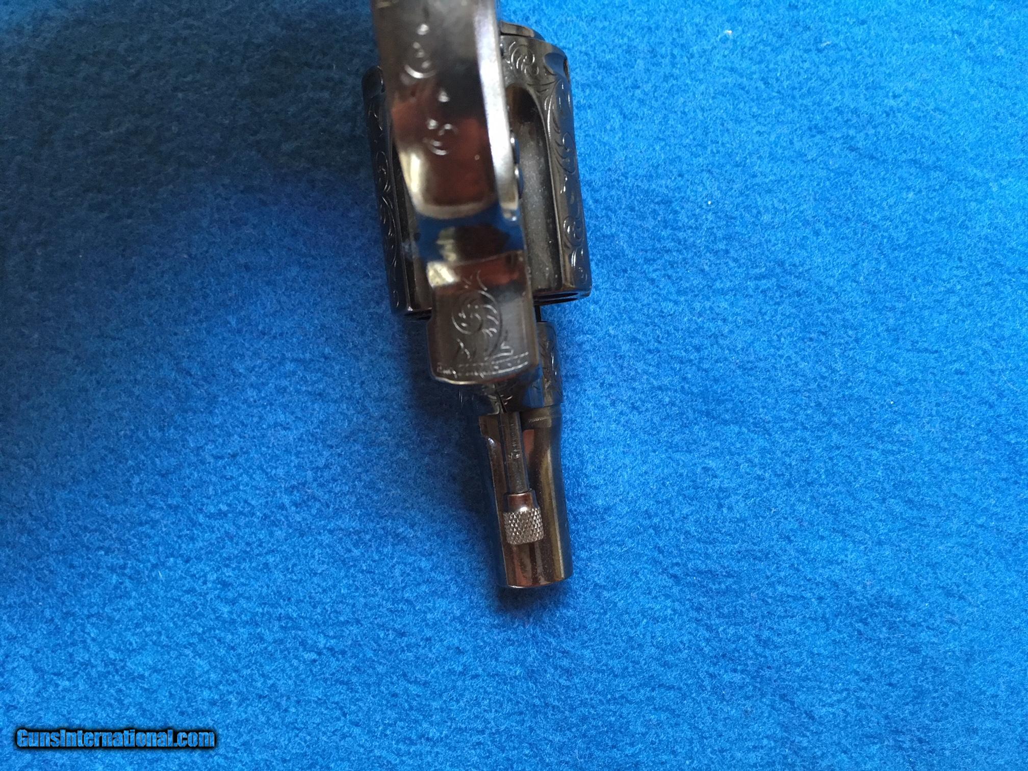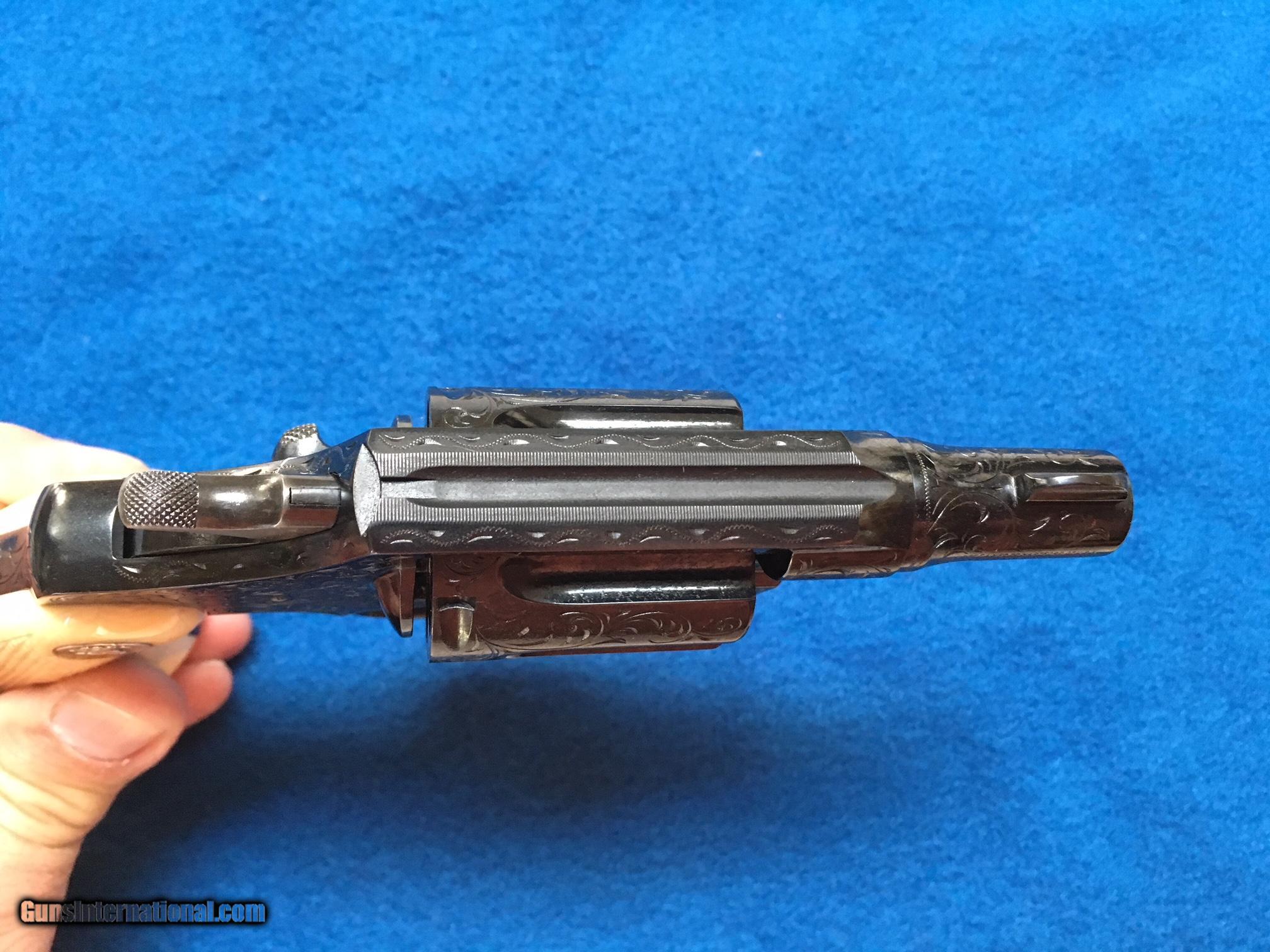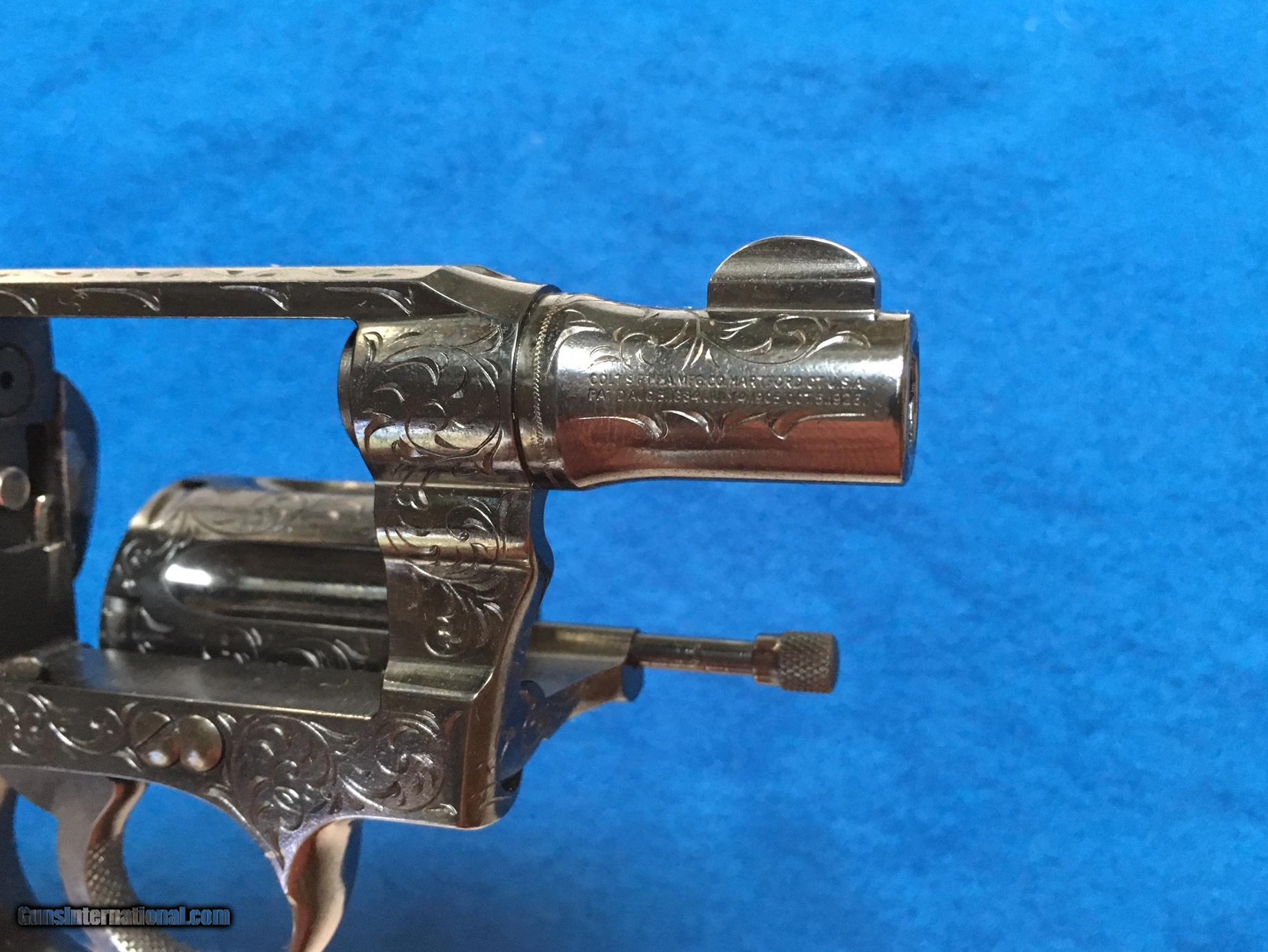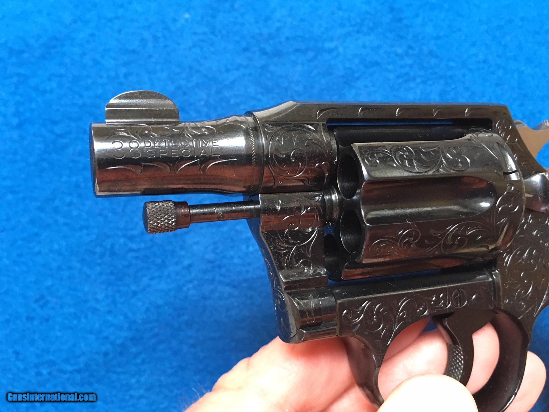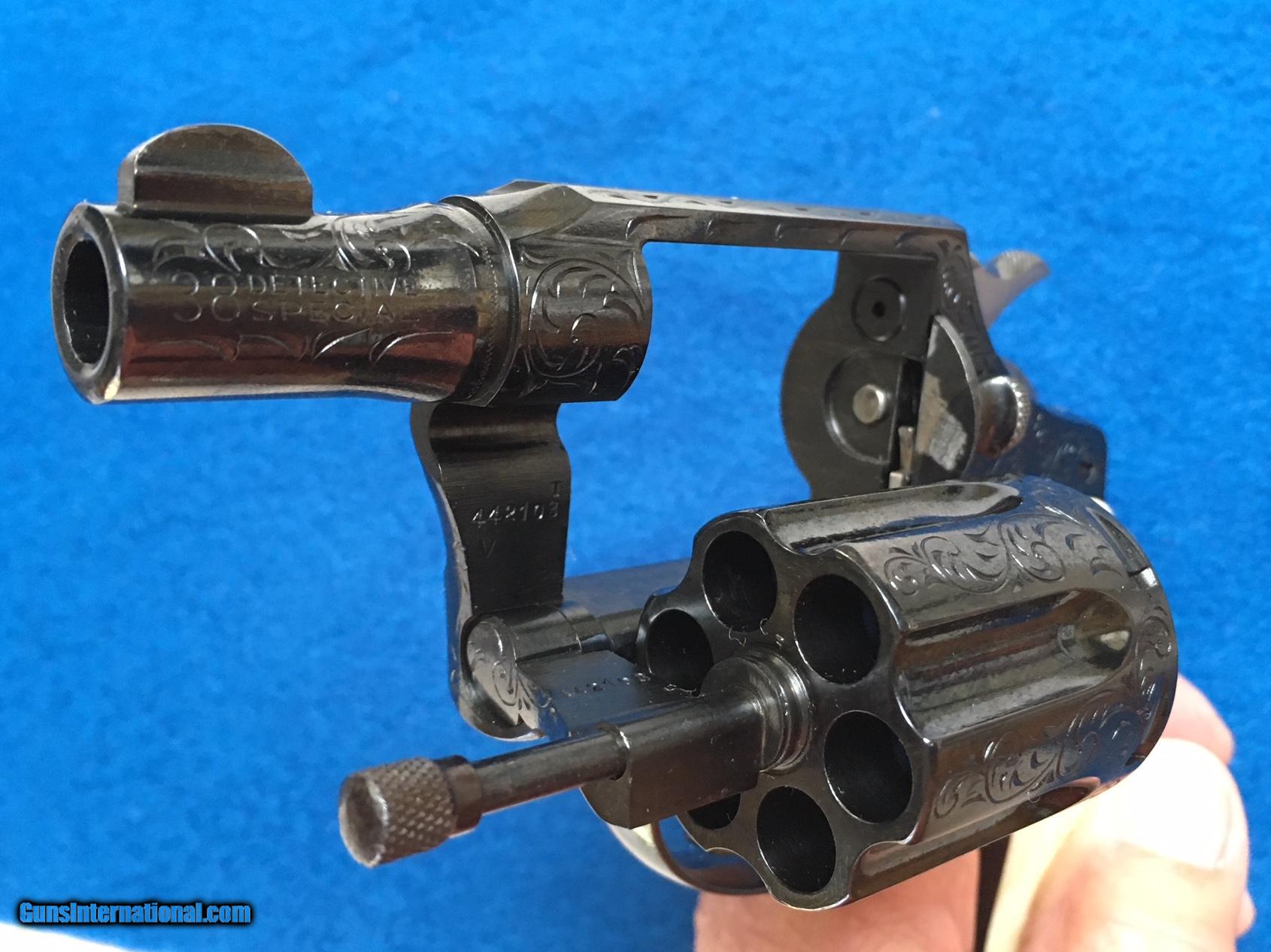 Description: Very nicely engraved Pre war Detective Special round butt, professionally engraved by Master Engraver Phil Quigley. His signature engraved on the lower frame in front of the trigger guard . This piece was made in 1935,ser# 442,103. Grips are real Ivory not imitation, checkered with Colt medalions that are perfectly fit to the gun. The Bore is minty as well as the cylinder. Action is excellent and locks up tight in Single and double action. Looks as though not fired after engraving. All correct and matching gun . A nice addition to a colt Detective Special or snubby collection. Call with any questions, Tom 612 859 5673 SOLD Curio/Relic: Yes |