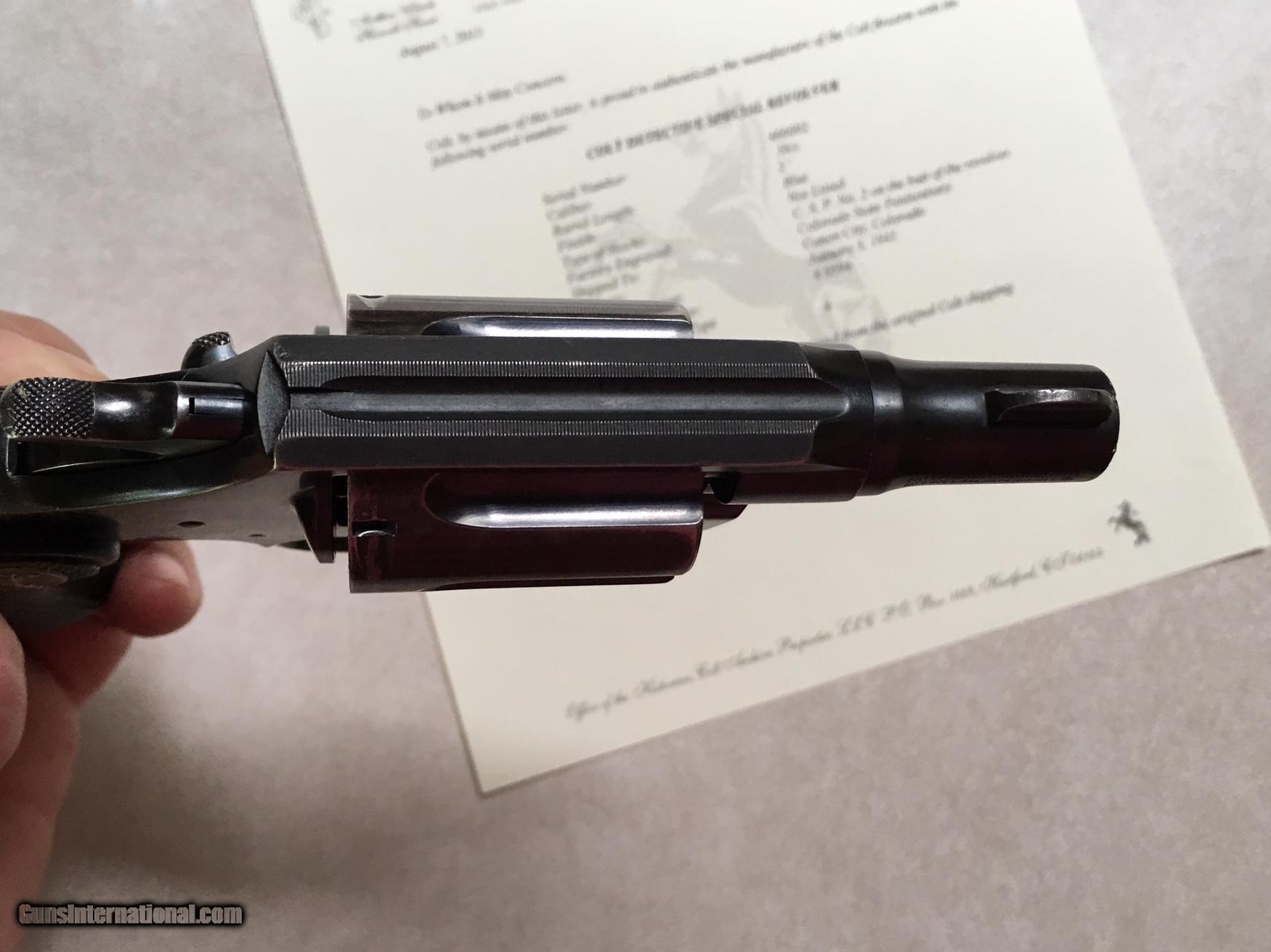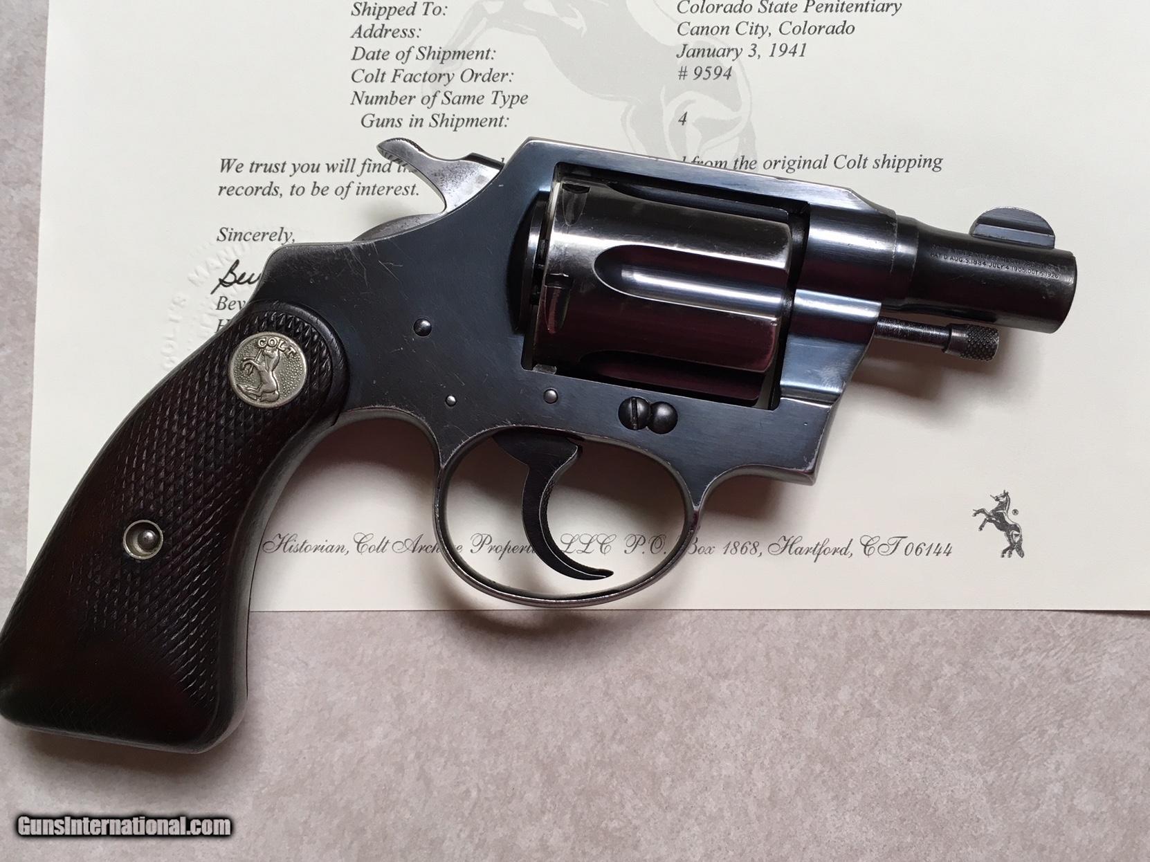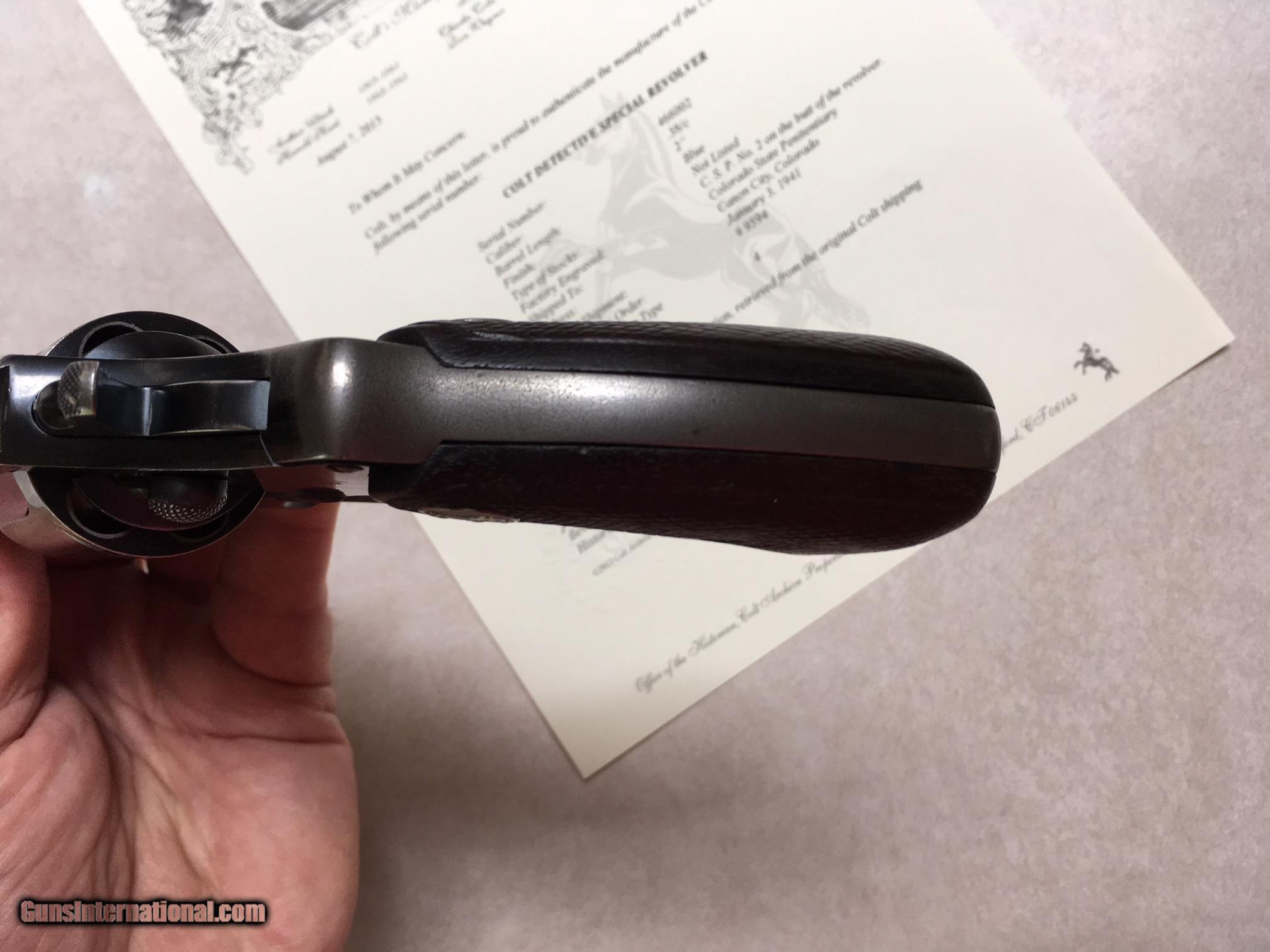 Description: This is a Colt Detective Special , Lettered to Colorado State Penitentiary Jan, 3 1941. Its a prison gun with Colt Factory Stamping on the butt, C.S.P.#2 . Canon City Colorado. in a shipment of 4 pieces. Its a well used piece on the front strap and back strap but the rest of the gun is in pretty nice condition. The cylinder and bore are excellent indicating it was not shot much at all, the breach looks almost new.the grips are warn but in solid shape. All in all a very shootable gun with some Prison history and Factory letter. Mfg in 1938 but shipped in 1941. Call with any questions Tom 612 859 5673 I do have 2 more Prison pieces if you are interested, call One Detective, one Bankers special SOLD Curio/Relic: Yes |