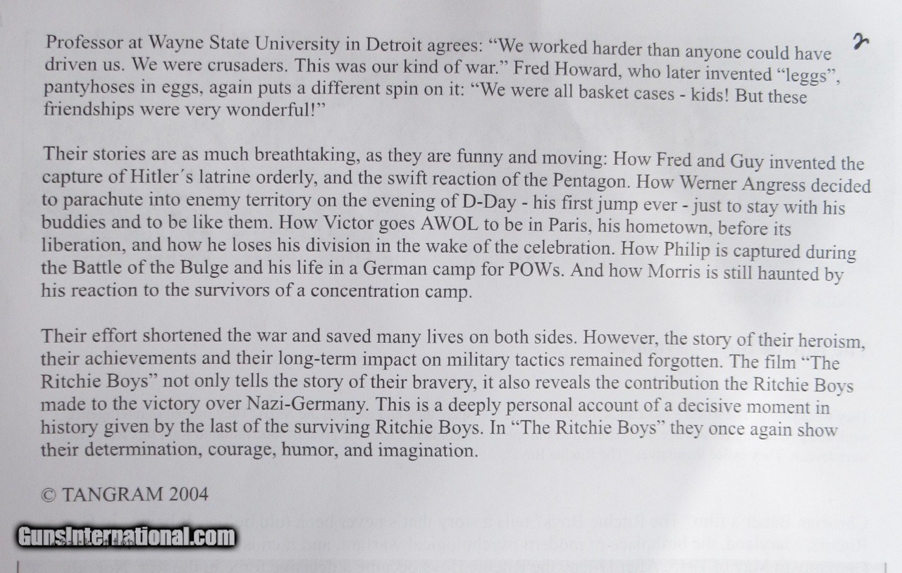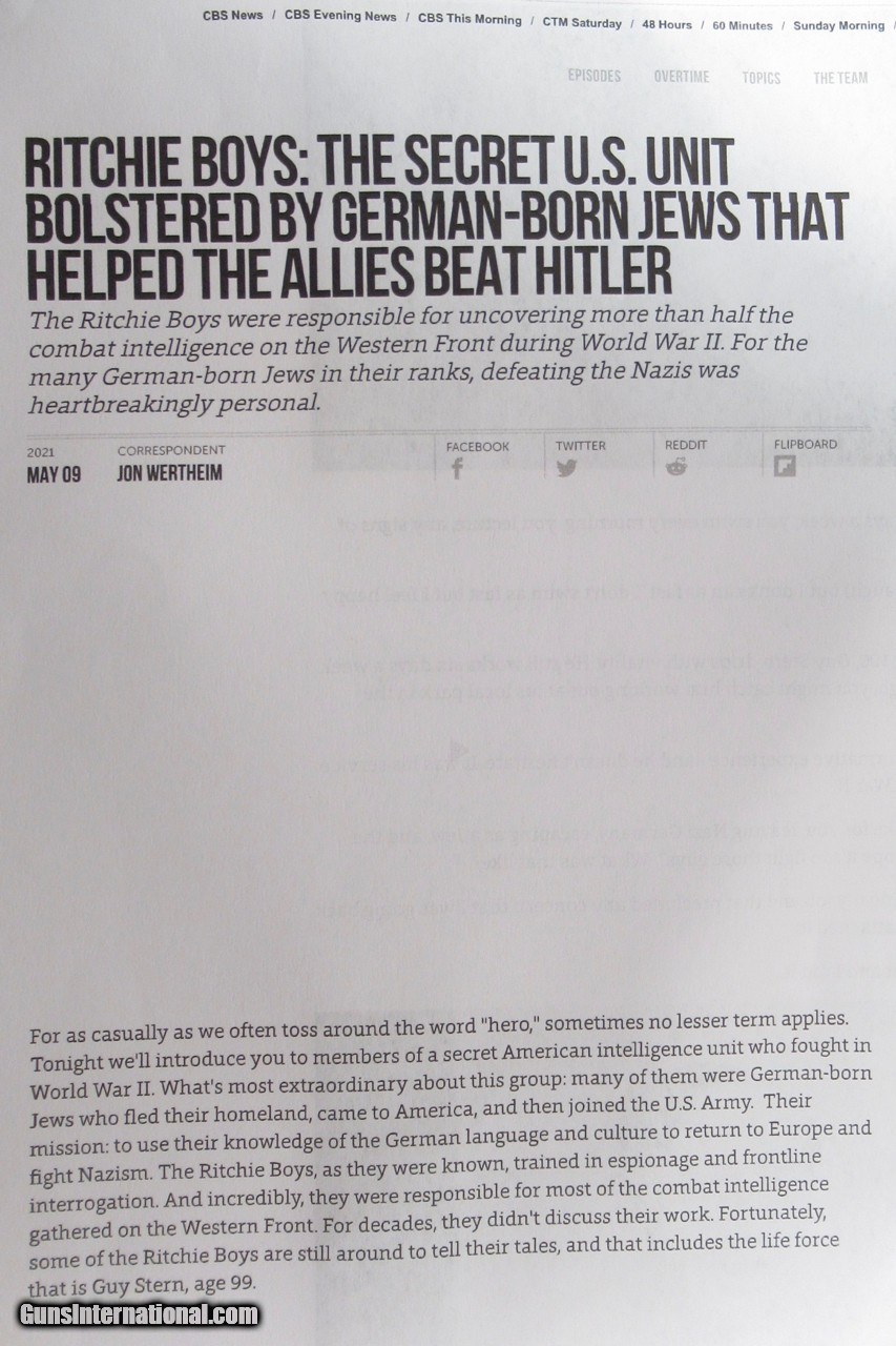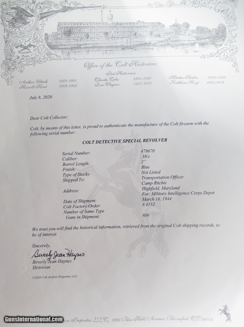 Description: Colt Detective Special Revolver; Serial No. 478670; .38 Special Caliber with 2” Barrel; Blue Finish; Square Butt Medallion Grips; Per Enclosed Factory Letter, Shipped March 16, 1944 to Camp Ritchie, Highfield, Maryland for Military Intelligence; Nearly All Original Factory Blue Intact; Near Perfect Original Grips; The Military Intelligence did not want Military Markings; This is One of the Rare Ones With the “Punch Dot” Acceptance Marks Under Barrel; Bore and Action Perfect; Factory Letter and Info. On The Ritchie Boys Included; See All Photos for Condition; No Texts; Call (254)541-5765 or Email Only; PERSONAL PROPERTY of Harold Wieser; Price: $6,475 + $45 S&H Via USPS PRIORITY MAIL; Payment Address: Harold Wieser - 1466 U.S. Hwy 77 - Rosebud, TX 76570; SEND PAYMENTS VIA USPS PRIORITY MAIL; BEWARE of SCAMS!!! – DO NOT SEND MONEY or CORRESPONDENTS ELECTRONICALLY UNLESS YOU HAVE SPOKEN to HAROLD WIESER FIRST! 254-541-5765 SOLD Manufacturer: Colt Model: Detective Special Serial Number: 478670 |