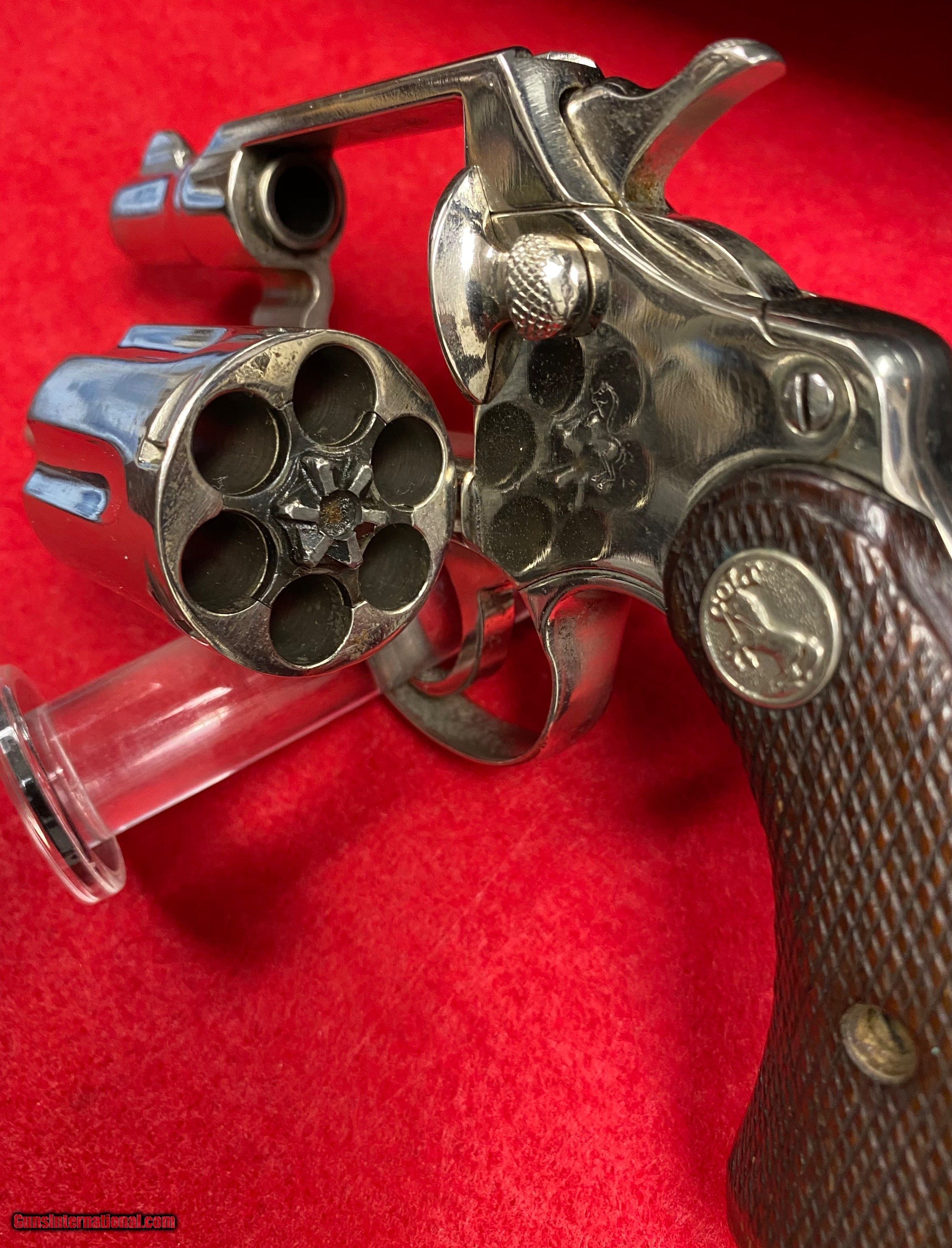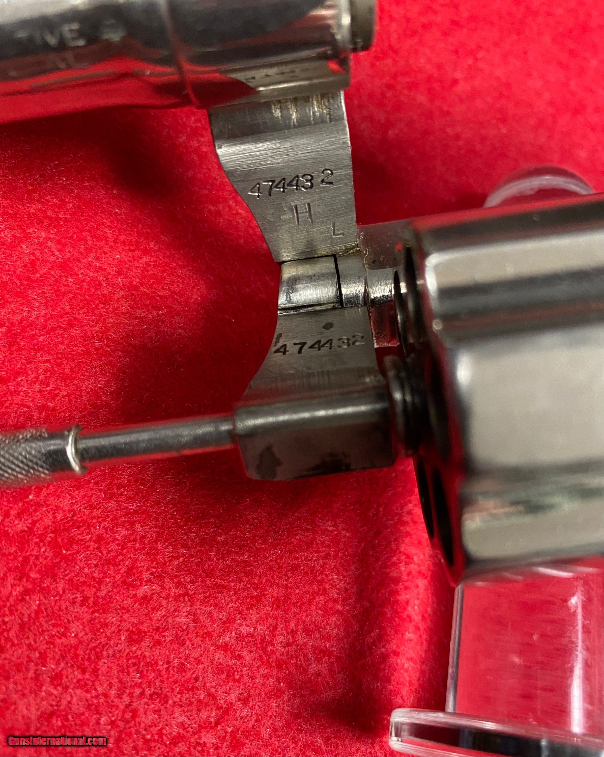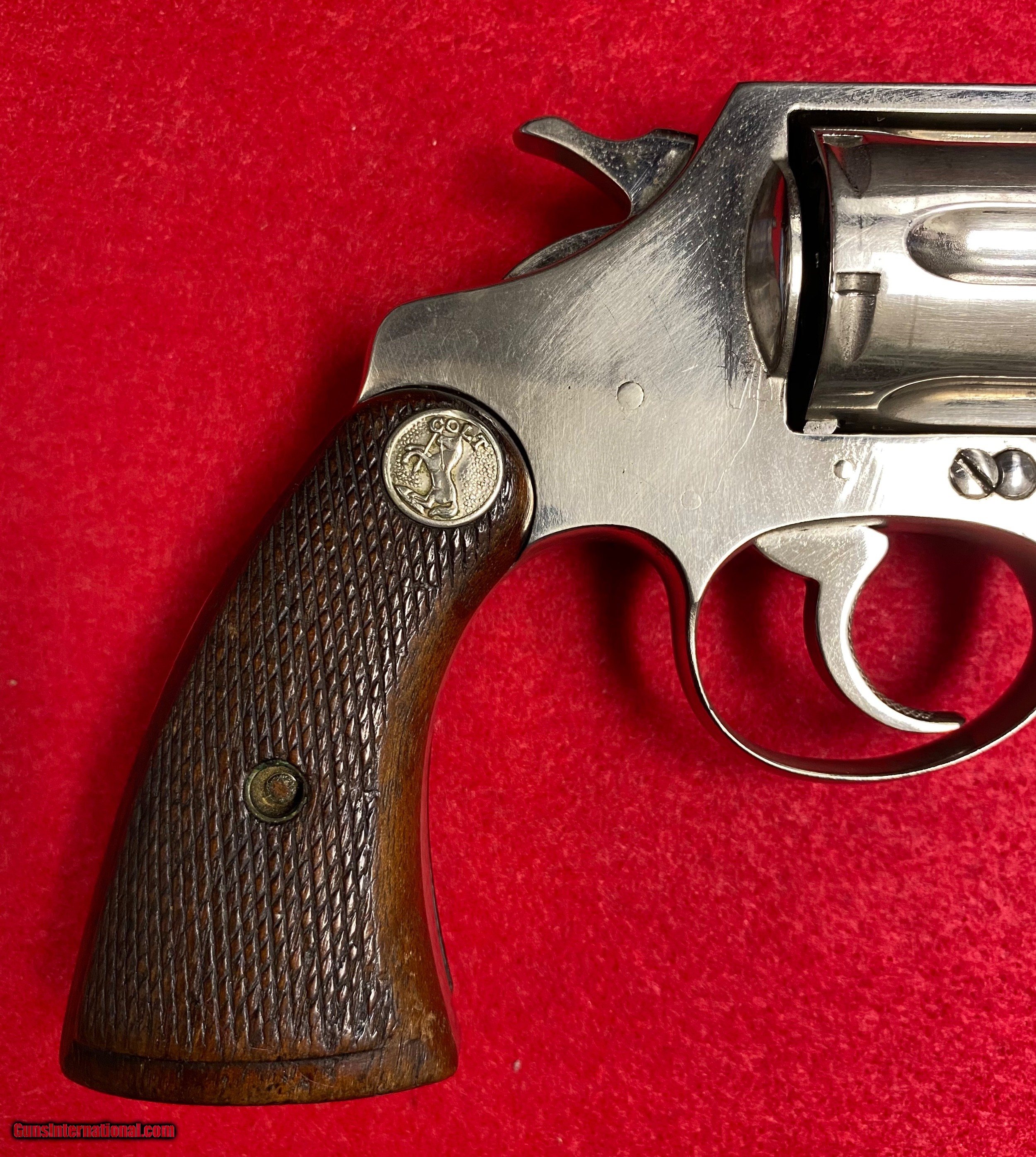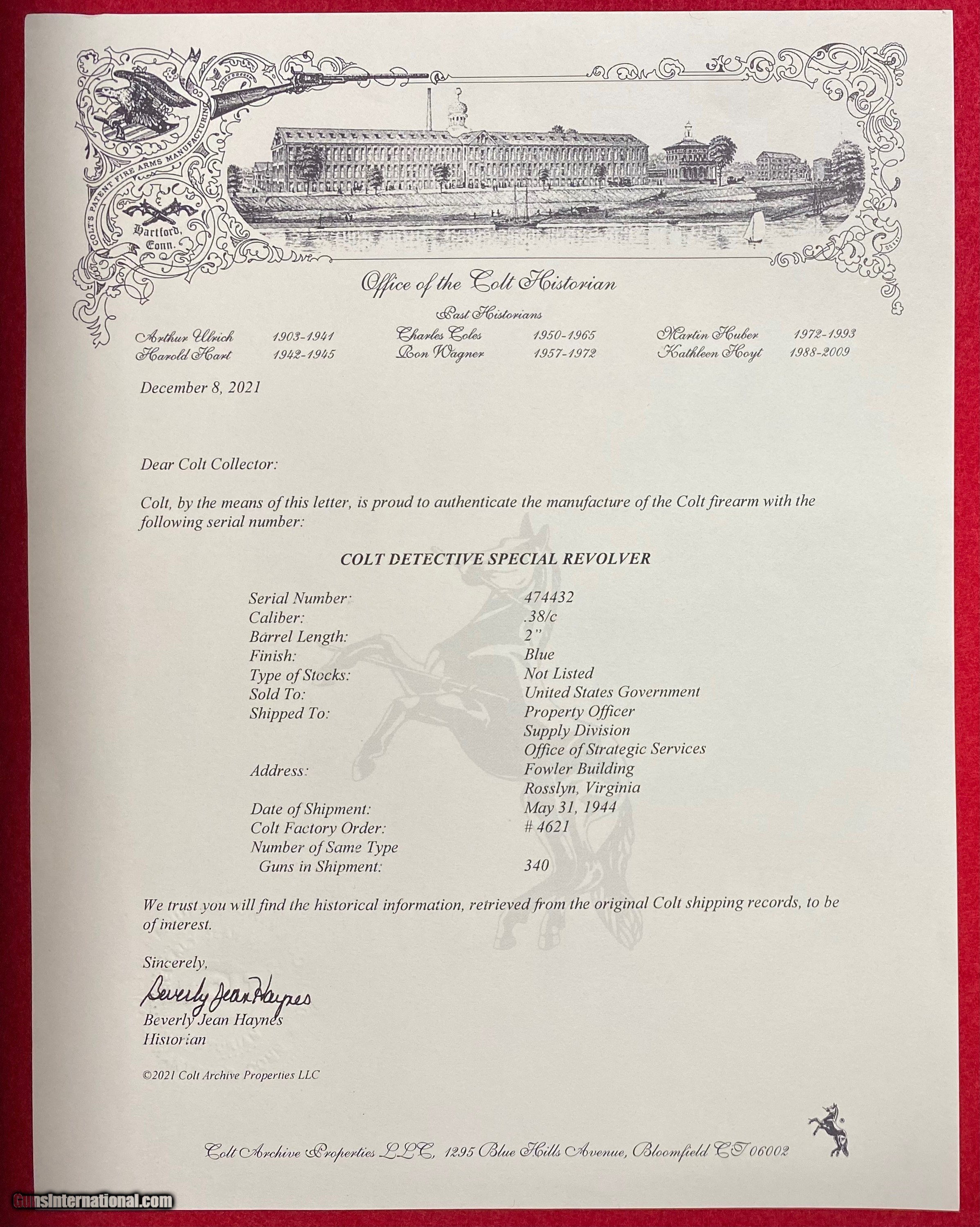 Description: This is one of the hardest OSS shipped guns to find! A scarce Office of Strategic Services shipped Colt Detective Special revolver. Made during the 2nd World War and shipped to OSS in 1944. This 38 Special revolver has a 2" barrel. Comes with a factory letter confirming the barrel length and the shipping destination. Correct ordinance punch dot mark visible on LH of frame near the hammer. The Office of Strategic Services (OSS) was a wartime intelligence agency of the United States during World War II, and a predecessor to the Department of State's Bureau of Intelligence and Research (INR), and the independent Central Intelligence Agency (CIA). Pistols shipped to this branch are extremely desirable to collectors. This is a crisp gun with great mechanics and a shiny bore. The entire revolver has been refinished in nickel in the past. Some of the markings are soft as shown. The crane and frame have matching original serial numbers. Grips have moderate wear as shown. $50.00 insured shipping. SOLD Curio/Relic: Yes Handgun Caliber: .38 Special Manufacturer: Colt Model: Detective Special Serial Number: 474432 Barrel Length: 2” Chambers: Six Condition: Good Metal Condition: Good Wood Condition: Good Bore Condition: Good Action: DA Finish: Nickel Sights: Fixed Manufacture Date: 1941 Item Location: WV |