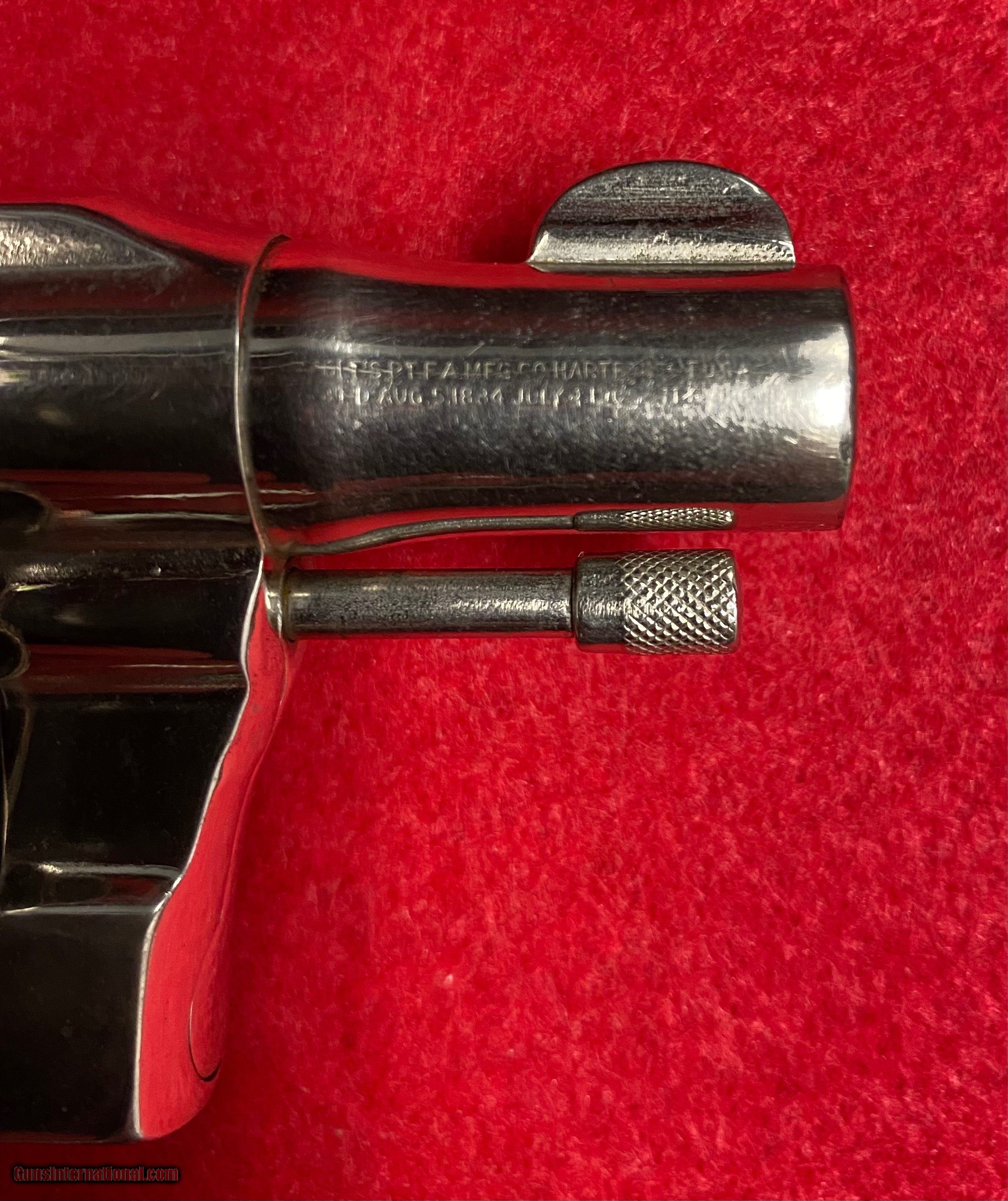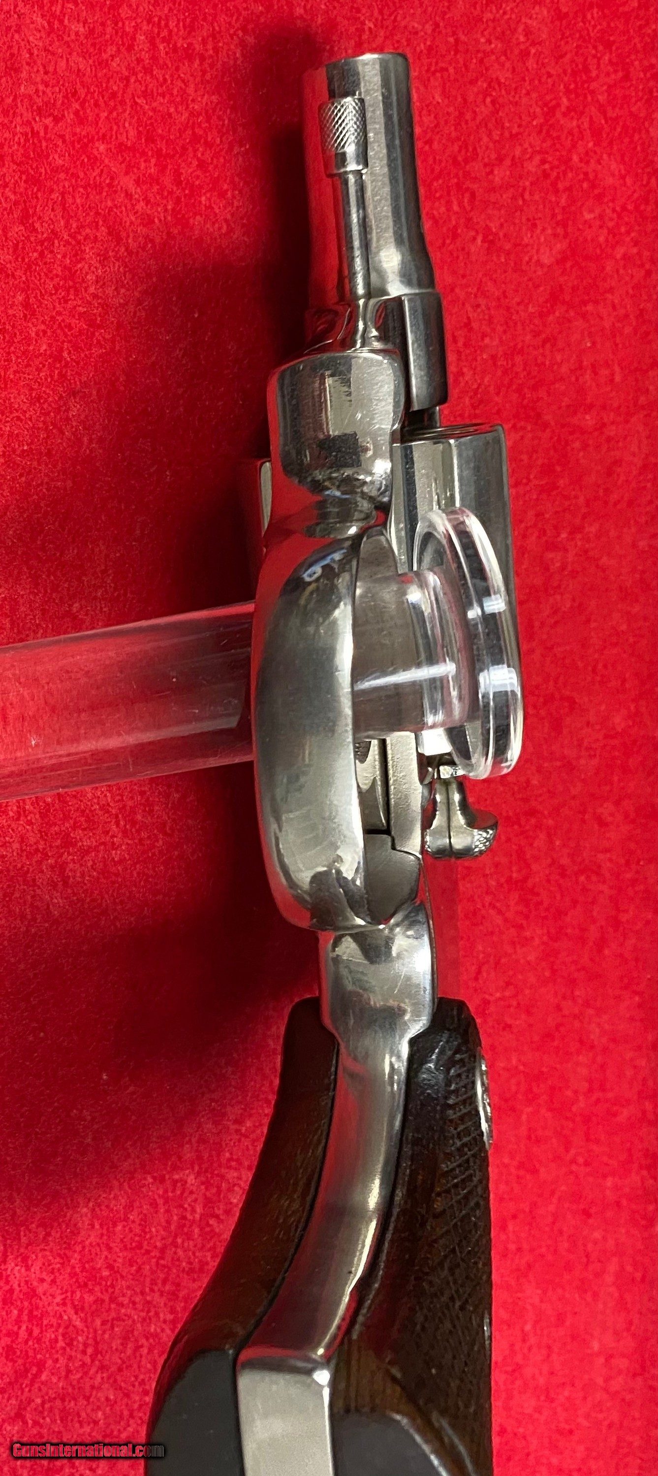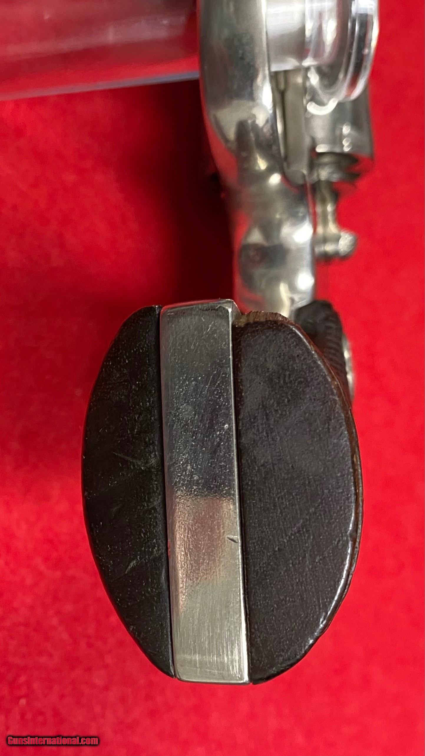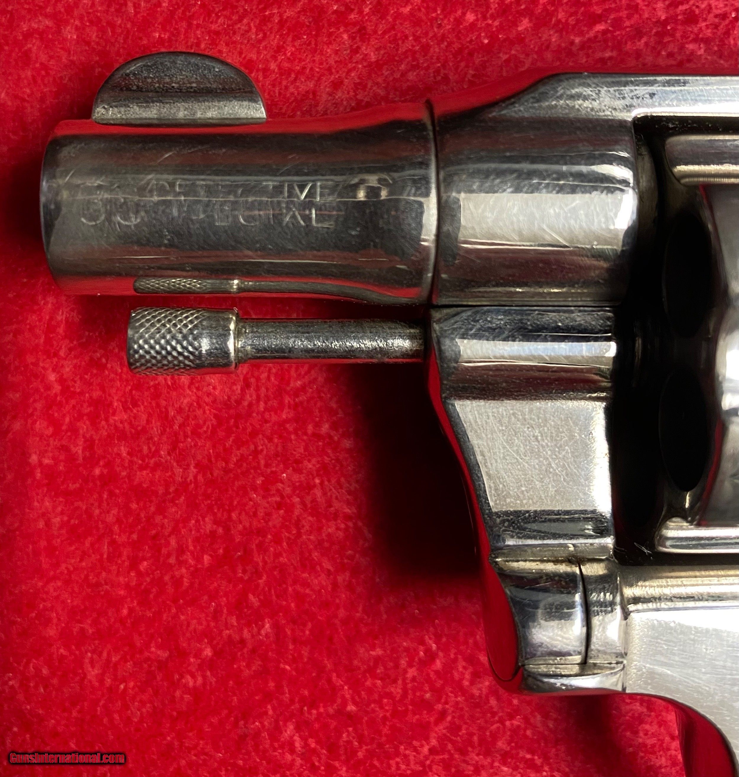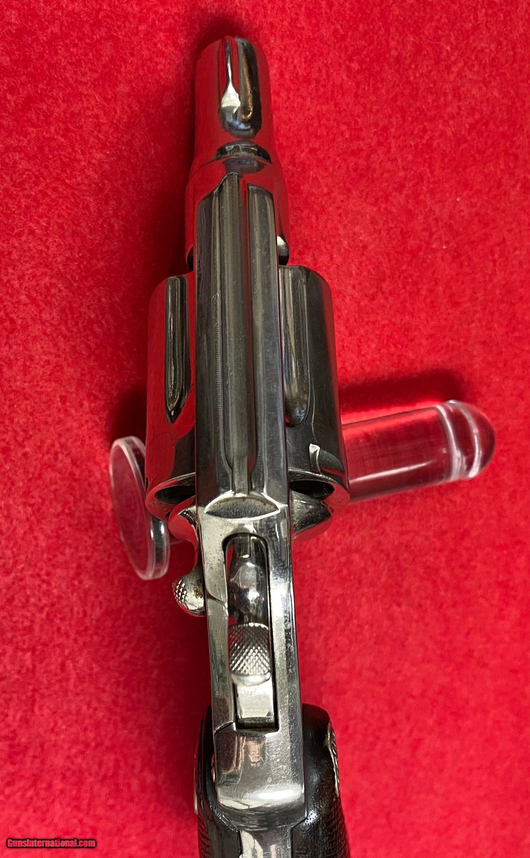 Description: This is one of the hardest OSS shipped guns to find! A scarce Office of Strategic Services shipped Colt Detective Special revolver. Made during the 2nd World War and shipped to OSS in 1944. This 38 Special revolver has a 2" barrel. Comes with a factory letter confirming the barrel length and the shipping destination. Correct ordinance punch dot mark visible on LH of frame near the hammer. The Office of Strategic Services (OSS) was a wartime intelligence agency of the United States during World War II, and a predecessor to the Department of State's Bureau of Intelligence and Research (INR), and the independent Central Intelligence Agency (CIA). Pistols shipped to this branch are extremely desirable to collectors. This is a crisp gun with great mechanics and a shiny bore. The entire revolver has been refinished in nickel in the past. Some of the markings are soft as shown. The crane and frame have matching original serial numbers. Grips have moderate wear as shown. $50.00 insured shipping. SOLD Curio/Relic: Yes Handgun Caliber: .38 Special Manufacturer: Colt Model: Detective Special Serial Number: 474432 Barrel Length: 2” Chambers: Six Condition: Good Metal Condition: Good Wood Condition: Good Bore Condition: Good Action: DA Finish: Nickel Sights: Fixed Manufacture Date: 1941 Item Location: WV |