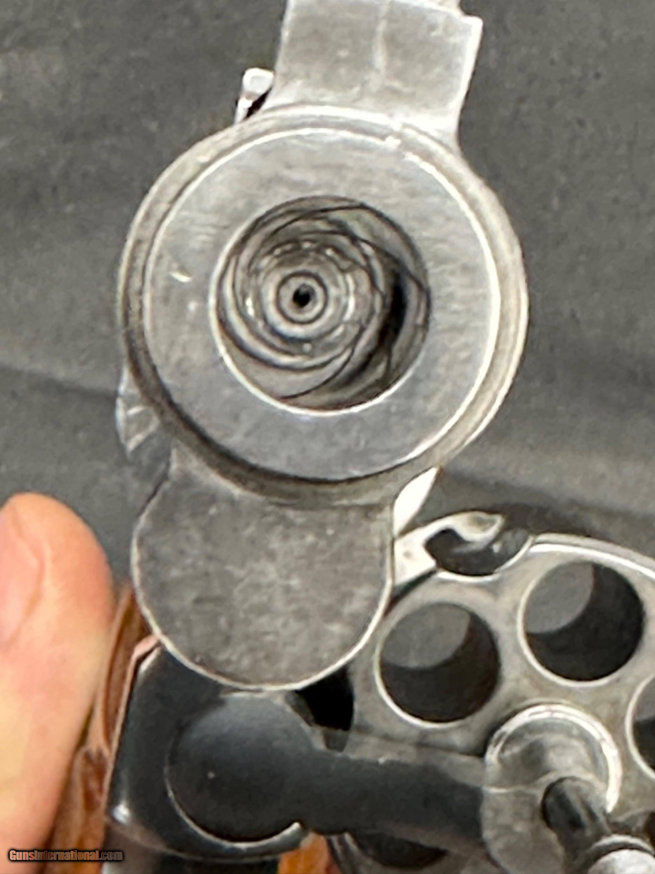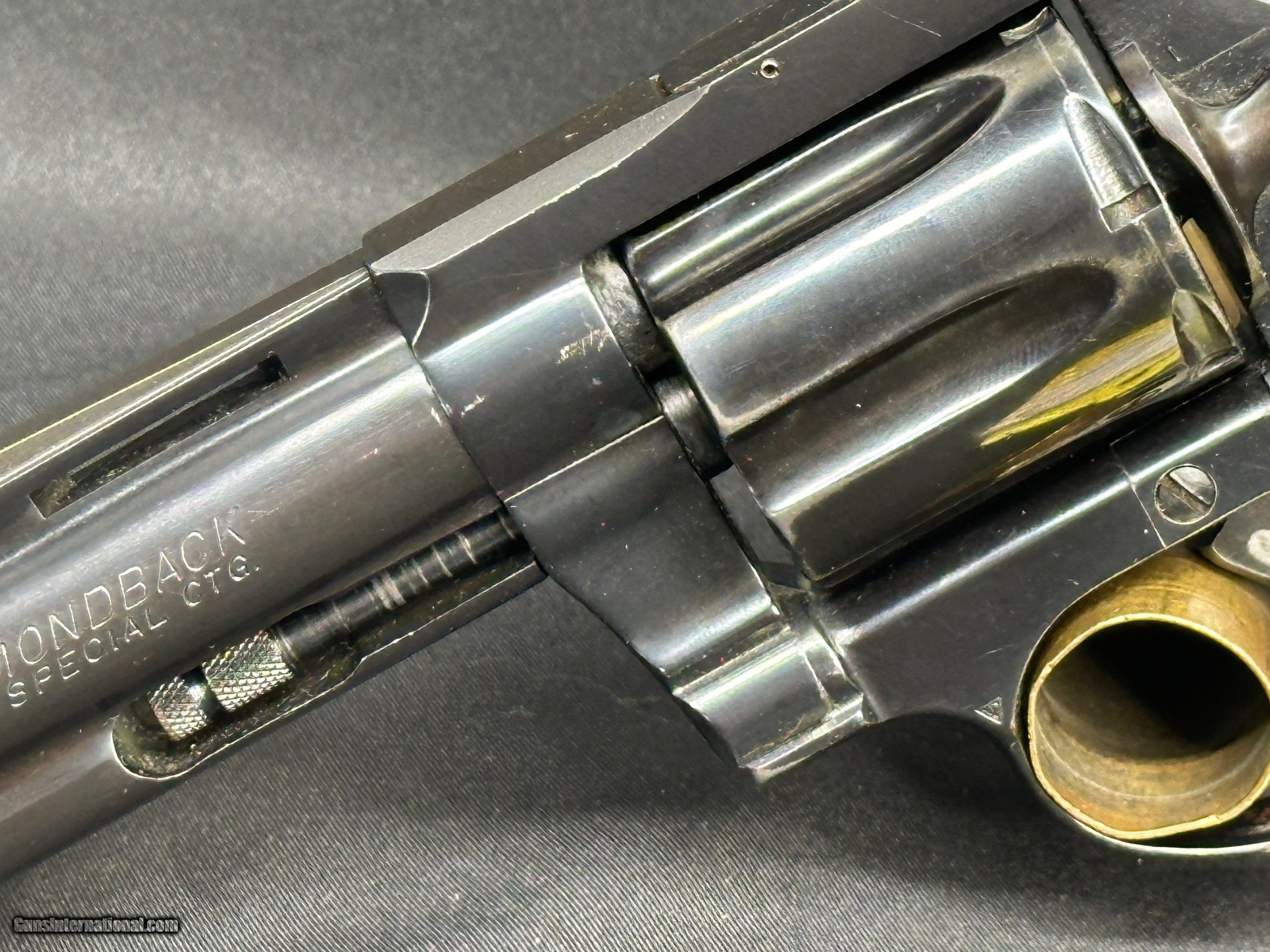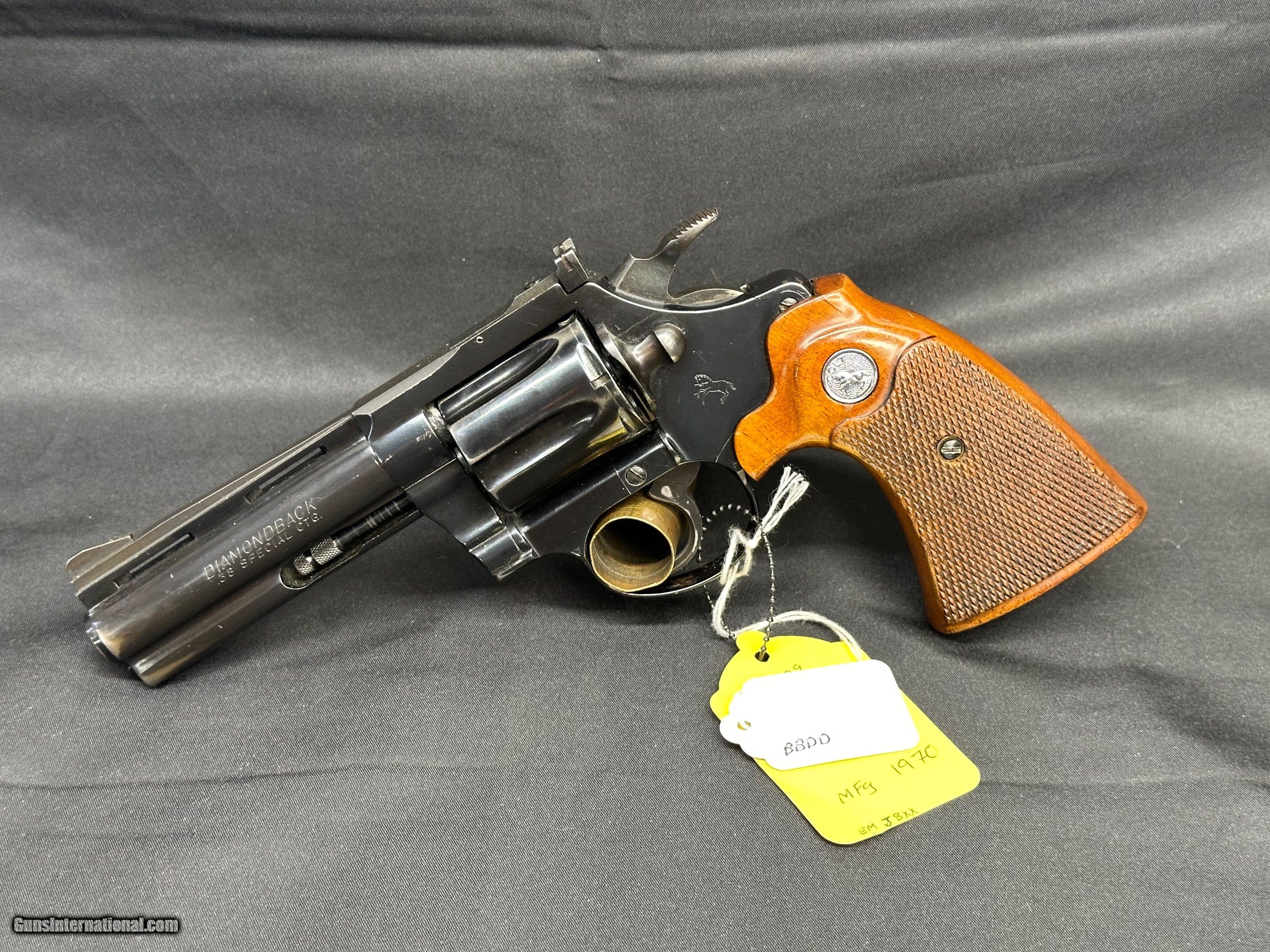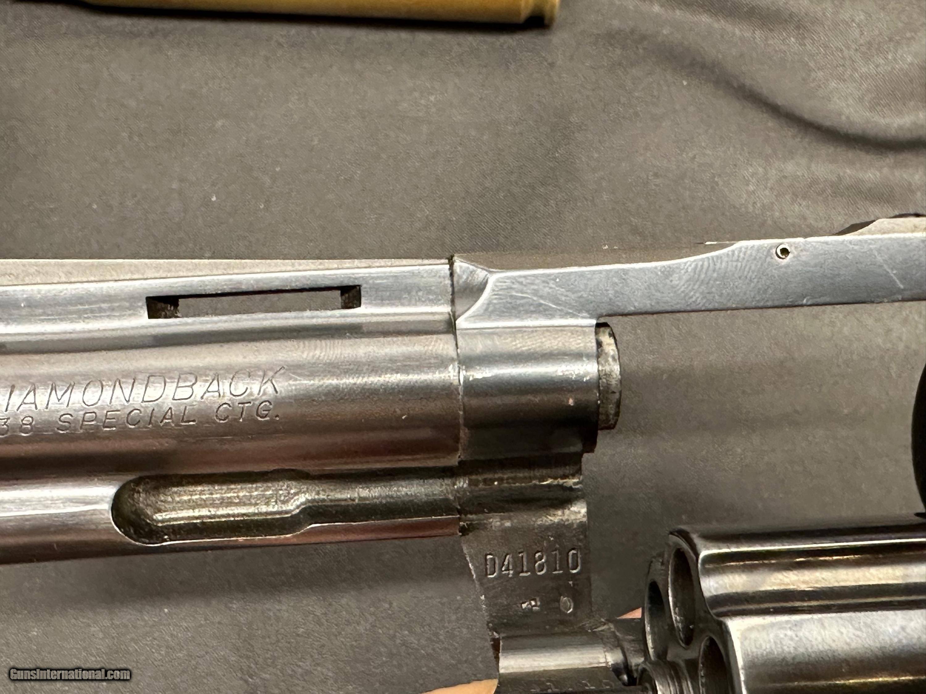 Description: This is a Colt Diamondback manufactured in 1970 Timed perfectly, Nice smoth double action trigger pull and crisp single action. bluing has some holster muzzle wear and cylender wear and some light rust pitting on the right side of the frame. The grips are in good condition with some small finish chips on the right side and light handling marks on both sides. Mechanically excellent. Looks to have been caried more than shot. The bore is in excellent condition with a bright mirror like internal finish. Flat 25.00 shipping fee Price reflects a 3% cash discount. Maine residents must add 5.5% sales tax SOLD Handgun Caliber: .38 Special Manufacturer: Colt Model: Diamondback Serial Number: D41810 Barrel Length: 4 Condition: Good- Very Good Metal Condition: Good- Very Good Wood Condition: Good- Very Good Bore Condition: Excellent Action: Single - Double Manufacture Date: 1970 Item Location: Buxton Maine |