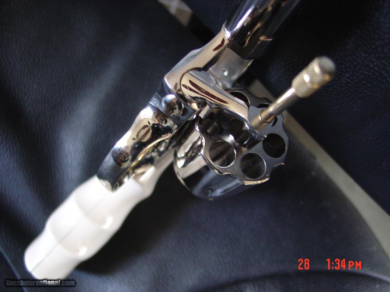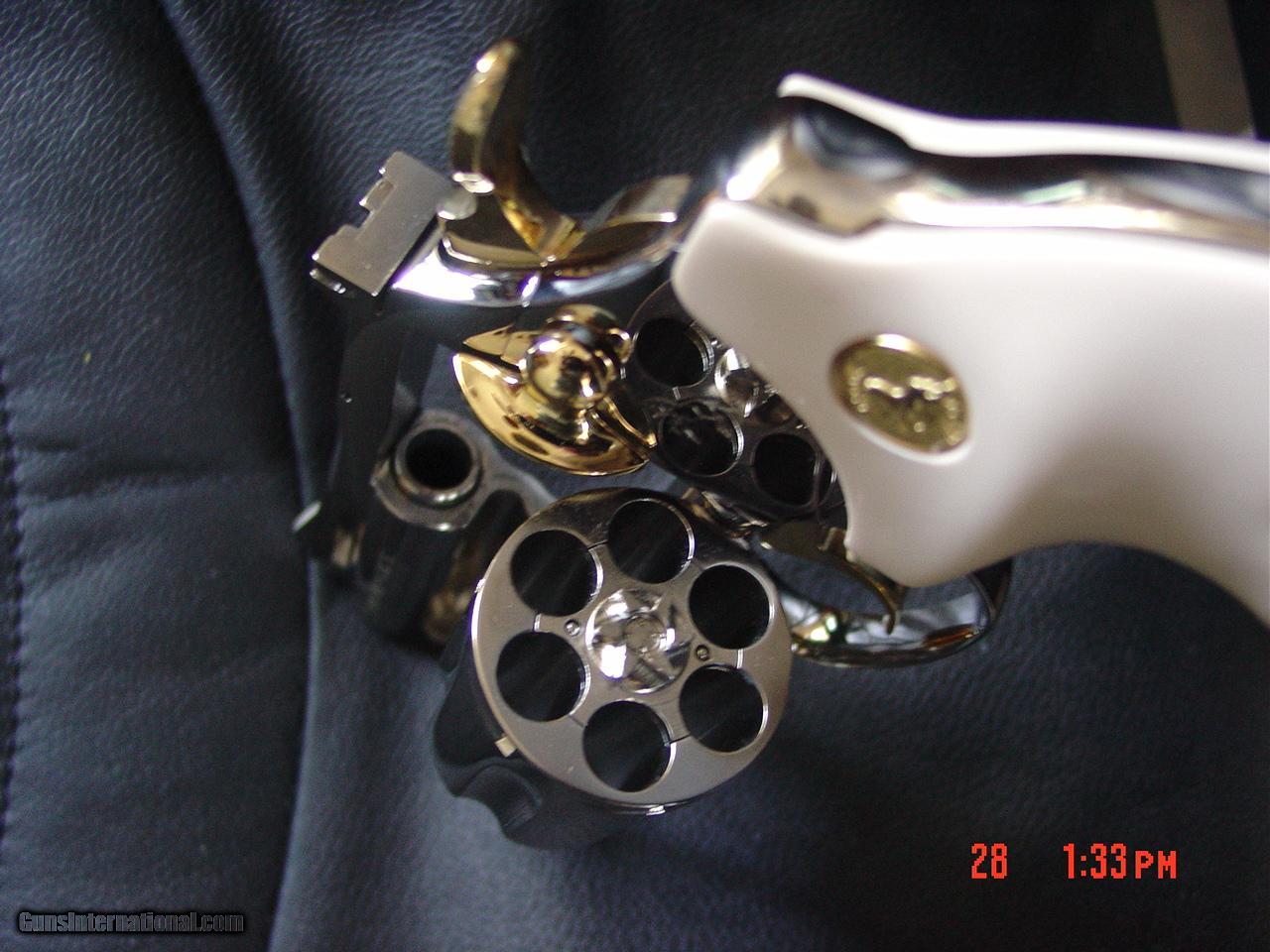 Description: SALE PENDING ON LAYAWAY.here is a beautiful Colt Diamondback with a 2 1/2" vented rib barrel in 38 Special,that has just been fully refinished in bright mirror nickel with 24k gold plated accents.finished in late March 2017,& not fired since being redone. made in 1978, so its now 39 years old & never looks this nice when new.double or single a,6 shots,adjustable rear site,& has a beautiful set of bonded ivory grips,with finger grooves,& gold Colt medallionse with a cool triangle shape hard case.serial # R04006. much nicer in person, finish is so shiny it reflects all the backgrounds. a beautiful showpiece for $2595.firm + $35.shipping to your FFL dealer only. I am an FFL dealer,located in the Clearwater,Florida area.I accept bank wire transfers,direct deposits to Wells Fargo Bank,cashiers checks,postal & bank money orders,or personal & business checks,but those take time to clear.I now offer 60 day layaway with 1/3rd down & 1/3rd per month.be sure to check out all my other unique listings. SOLD |