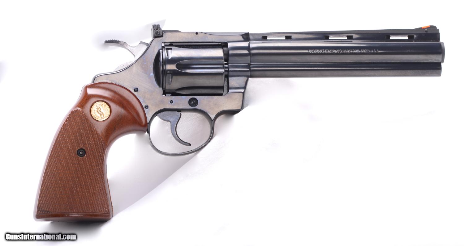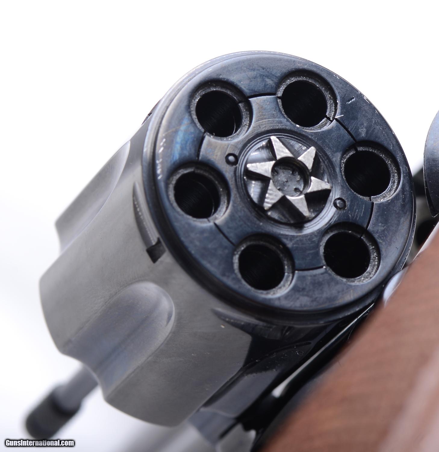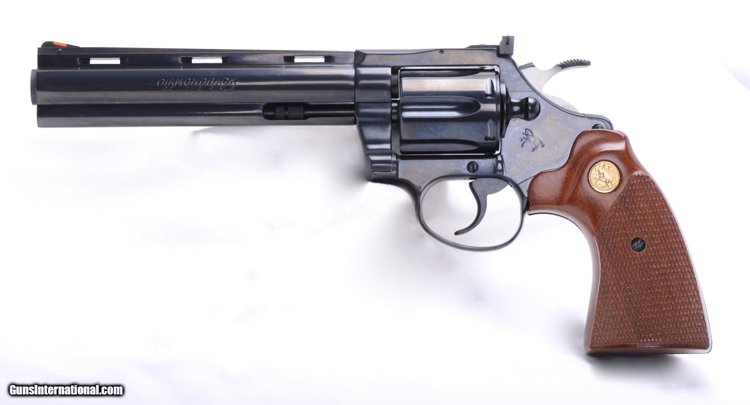 Description: SALE PENDING Colt Diamondback .22 revolver 6” barrel made when the records start to fail in the early 1980’s. This is a very fine and hard to find Diamondback that is in unfired condition. This beautiful blue finished revolver is only missing the box to be perfect. You will notice in the pictures that it is cased with a 2 1/2” and a 4”, both of which are also advertised for sale. If they are still available you may purchase the three .22 Diamondbacks with display case for $7900. Regardless, this 6” Diamondback is desirable by itself. SOLD |