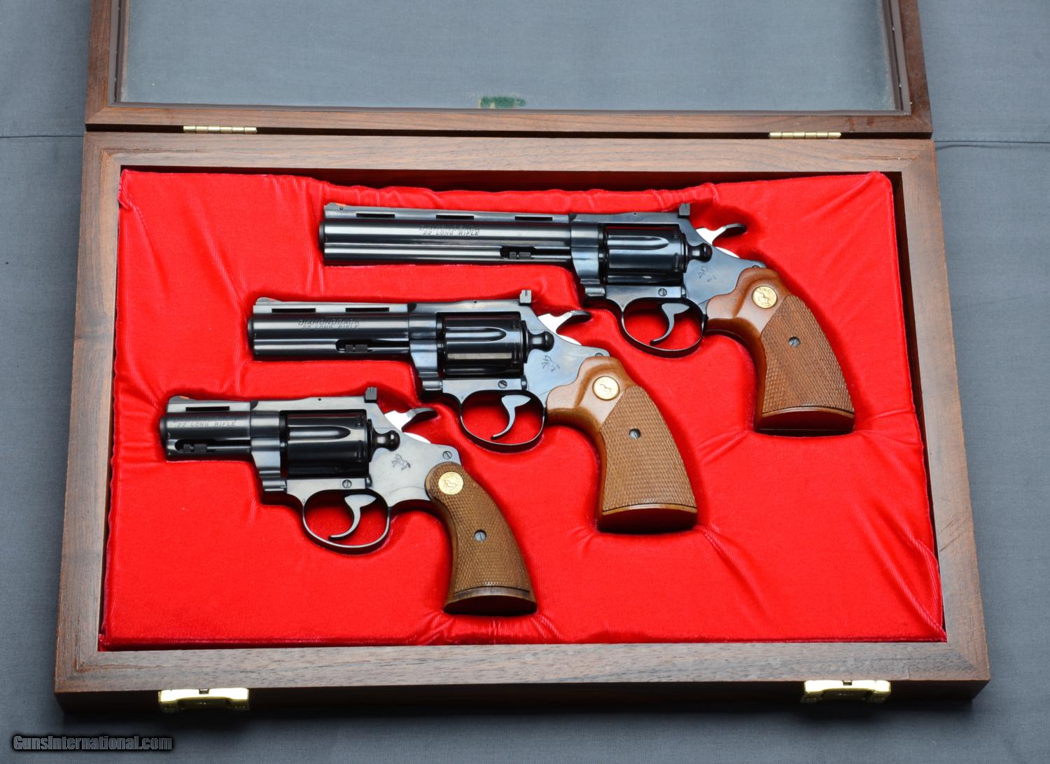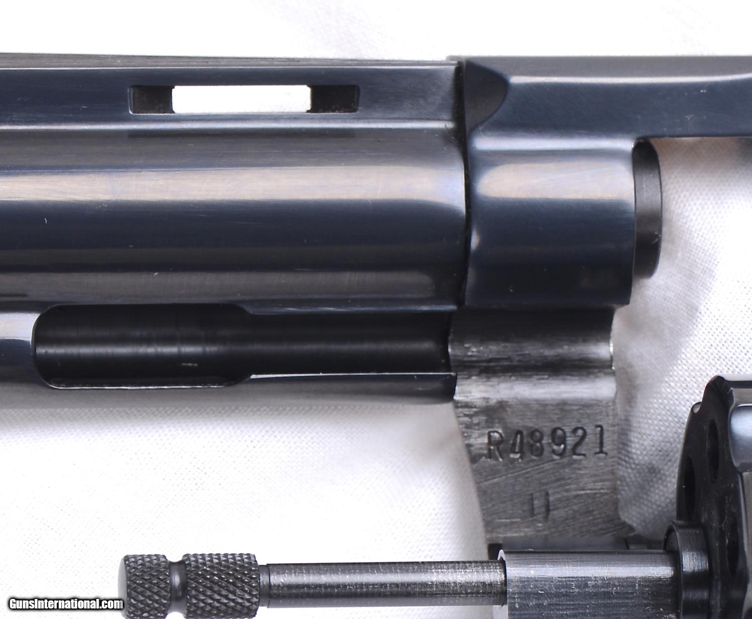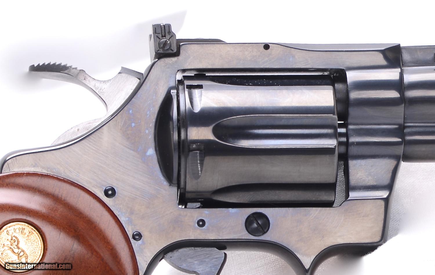 Description: SALE PENDING Colt Diamondback .22 revolver 6” barrel made when the records start to fail in the early 1980’s. This is a very fine and hard to find Diamondback that is in unfired condition. This beautiful blue finished revolver is only missing the box to be perfect. You will notice in the pictures that it is cased with a 2 1/2” and a 4”, both of which are also advertised for sale. If they are still available you may purchase the three .22 Diamondbacks with display case for $7900. Regardless, this 6” Diamondback is desirable by itself. SOLD |