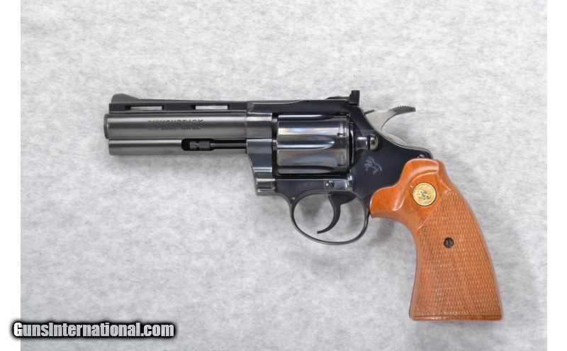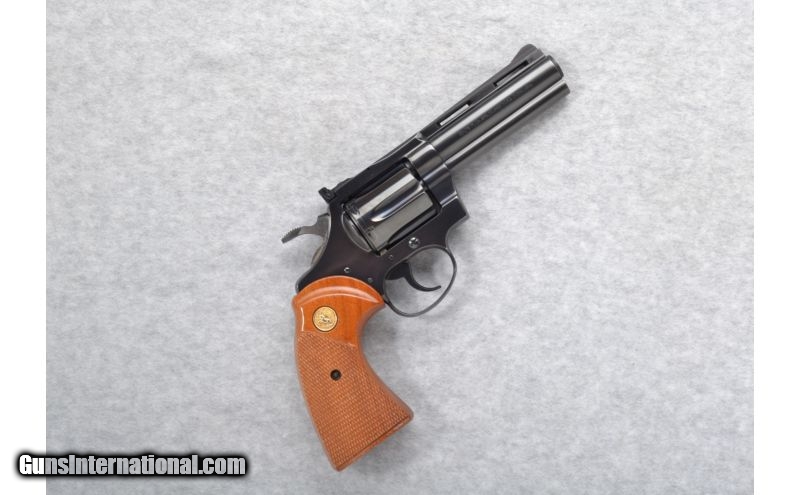 Description: SOLD Metal Condition: Near mint condition with some cylinder drag. Wood Condition: Mint Bore Condition: Mint Barrels: 4 Inch Vent-Rib Barrel Triggers: Double Action Trigger Stock: Walnut Checkered Grips w/Gold Colt Medallions Weight: 24 oz. Sights: Fully Adjustable Rear Sights. Extras: Comes with the original box. Item Location: Richfield, WI |