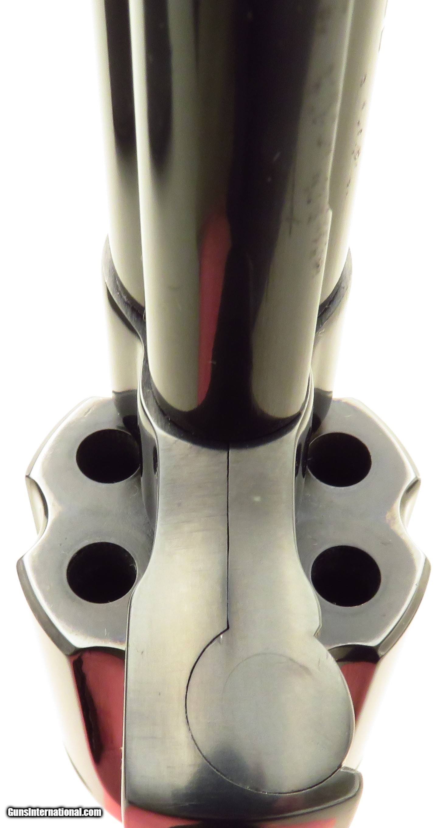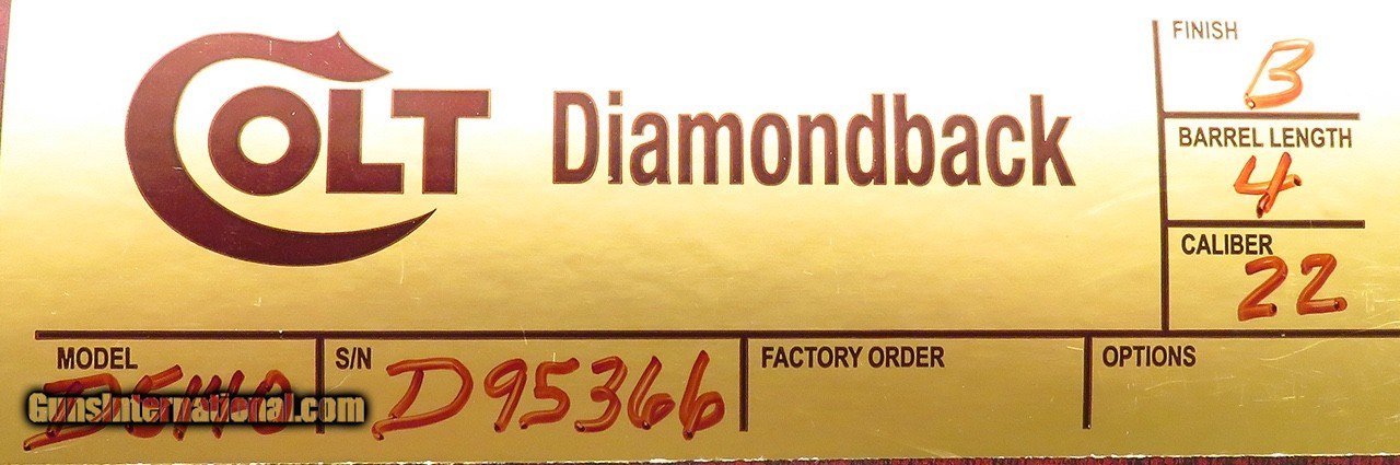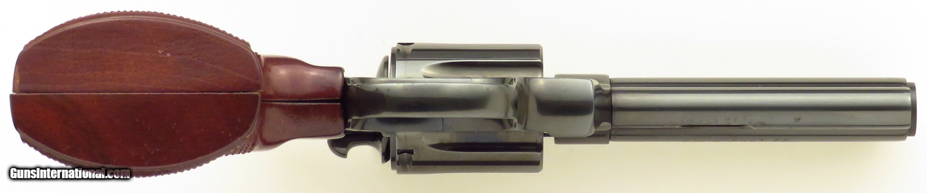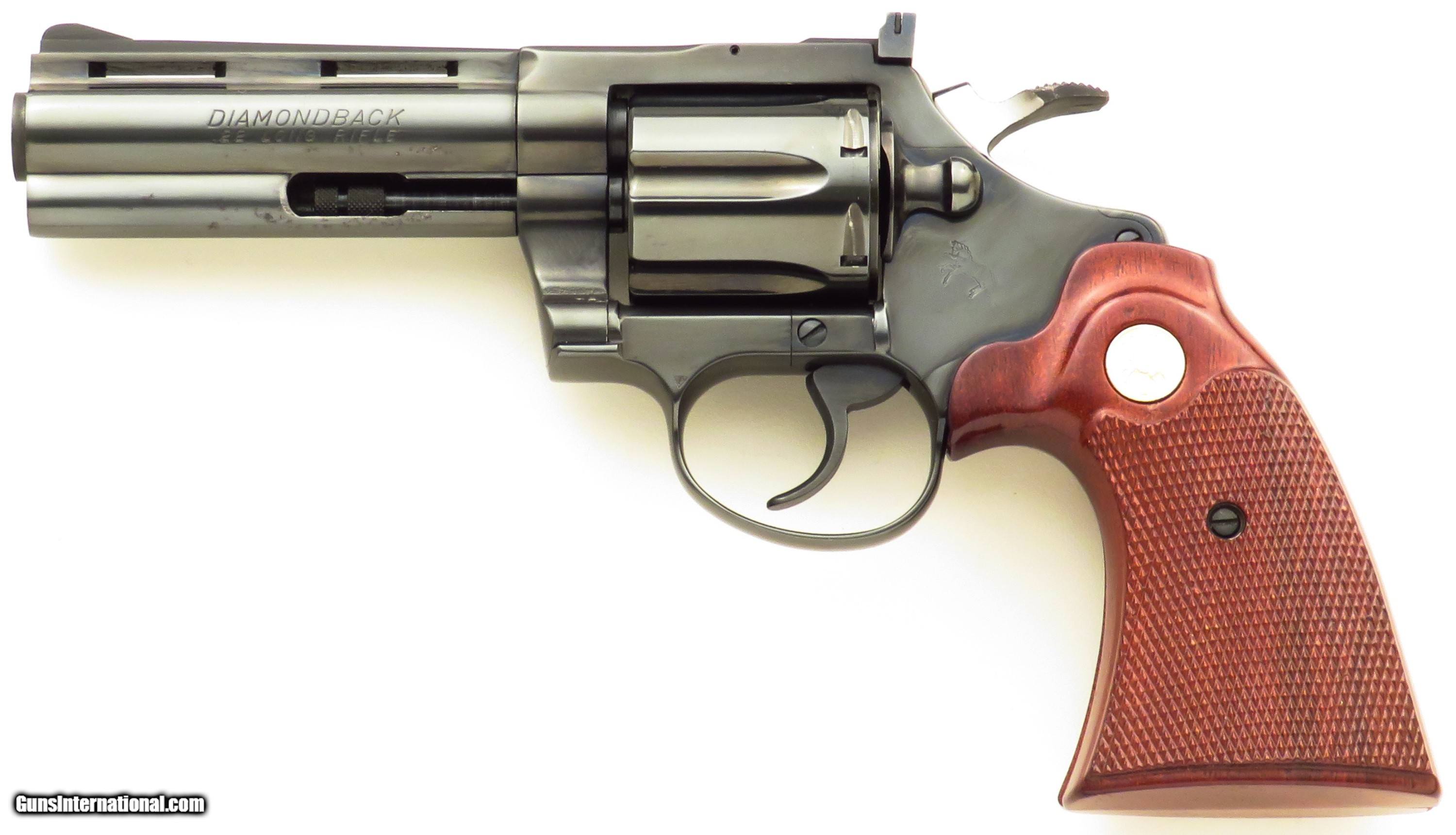 Description: Colt Diamondback .22 LR. Made in 1976, serial D95366 has a 4-inch barrel (integral vent rib with serrated blade front sight, full underlug), polished blue finish, adjustable rear sight, oval hammer (serrated spur) and checkered walnut grips. The original box (with correct end label, manual, "congratulations" letter, yellow "caution" hang tag, Handling the Handgun brochure, warranty card and plastic wrap) is present and in excellent condition. Weight is 2.2 pounds. CONDITION: The bore is superb and cylinder walls are smooth. The cylinder rotates without stutter and locks up like Fort Knox. Trigger pulls are smooth. Metal finish is approximately 95 percent with light freckling (mostly on the underlug). Grips are 99 percent. The price is firm and layaway is available. $2,250 plus shipping. SOLD Handgun Caliber: .22 Long Rifle |