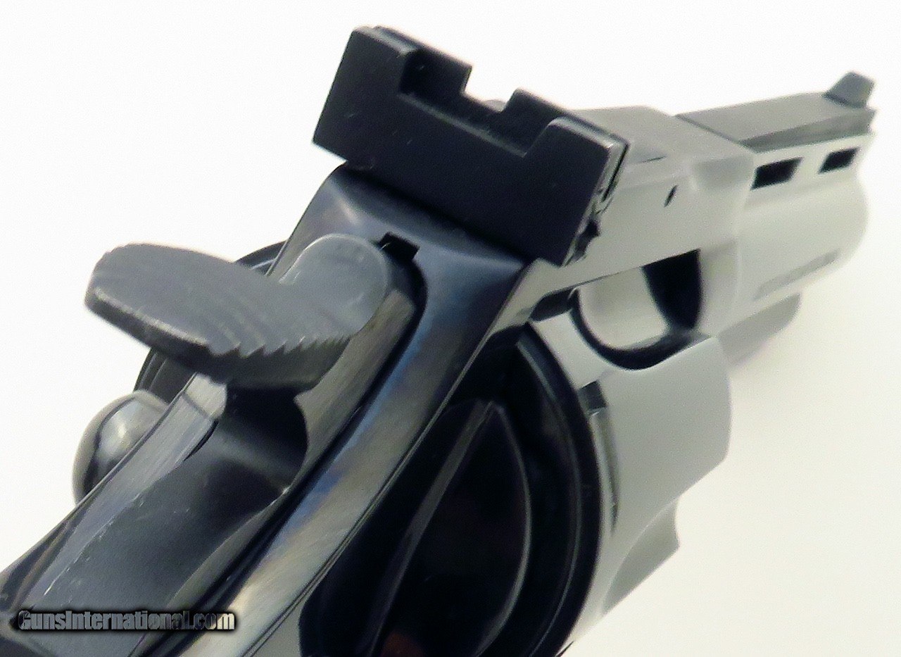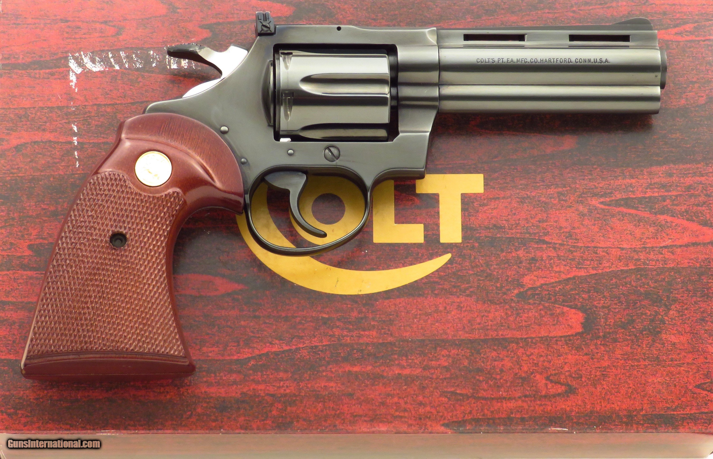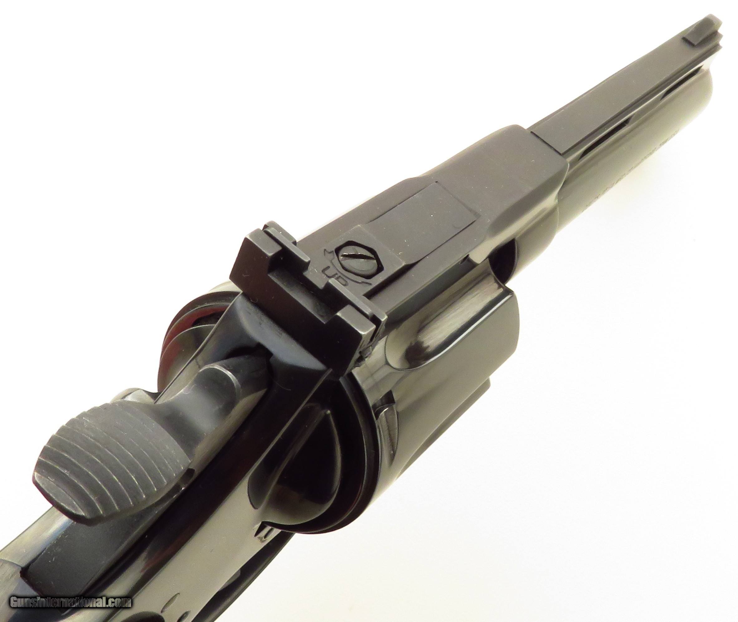 Description: Colt Diamondback .22 LR. Made in 1976, serial D95366 has a 4-inch barrel (integral vent rib with serrated blade front sight, full underlug), polished blue finish, adjustable rear sight, oval hammer (serrated spur) and checkered walnut grips. The original box (with correct end label, manual, "congratulations" letter, yellow "caution" hang tag, Handling the Handgun brochure, warranty card and plastic wrap) is present and in excellent condition. Weight is 2.2 pounds. CONDITION: The bore is superb and cylinder walls are smooth. The cylinder rotates without stutter and locks up like Fort Knox. Trigger pulls are smooth. Metal finish is approximately 95 percent with light freckling (mostly on the underlug). Grips are 99 percent. The price is firm and layaway is available. $2,250 plus shipping. SOLD Handgun Caliber: .22 Long Rifle |