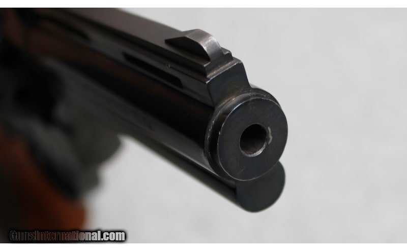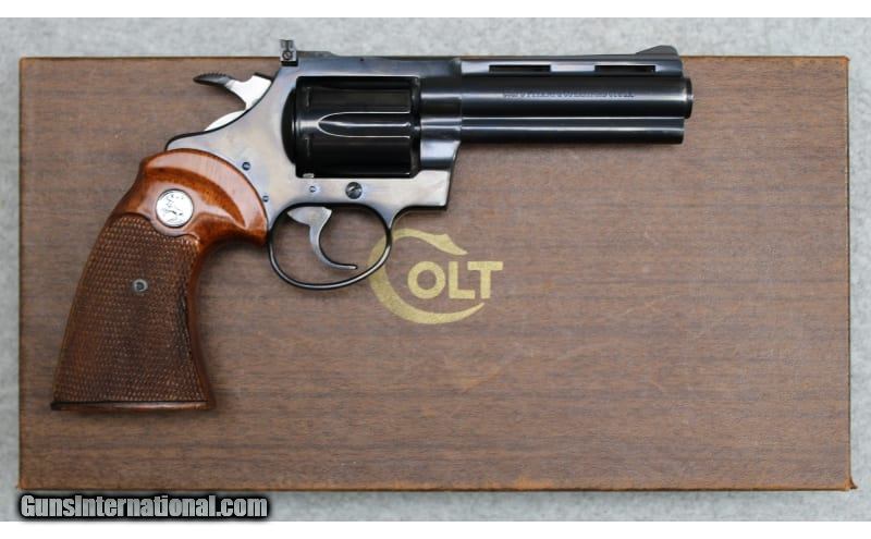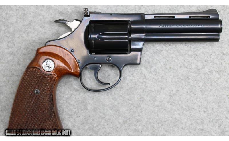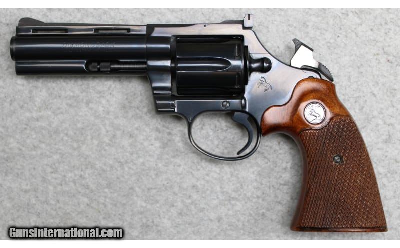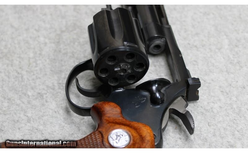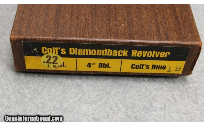 Description: Colt Diamondback revolver chambered in .22 Long Rifle. Introduced in 1966 as a scaled-down version of the Colt Python. The serial number (D30213) indicates that the revolver was produced in 1969. Features include a 4-inch barrel with ventilated rib and adjustable rear sight. Comes with an original woodgrain factory box. .22 Long Rifle SOLD Metal Condition: Very Good with Minor Handling Marks Wood Condition: Very Good with Minor Handling Marks Bore Condition: Bright And Clear with No Pitting Barrels: 4 inch Triggers: DA/SA Weight: 2 lbs 2 oz Item Location: Fort Worth, TX |