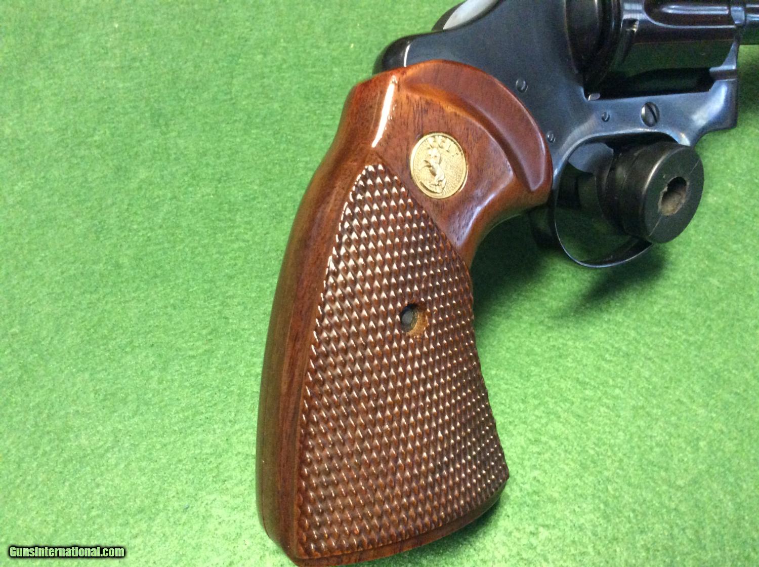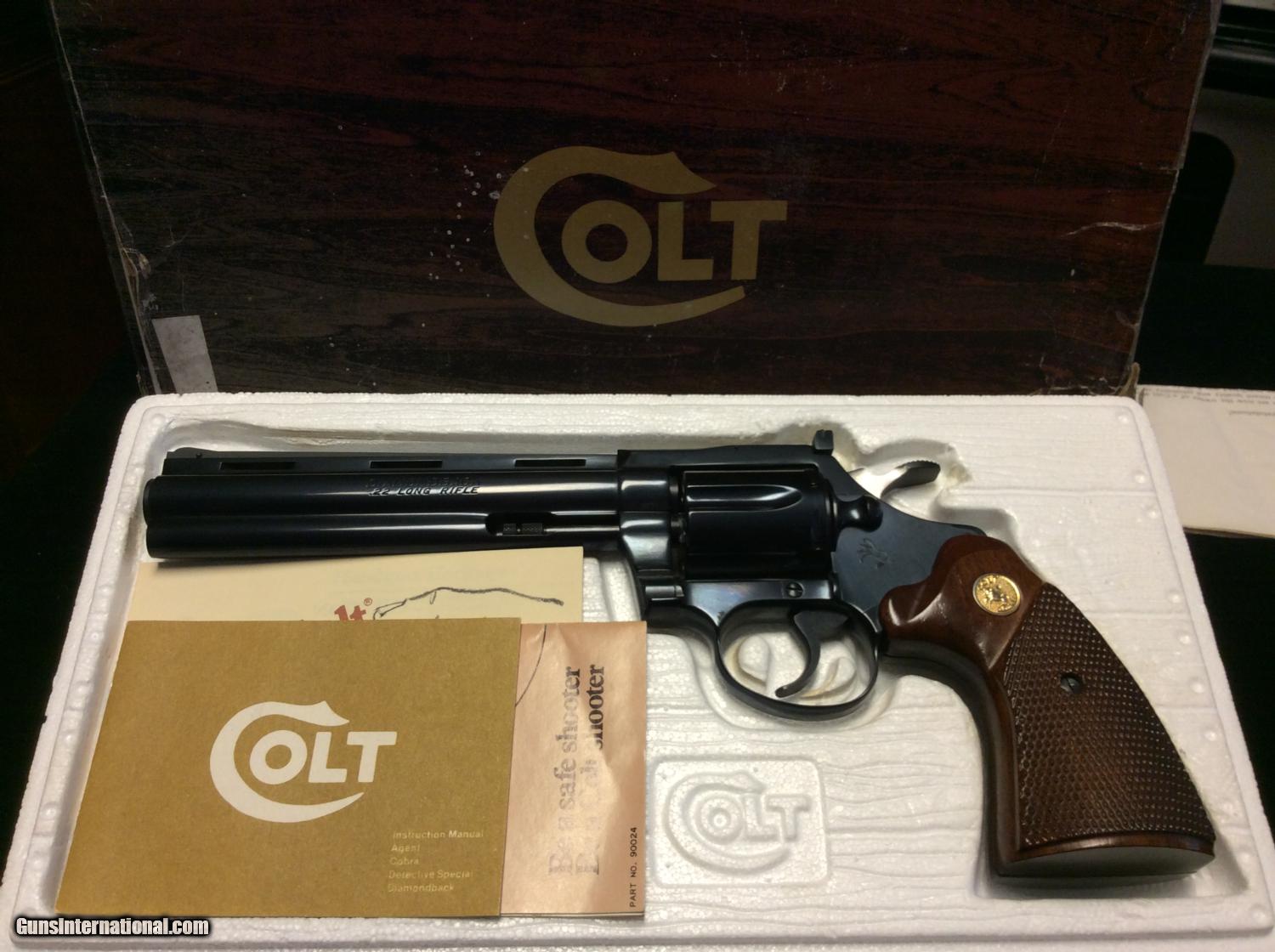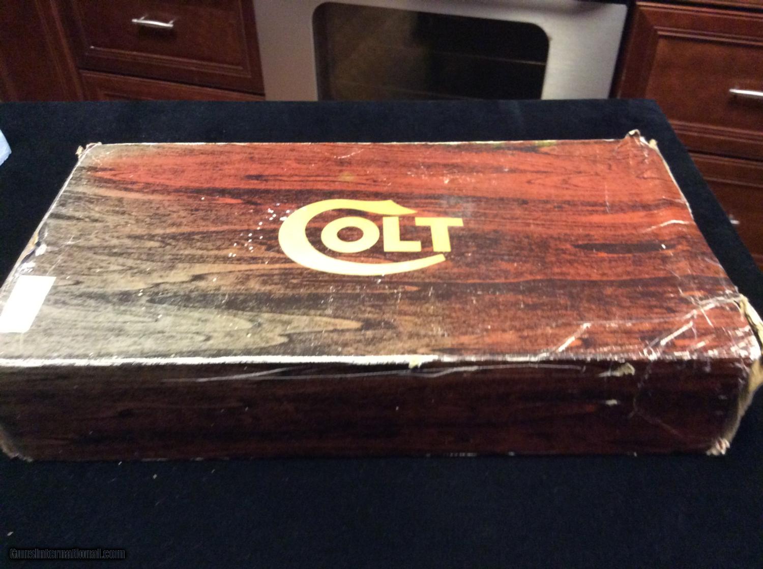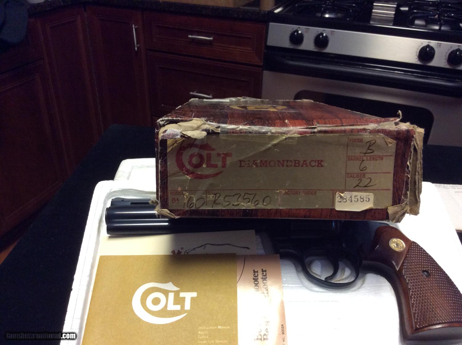 Description: Up for sale is this gorgeous Colt Diamondback chambered in .22 Long Rifle with blue finish. It comes with a 6” ventilated rib barrel, adjustable rear sight. This snake is 98+% overall condition and locks up tight with a very faint turn line and is extremely clean. The package is complete with some very nice factory grips original factory correct serialized box. The original Colt hand checkered walnut grips with gold Colt medallions set this this piece off nicely. This snake would nicely complement any serious Colt collection or take it out back and experience why Colt revolers are the best. I have several of these up to and including NIB available. Please know your state laws. This firearm will ship FFL to FFL only. Shipping is $40 insured. Payment is due within 5 business days. Money Orders, Postal preferred, certified bank checks or personal checks only. All payments will need to clear prior to shipping so allow ten business days once funds are received. SOLD Manufacturer: Colt Model: Diamondback Caliber Info: .22 LR Condition: VG-EX Metal Condition: VG Bore Condition: EX |