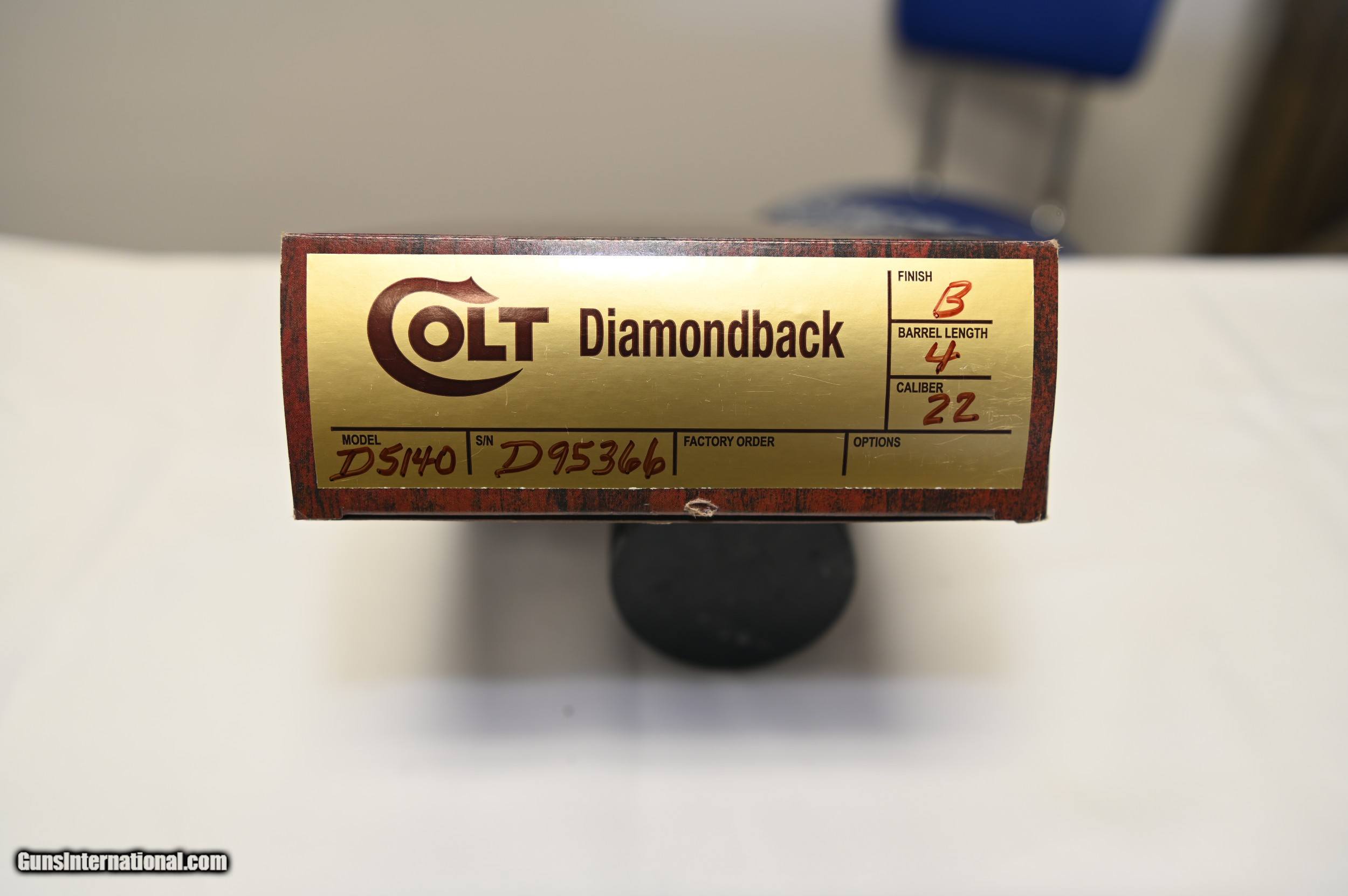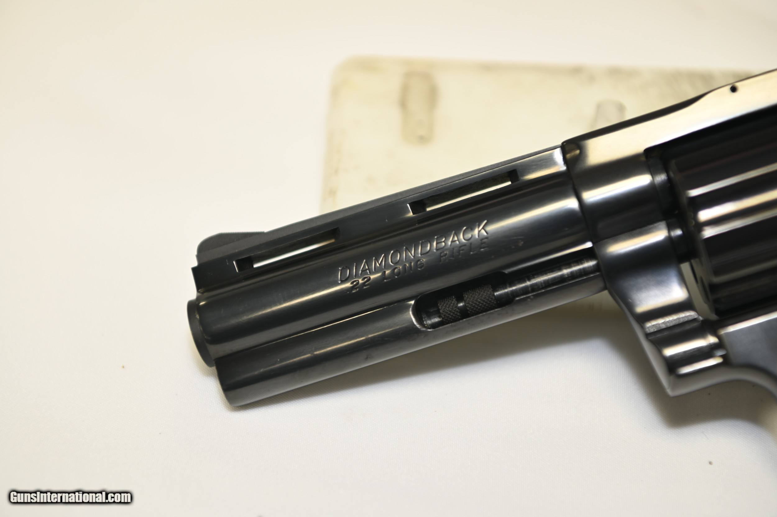 Description: 1976 Colt Diamondback in 22LR. Like new, excellent condition. Box, papers, nice. SOLD Handgun Caliber: .22 Long Rifle Manufacturer: Colt Model: Diamondback Serial Number: d95366 Barrel Length: 4 Condition: Excellent Metal Condition: Excellent Wood Condition: Excellent Bore Condition: Excellent |