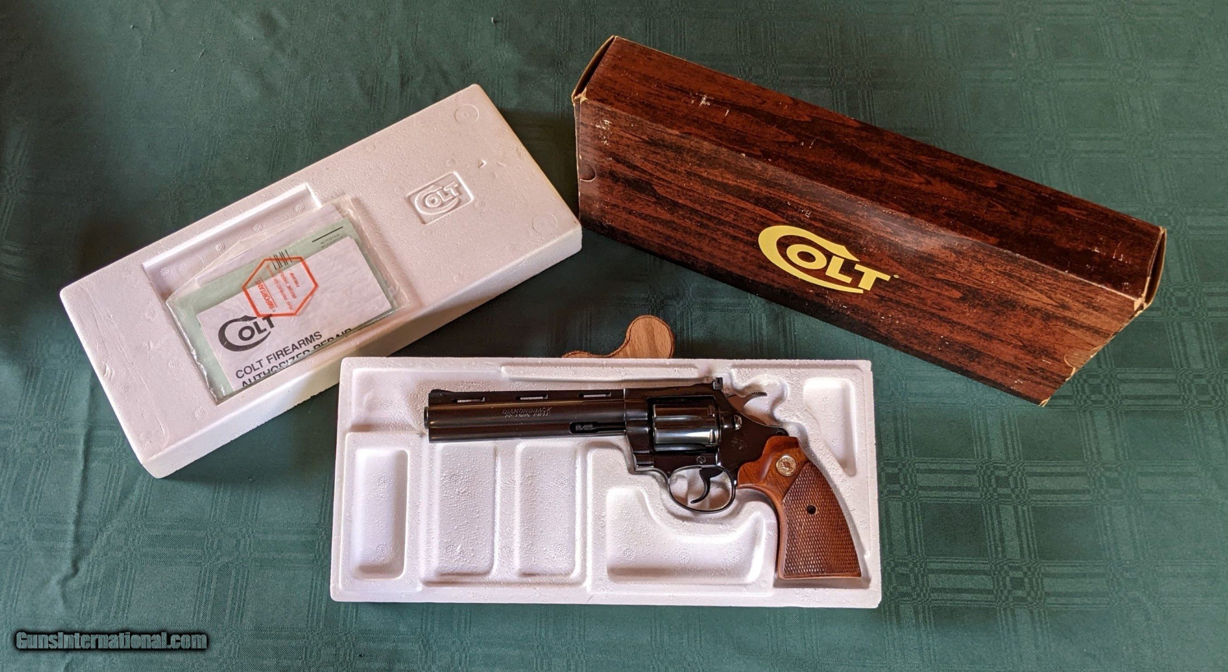 Description: *SOLD*1982 Colt Diamondback 22LR 6" bbl Blue as new in boxw/papers also comes with a letter from Colt to authenticate the manufacture. Appears unfired. Beautiful revolver and hard to find in this condition with a letter. Please feel free to call or email (notexts) with any questions you might have. We accept USPS Money Orders, Credit Cards3%, or your personal check for payment. All checks take 10 days to clear our bank. We ship USPS Priority Insured to your FFL dealer. NO CALIF. SALES. Shipping is not included in the price. SOLD |