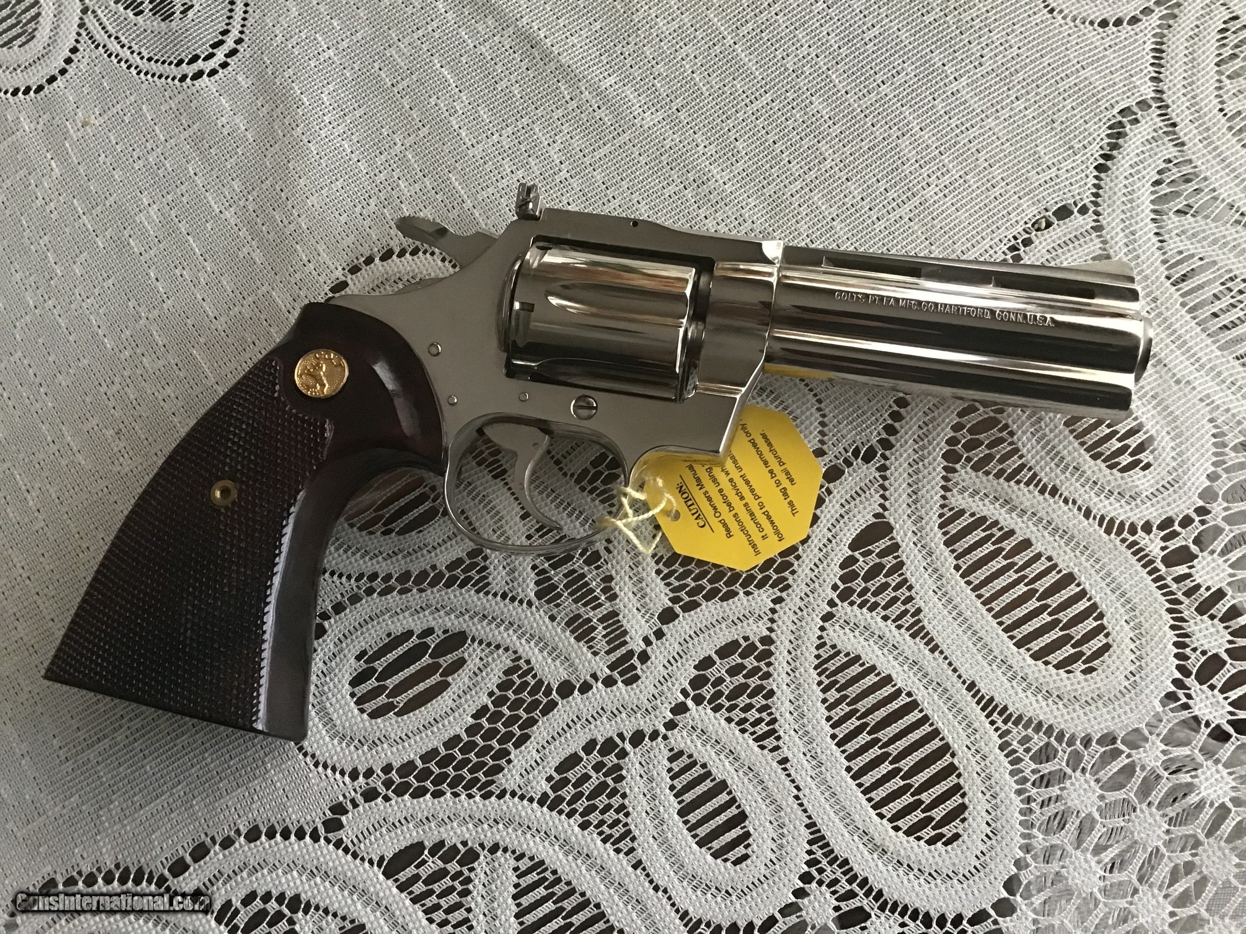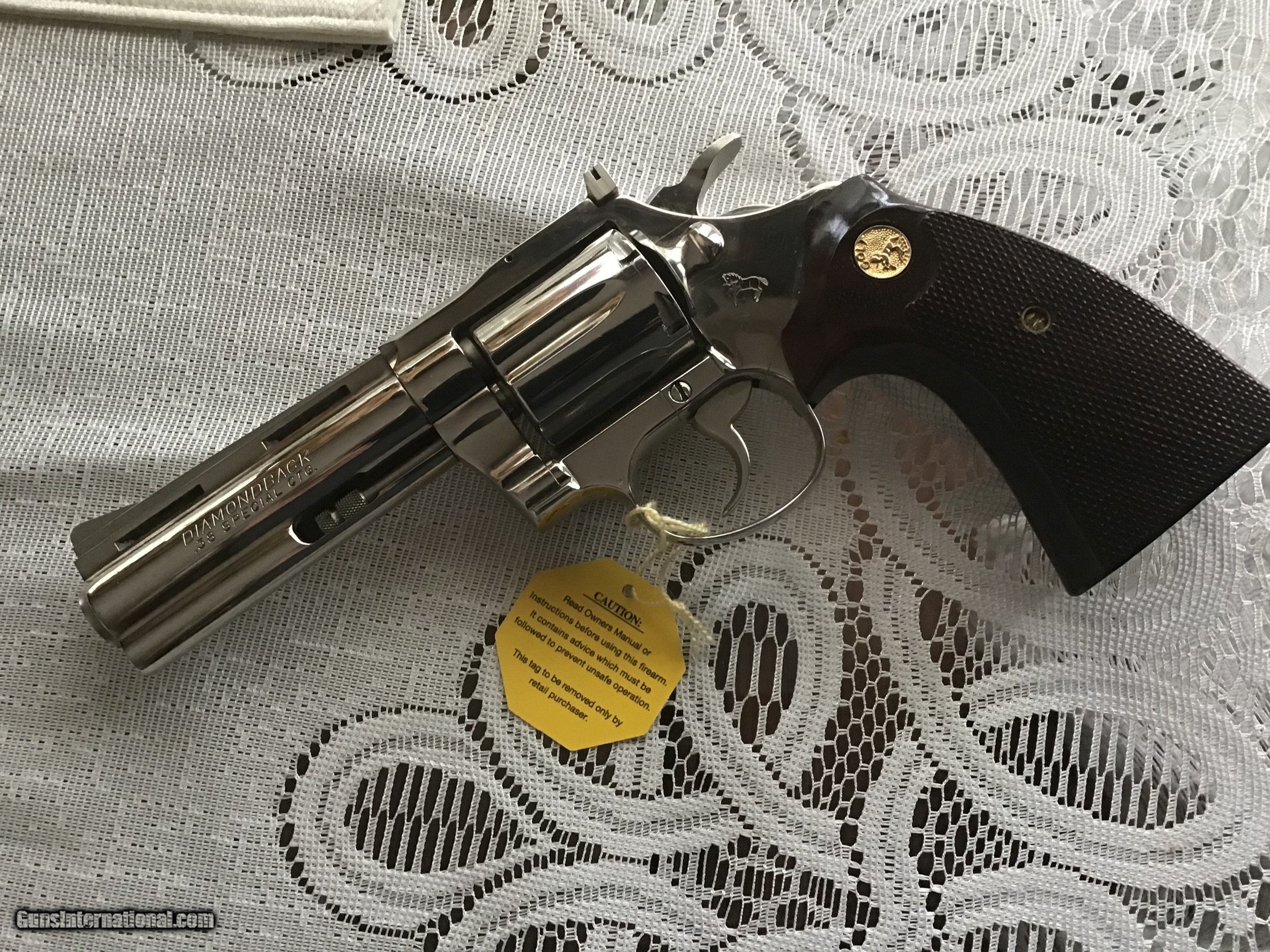 COLT DIAMONDBACK 38 SPC. 4” BRIGHT NICKEL, APPEARS UNFIRED, NO TURN RING, 100% COND. INTHE BOX