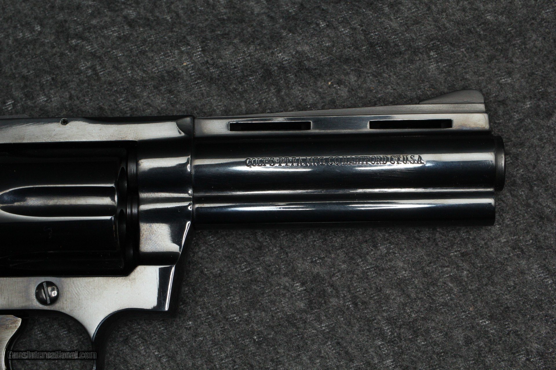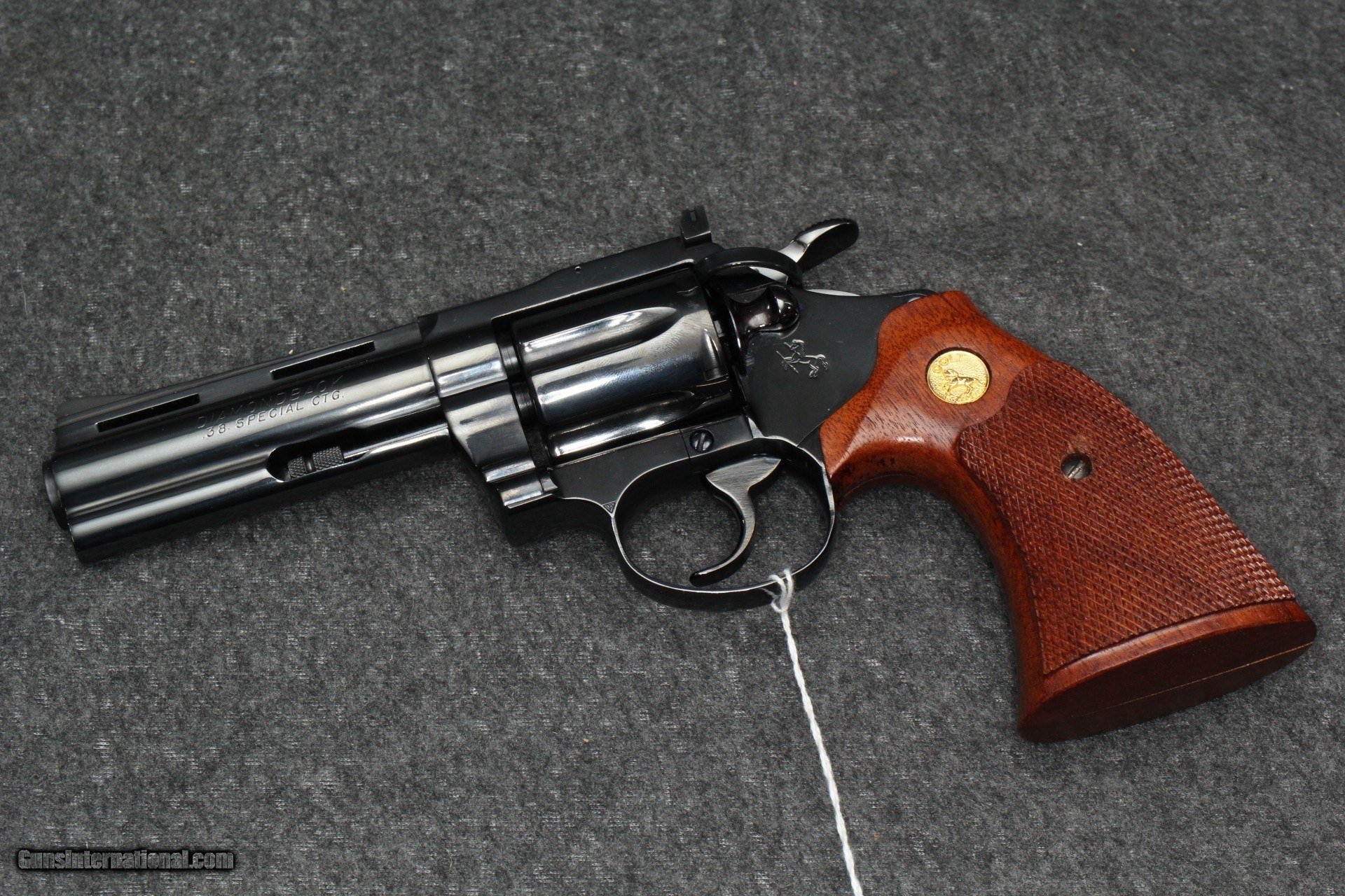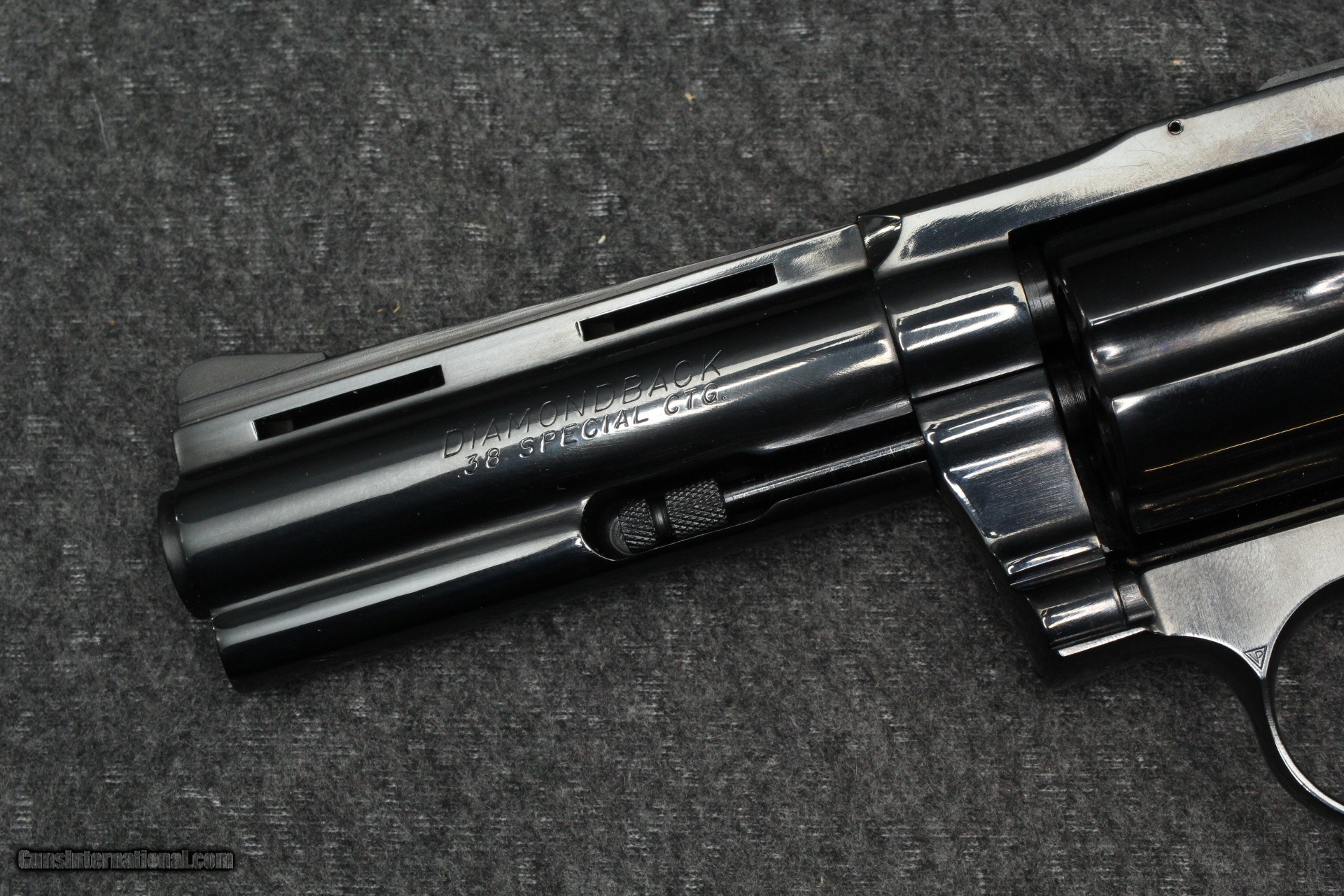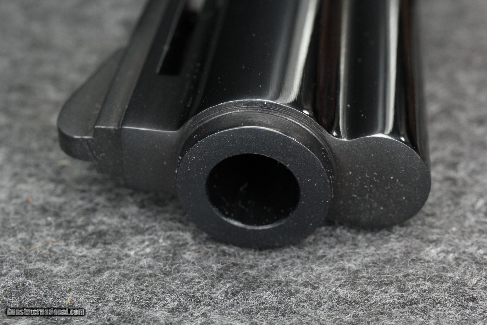 Description: 38 Spl, serial number D95XX, mfg 1968. 4" barrel, blue. Overall in excellent condition, possibly unfired. Very, very faint cylinder ring. Bore is excellent. Factory wood grips, excellent condition. Comes with correct, numbered box. More photos on request. Please add $55.00 for shipping and insurance. Will ship to C&R. SOLD Curio/Relic: Yes Handgun Caliber: .38 Special |