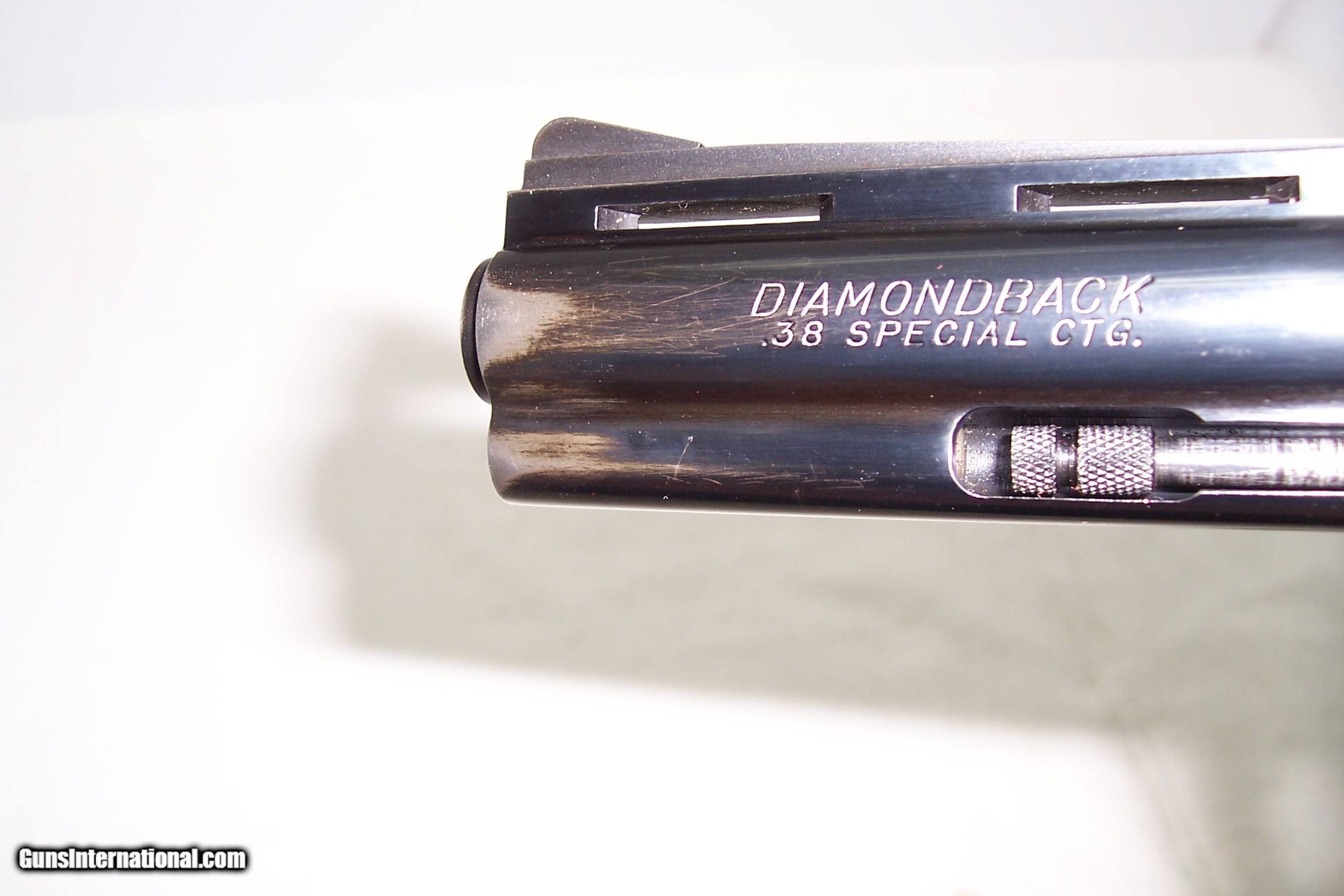 Description: A very nice Diamondback, 4 inch barrel in 38 spl, blue finish, has some holster wear on end of barrel and on cylinder. A 1975 one owner Colt. The right side of grip has a slight crack that has been repaired. Gun is in excellent shape, locks tight and functions great. Layed around in holster, used some but not abused. Serial number D70xxx call or email any questions. SOLD Manufacturer: Colt Model: Diamondback Serial Number: D70xxx Caliber Info: 38 special Bore: excellent Condition: Very good Metal Condition: Some wear Wood Condition: slight crack(repaired) Barrels: 4 inch Action: perfect |