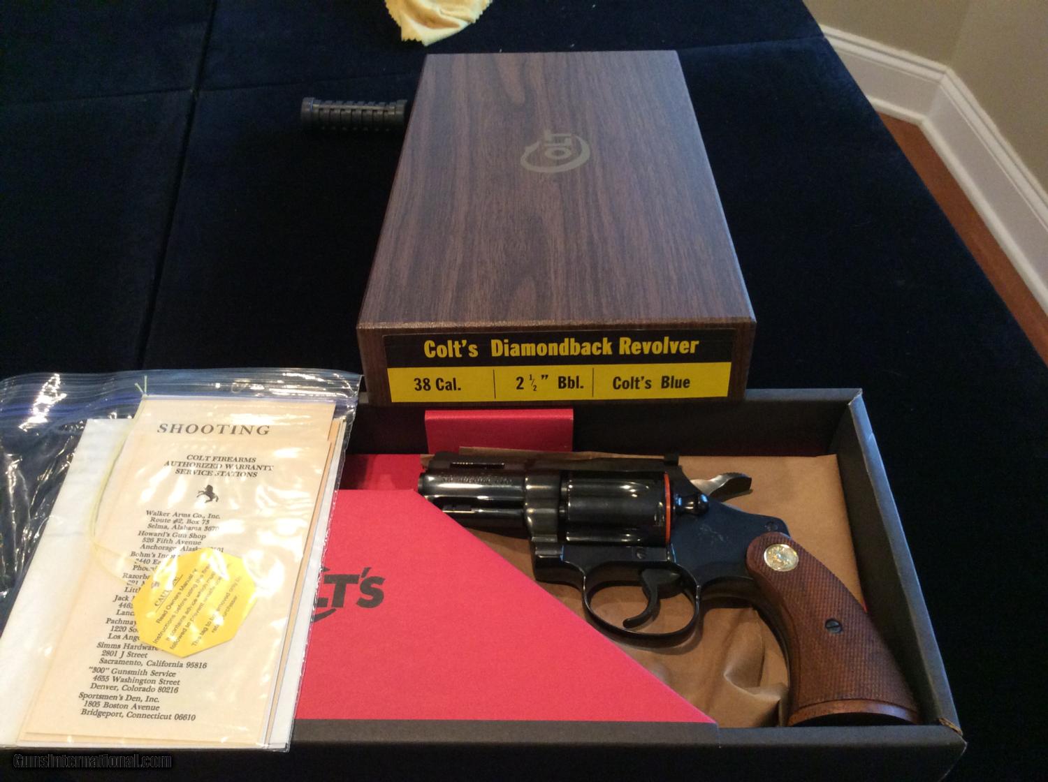 Description: <<<SOLD>>>Colt Diamondback 2-1/2” Blue Up for sale is this gorgeous 2-1/2 inch Diamondback chambered in .38 Special with an outstanding blue finish. It comes with adjustable rear sight, pinned front & rear sight and ventilated rib. This snake is 98+% .Pictures do not do this piece justice. The box is not original to the gun. I cannot say enough about this piece. It is beautiful. I could find no evidence that this one has been fired. The turn line would suggest as well that it has not. This piece in an original box would go for $500-$600 more. Please know your state laws. This firearm will ship FFL to FFL only. Shipping is $40 insured. Payment is due within 5 business days. Money Orders, Postal preferred, certified bank checks or personal checks only. All payments will need to clear prior to shipping so allow ten business days once funds are received. SOLD Manufacturer: Colt Model: Diamondback Caliber Info: .38 Special Condition: EX Metal Condition: EX Wood Condition: EX Bore Condition: EX |