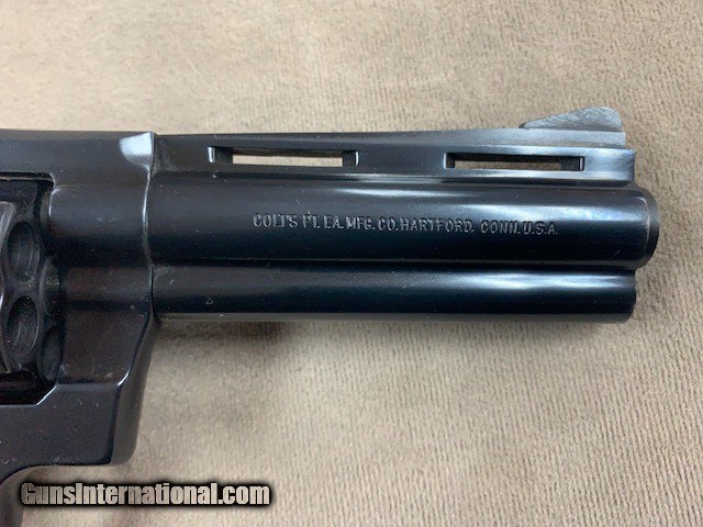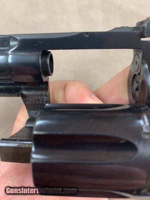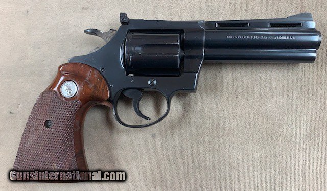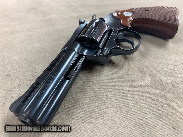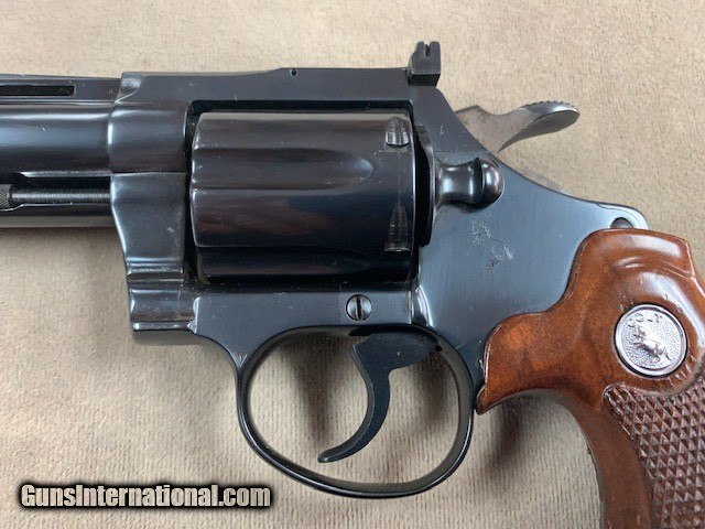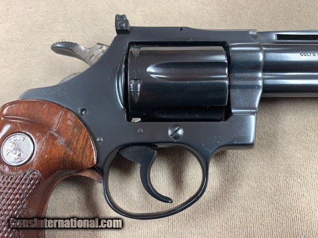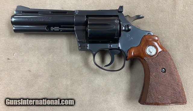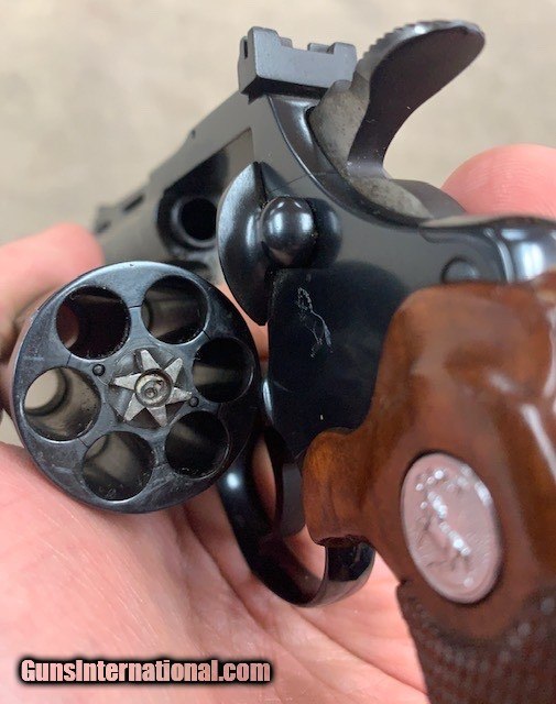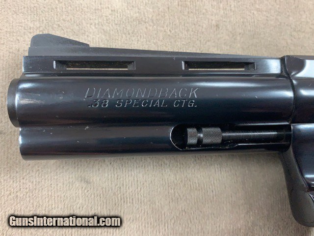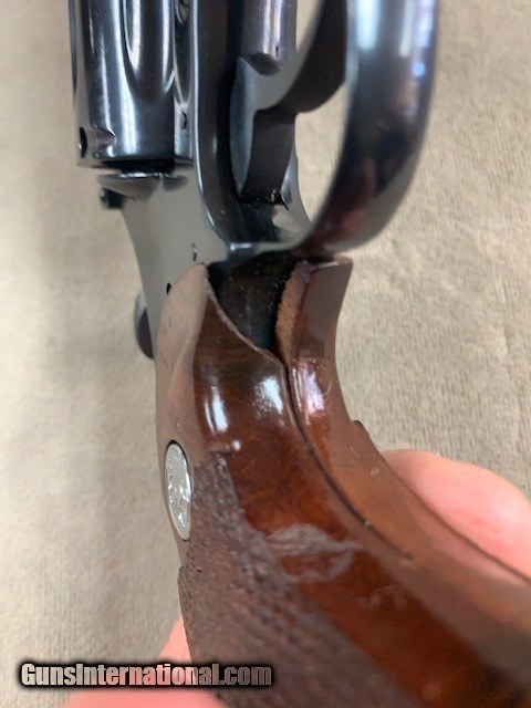 Description: A very nice Colt .38 Special Diamondback with 4 inch barrel in original blued finish manufactured in 1975. Revolver retains 98% of original blued finish with only the slightest of holster wear at the muzzle. Bore and chambers are perfect. Original walnut grips have a dent on the right panel along with a crack that is repairable, and there is a chip missing (see photo) but they are the correct grips for the revolver. SOLD |