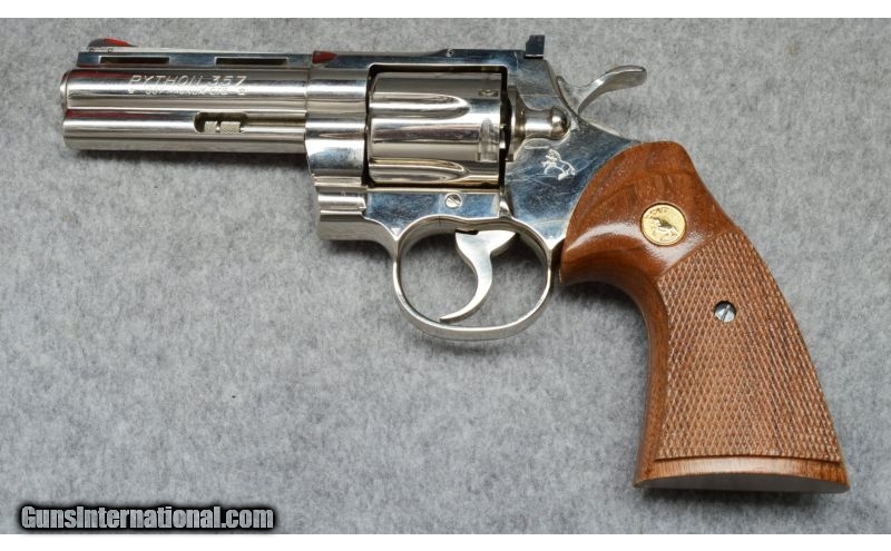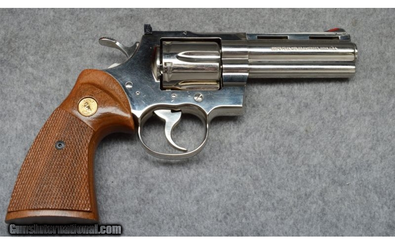 Description: SOLD Caliber Info: .38 Special Metal Condition: Good nickel finish with some scratches. Wood Condition: Good condition with normal handling marks. Bore Condition: Shiny with good rifling. Barrels: 4 Stock: Checkered Colt walnut grips. Weight: 29-ozs. Sights: Front blade and adjustable rear blade. Item Location: Fort Worth, TX |