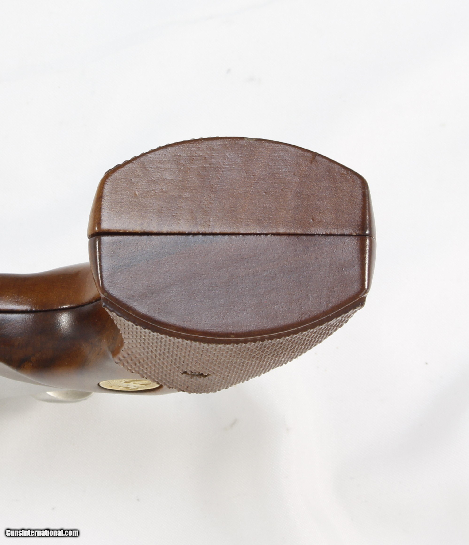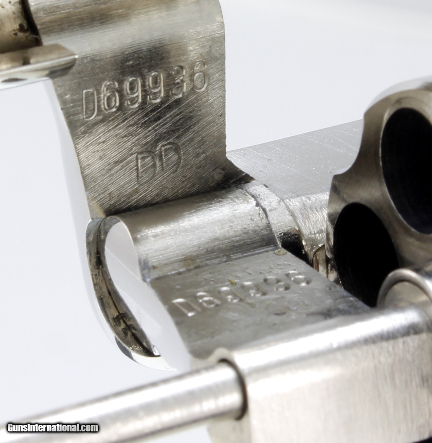 Description: Colt Diamondback Nickel Plated Revolver in .38 Spl. SN #D69936. Mfg. in 1975. 4" Vent Rib Barrel with an EXCELLENT Bright Bore with STRONG RIFLING. The Nickel Plated Metal has some defects in the finish on the left side of the barrel and behind the hammer but the rest of the finish is in NICE shape. The Checkered Walnut Grips are in EXCELLENT condition. 6 shot capacity. Adjustable Sights. Weight: 1.74 lbs. Trigger Pull: 3 1/2 lbs. More photos available upon request. Ships to Lower 48 W/ Insurance $35.00. SOLD Handgun Caliber: .38 Special Manufacturer: Colt Model: Diamondback Serial Number: D69936 Barrel Length: 4 Condition: Excellent Metal Condition: Excellent Wood Condition: Excellent Bore Condition: Excellent Action: Double Action Finish: Nickel Weight: 1.74 lbs. Manufacture Date: 1975 |