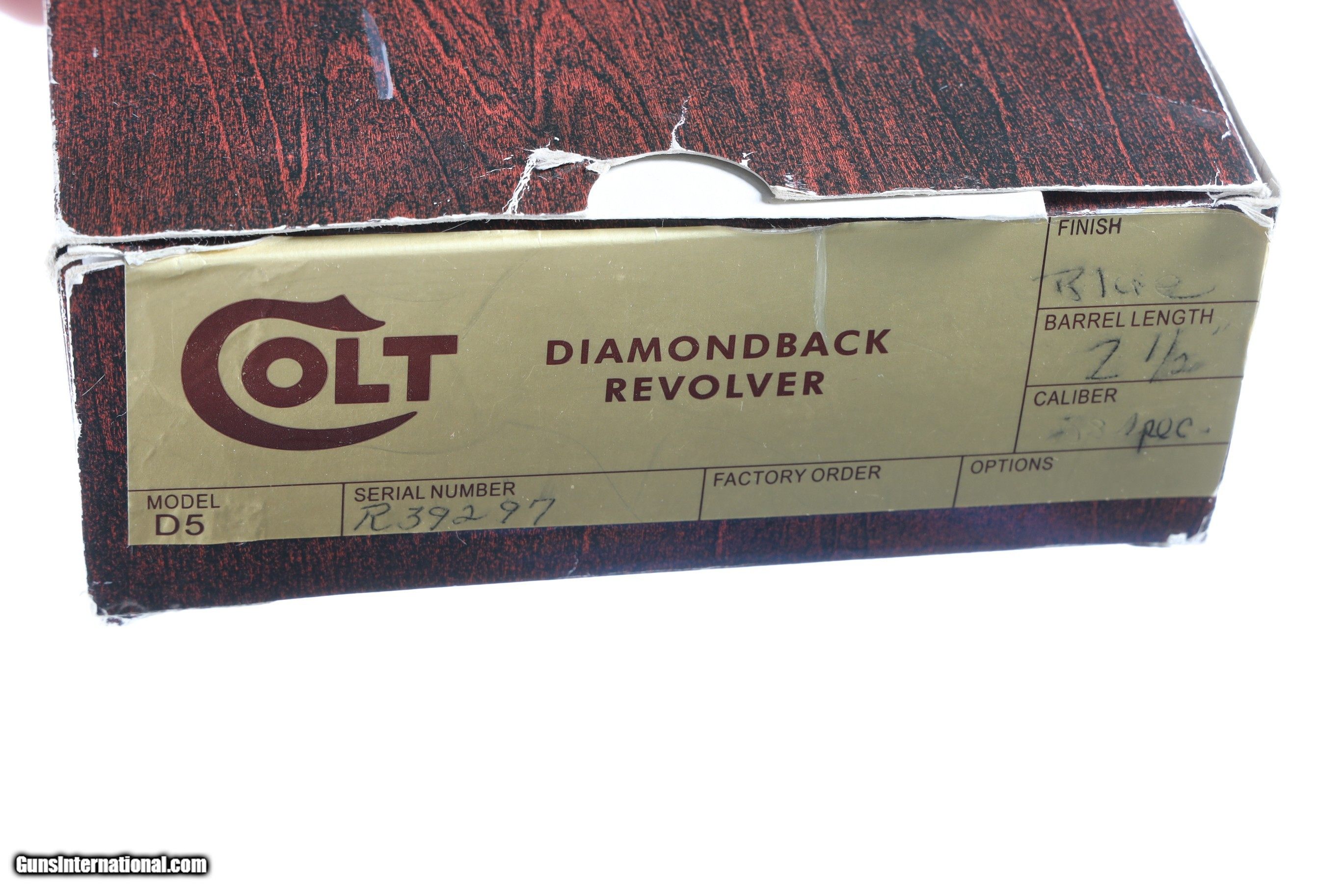 Description: Colt "D" Frame double action chambered for .38 Special. Diamondback Model with 2- 1/2" Bbl, blade front sight with adjustable rear sight. 6 shot fluted cylinder. Ventilated ribbed full lug barrel. Factory checkered walnut grips with gold Rampant Colt medallions. The 2-1/2" Barrel is the least common of production. Revolver remains in its Numbers matching factory box with full label. Condition, Excellent with revolver retaining 99% of its original factory blue finish with its only losses being a slight cylinder turn line. Grips are superb and without distress. Box is very good with full label. Mfg, 1978. mechanically excellent. • Free Shipping, No Credit Card Fees. • Lay-a-way available for this firearm. • 1/3 Down, a 1/3 in 30 Days, 1/3 in 60 Days. SOLD Handgun Caliber: .38 Special Manufacturer: Colt Model: Diamondback Serial Number: R39297 Barrel Length: 2 1/2 |