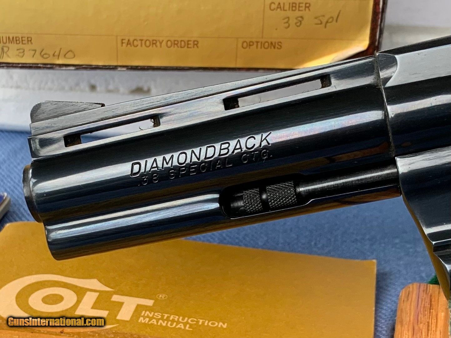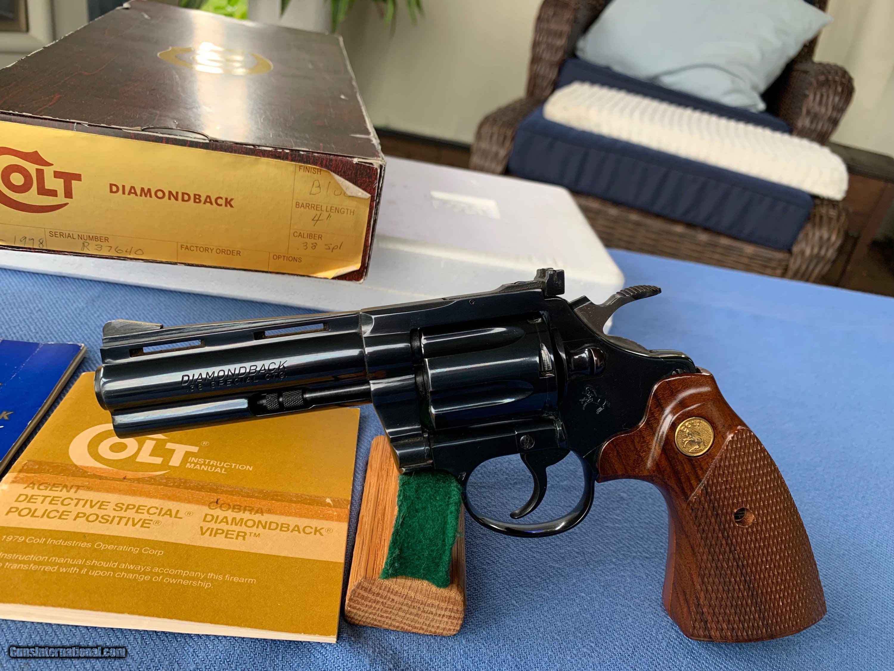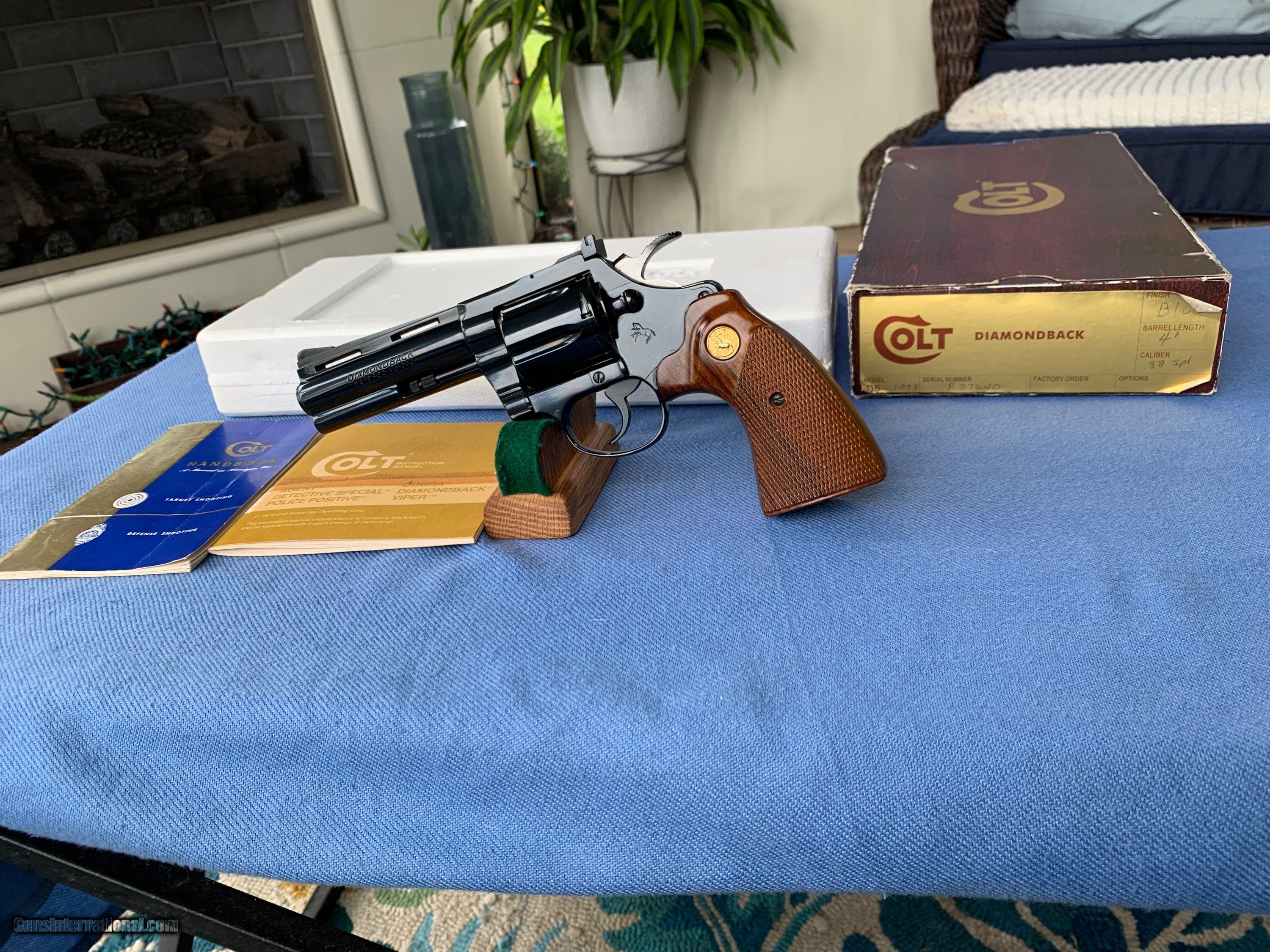 Description: Here's a Stunning example of a Snake Viper Series Colt Diamondback! Near mint example! Comes with manuals and original box . Serial number 37640 . 38 caliber. Shipped in Christmas 1978 ! Gun is like new and 110 % all original . There's a little edge wear on cylinder seen in photos other than that gun is near mint . Bore and mechanics are in excellent condition. Gun locks up tight and is in excellent working condition! Super nice Colt Diamondback! Rare 4" blue ! Please review my photos and please email me with any questions? 3 day inspection as allways! Thank you for looking , Little Jo SOLD Curio/Relic: Yes Handgun Caliber: .38 Special Manufacturer: Colt Model: Diamondback Serial Number: 37640 Condition: Mint |